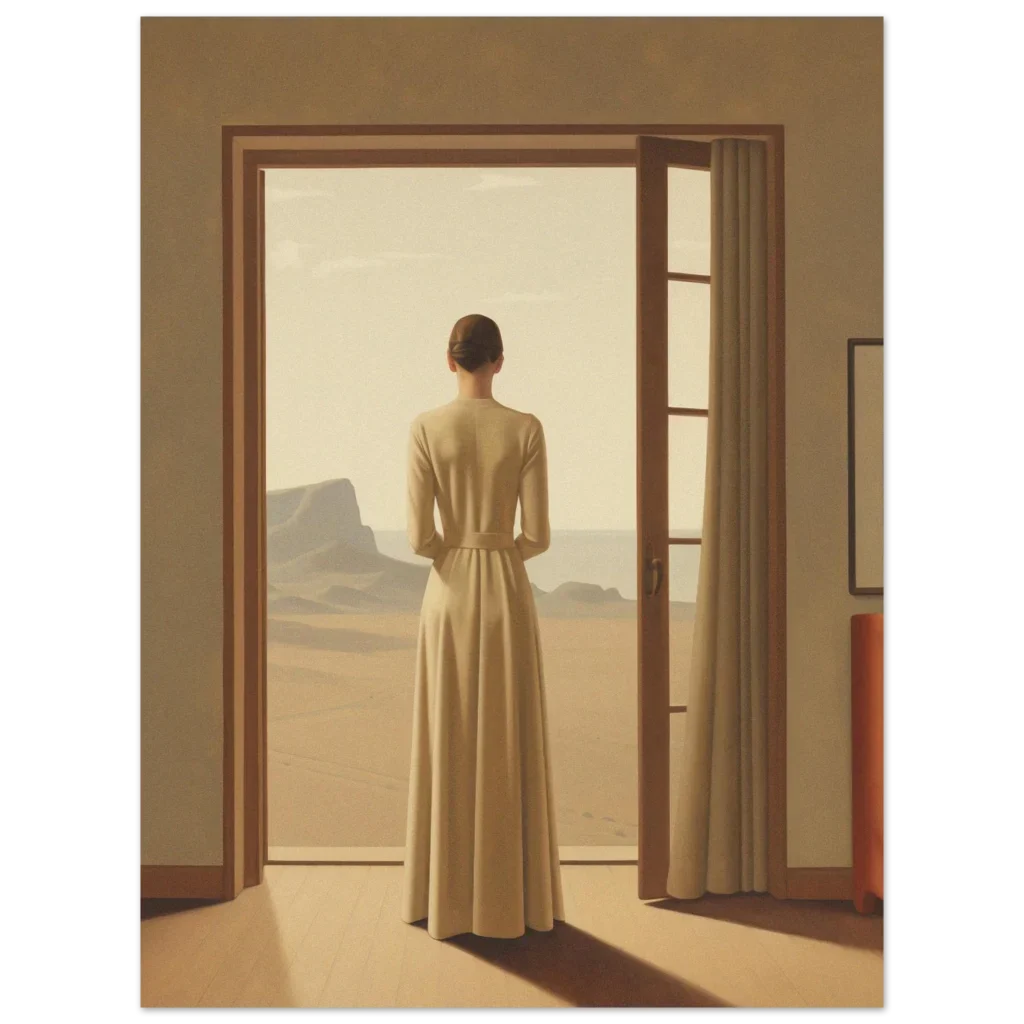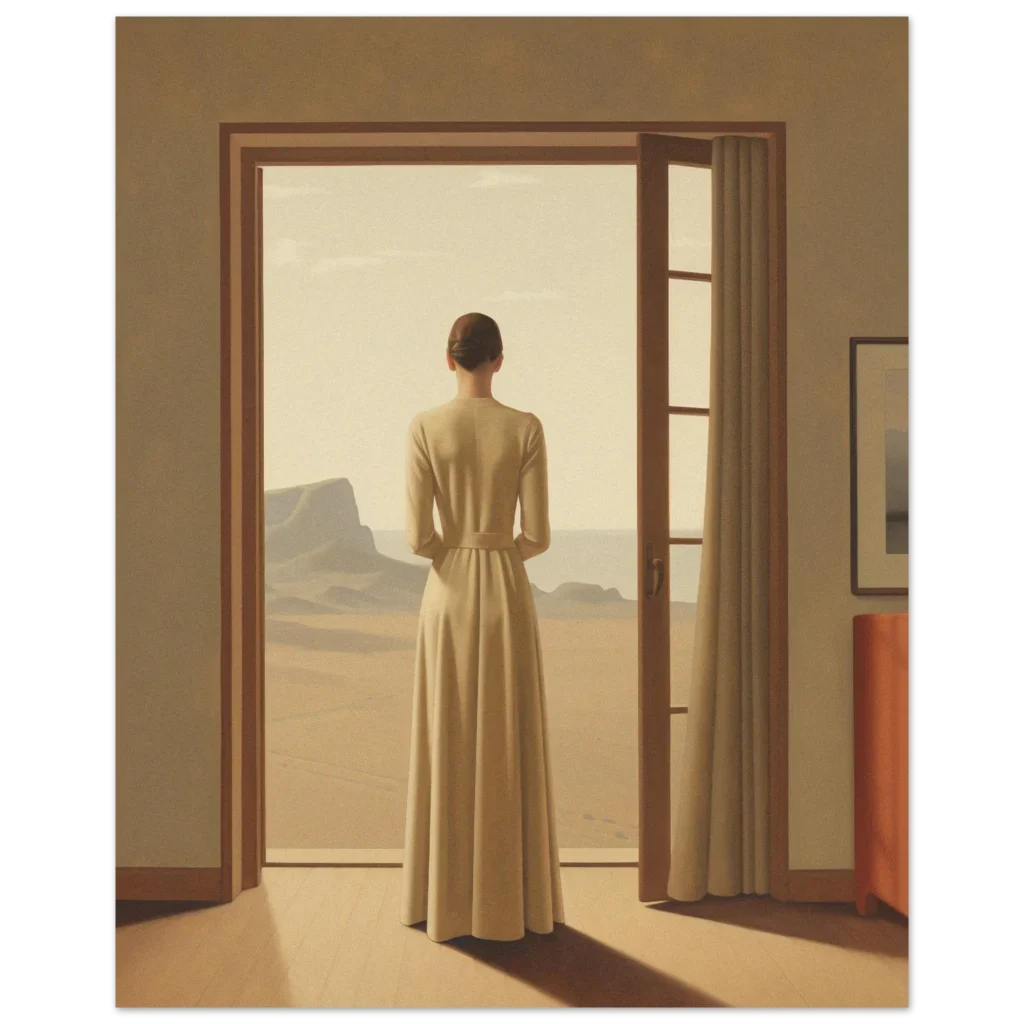 Capture a moment of tranquil contemplation with our ‘Desert Serenity’ poster. This artwork, with its soothing, warm sepia tones and minimalist elegance, invites introspection and calm into any space. The solitary figure gazing out over a vast, serene desert evokes a timeless sense of peace and wonder, making it a perfect statement piece for those who appreciate understated beauty and profound narratives.