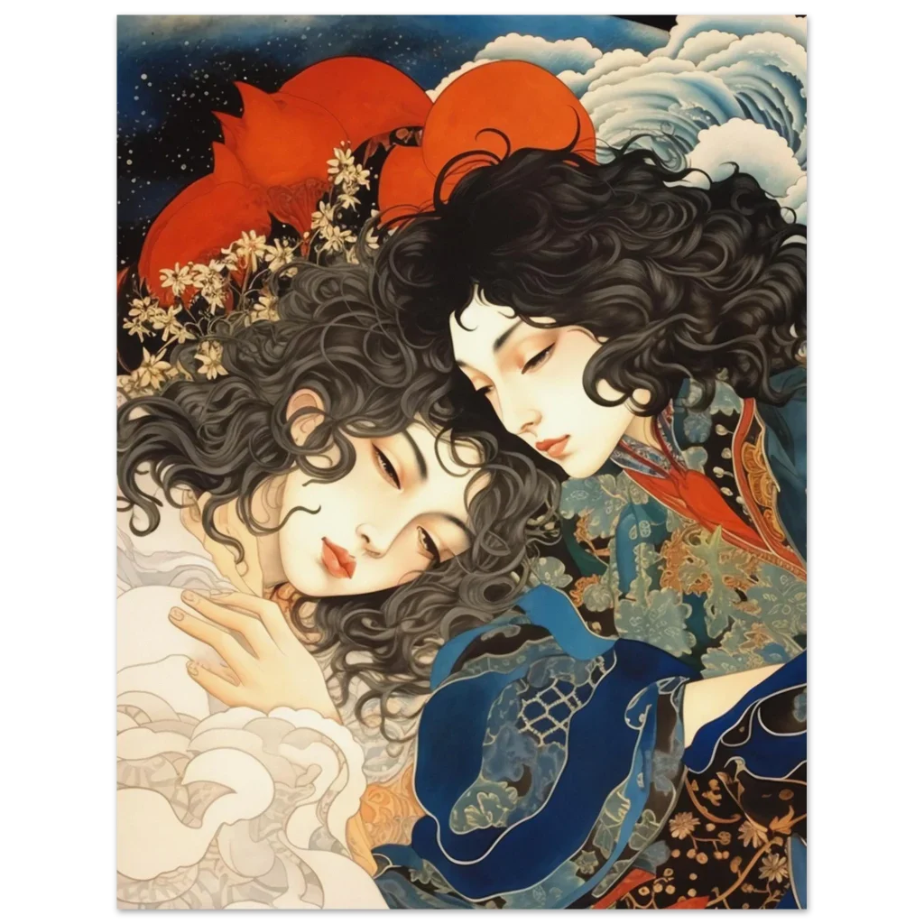 Immerse yourself in the serene beauty of ‘Dreaming Reverie,’ a captivating poster that evokes the tranquil elegance of Japanese art. Featuring two ethereal figures nestled amongst flowing patterns and deep, celestial blues, this piece brings a sense of calm and mystical allure to any space. The rich color palette, from deep indigo and vibrant coral to soft creams and gold accents, creates a luxurious and contemplative mood.