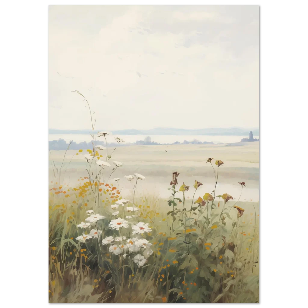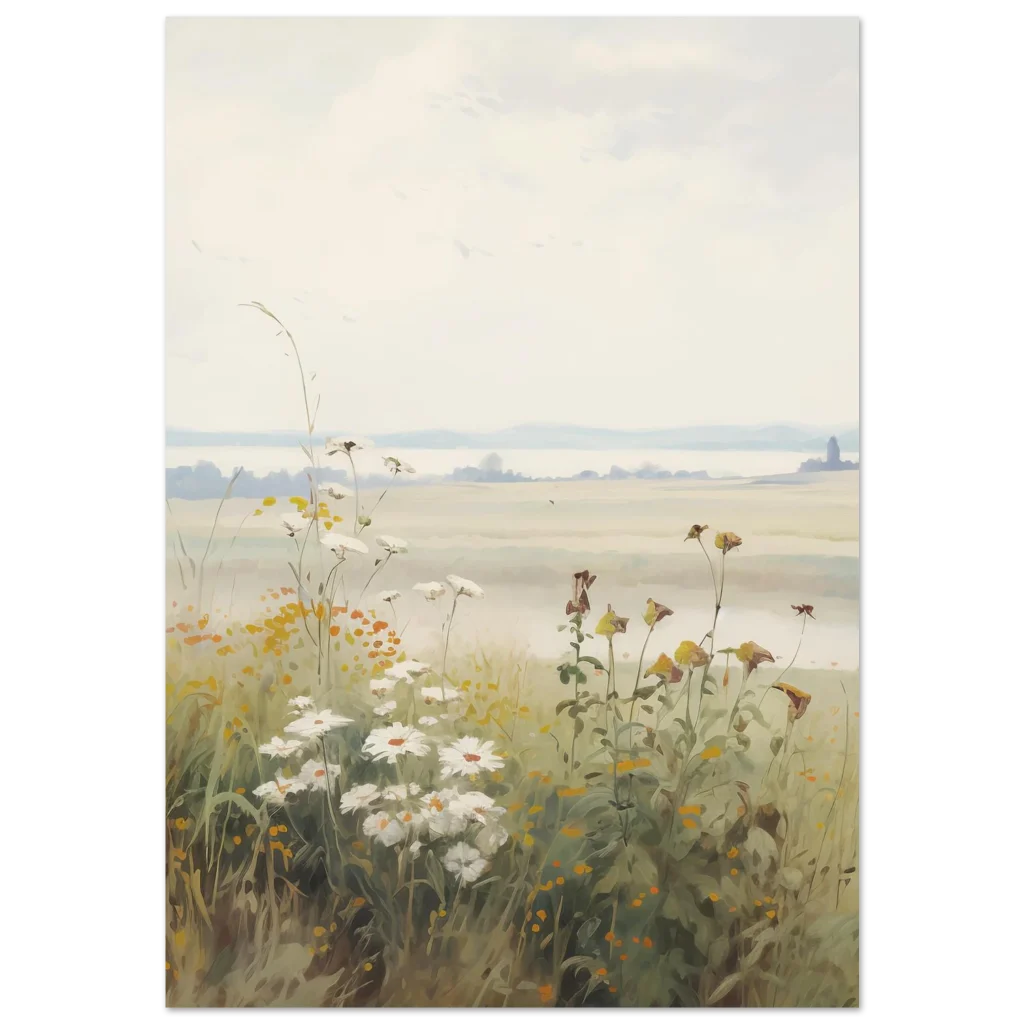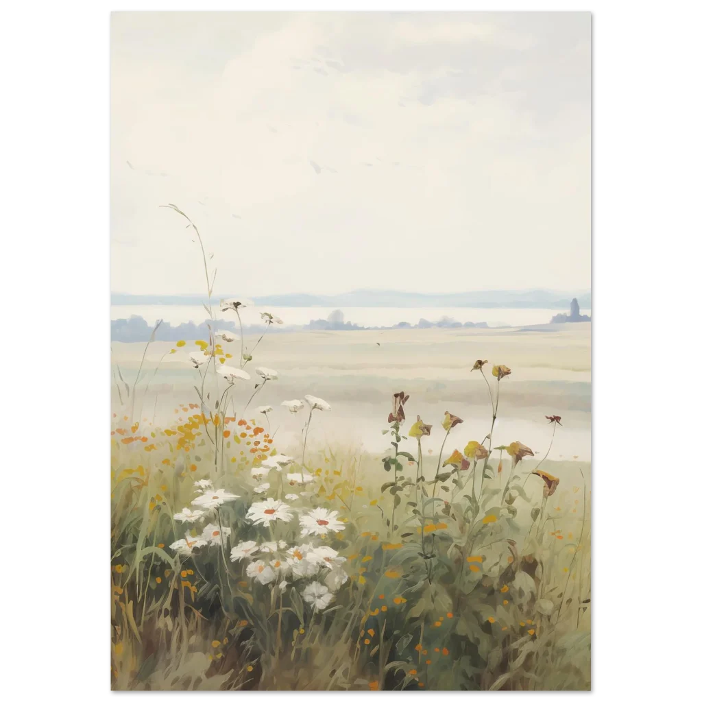 Capture the serene beauty of a peaceful morning with our Dreamy Meadow Morning poster. This enchanting artwork, inspired by soft, natural hues and delicate wildflowers, brings a calming touch to any space. Imagine waking up to a misty field, where the first light gently illuminates daisies and wild grasses, creating an atmosphere of tranquility and gentle awakening.