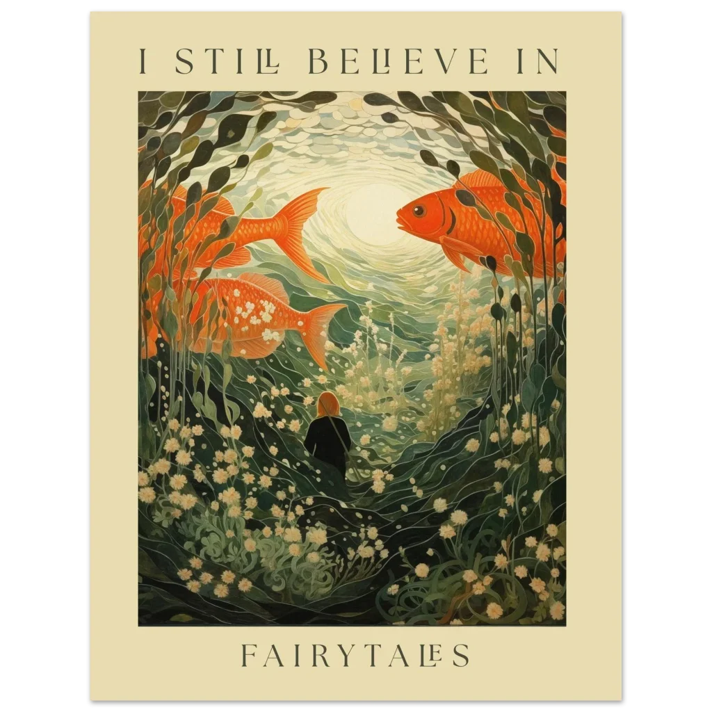 Enchanting Goldfish & Flowing Flora Art Print – ‘I Still Believe in Fairytales’ Premium Matte Poster