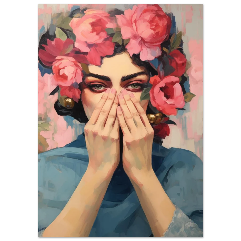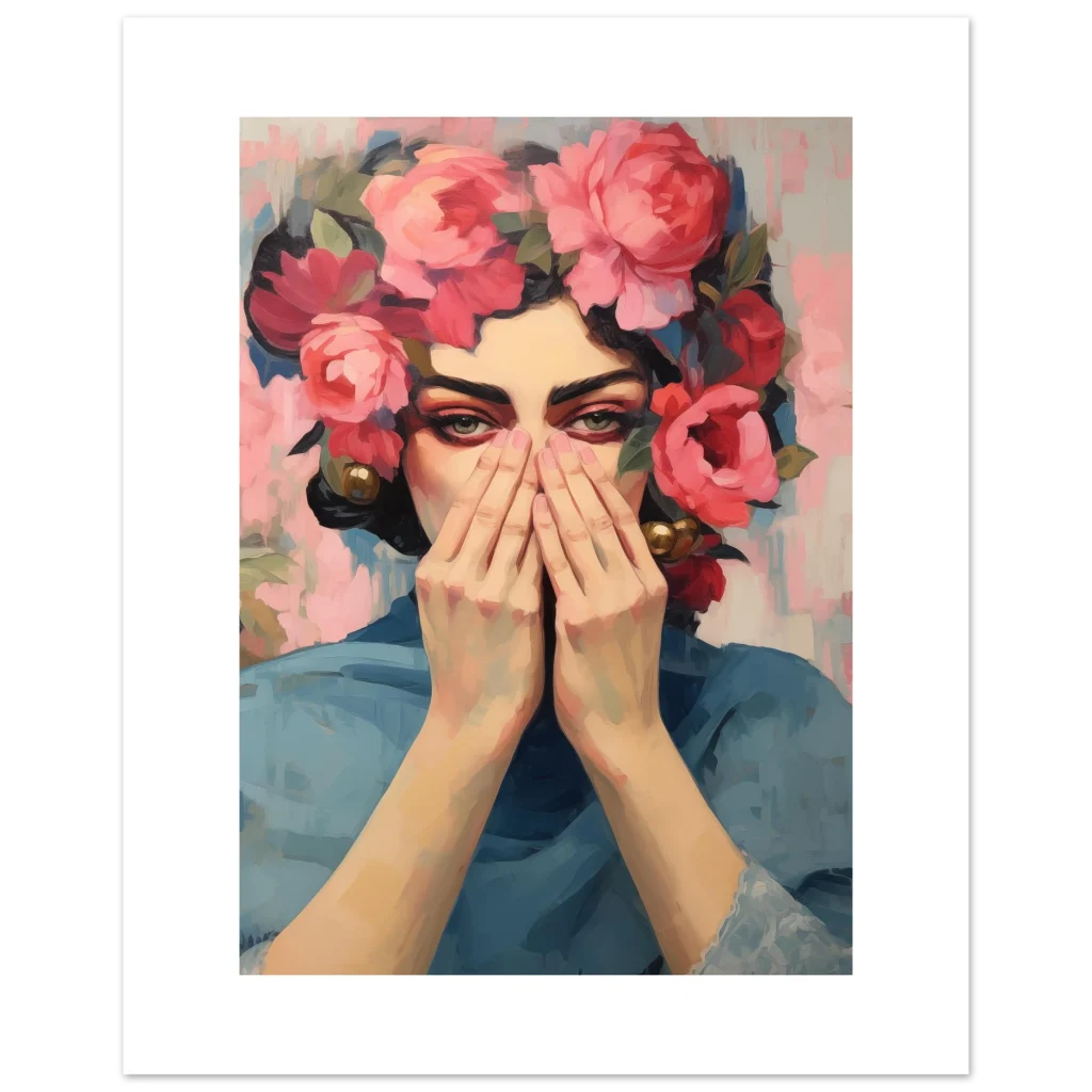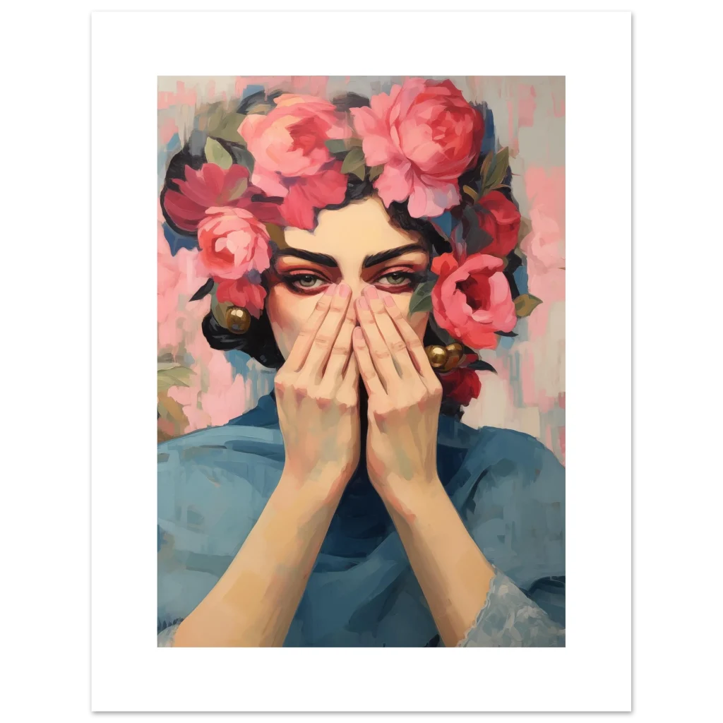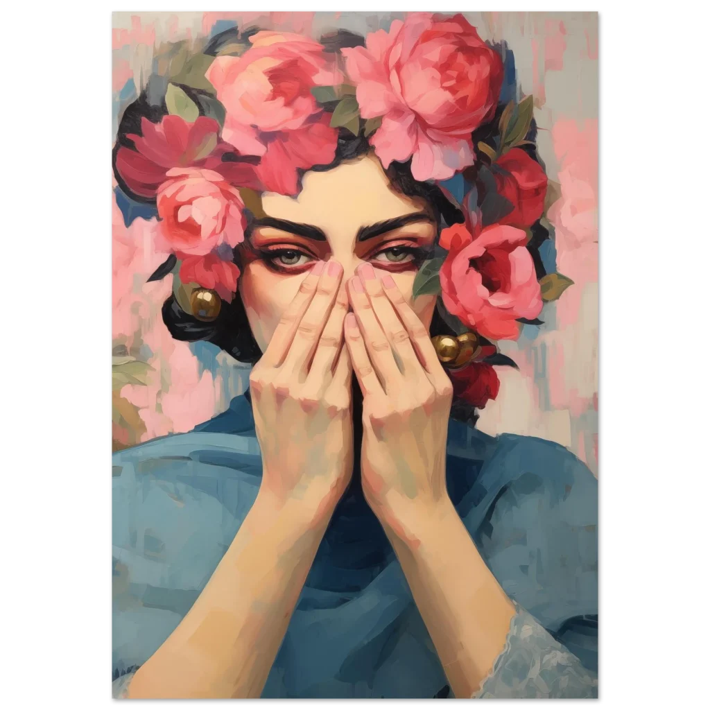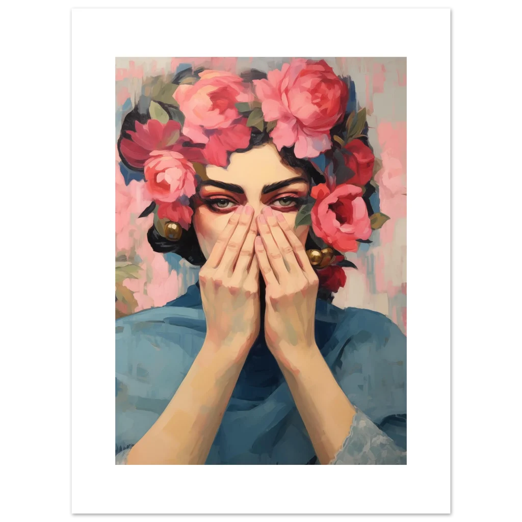 Unveil a captivating masterpiece for your walls with our Enigmatic Floral Beauty poster. This artwork, with its striking blend of rich pinks, deep reds, and serene blues, evokes a sense of mysterious elegance and timeless charm. The subject’s gaze, framed by a luxuriant crown of blossoms, draws you into a world where art and emotion intertwine.