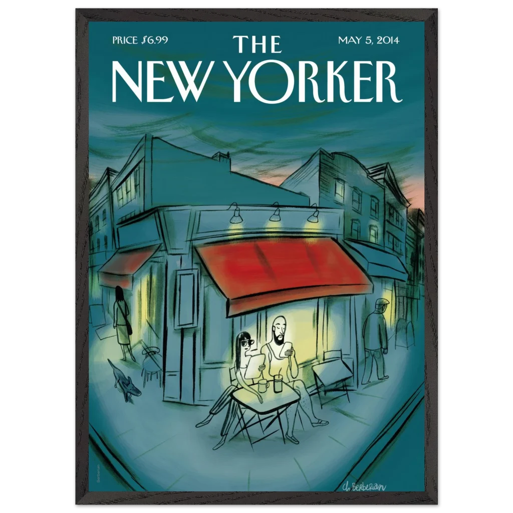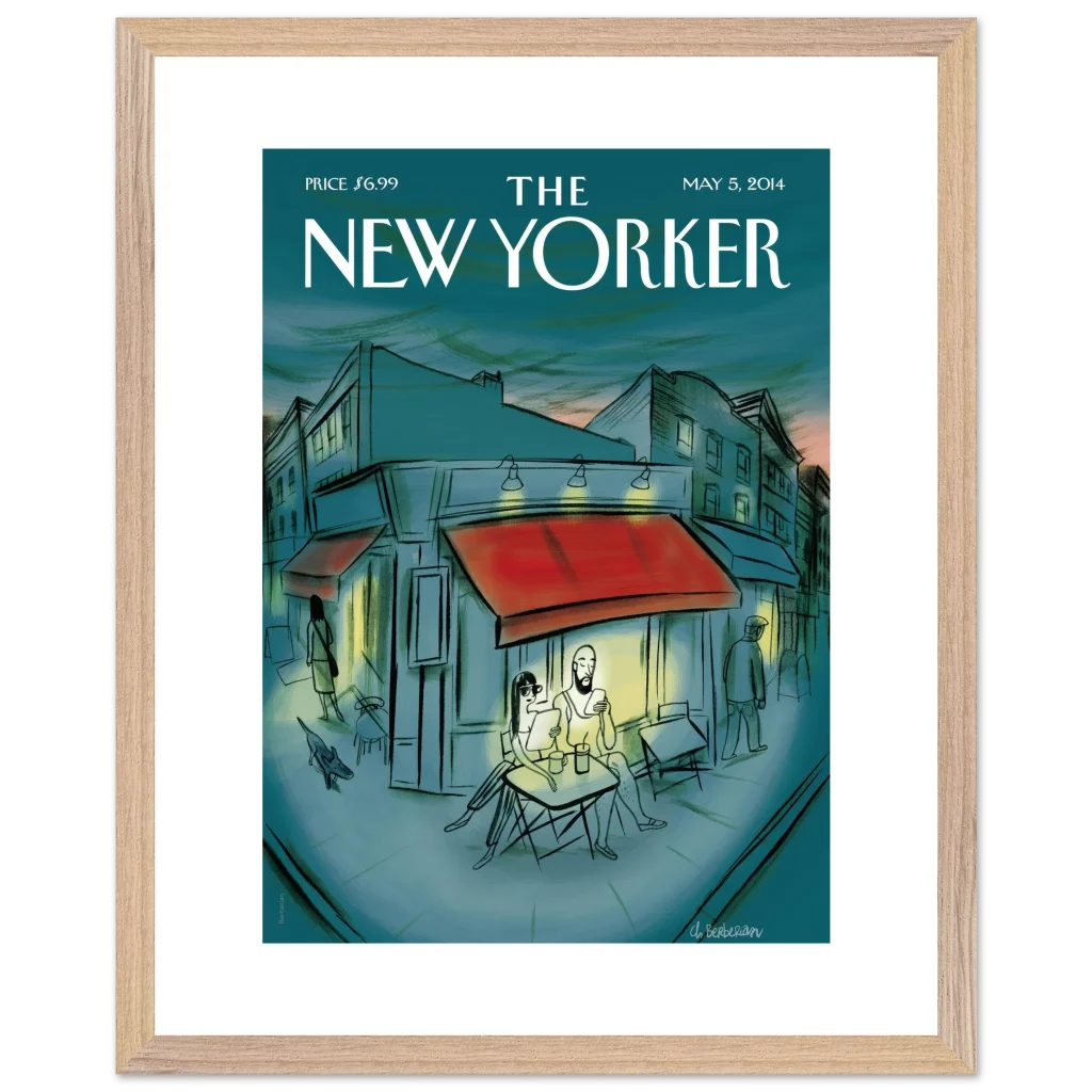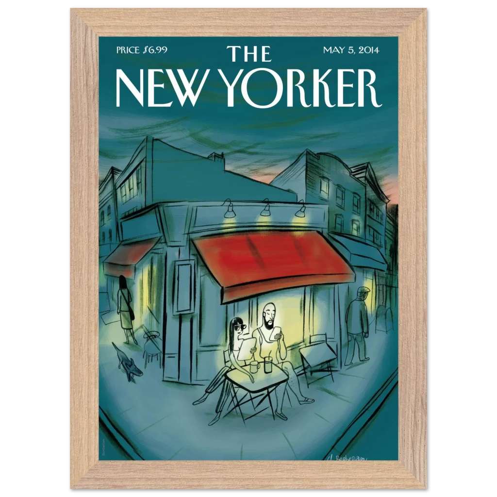 Evening Coffee Vibe Poster – Urban Cafe Scene Wall Art in Pop Art-Inspired Line Illustration with Premium Wooden Frame