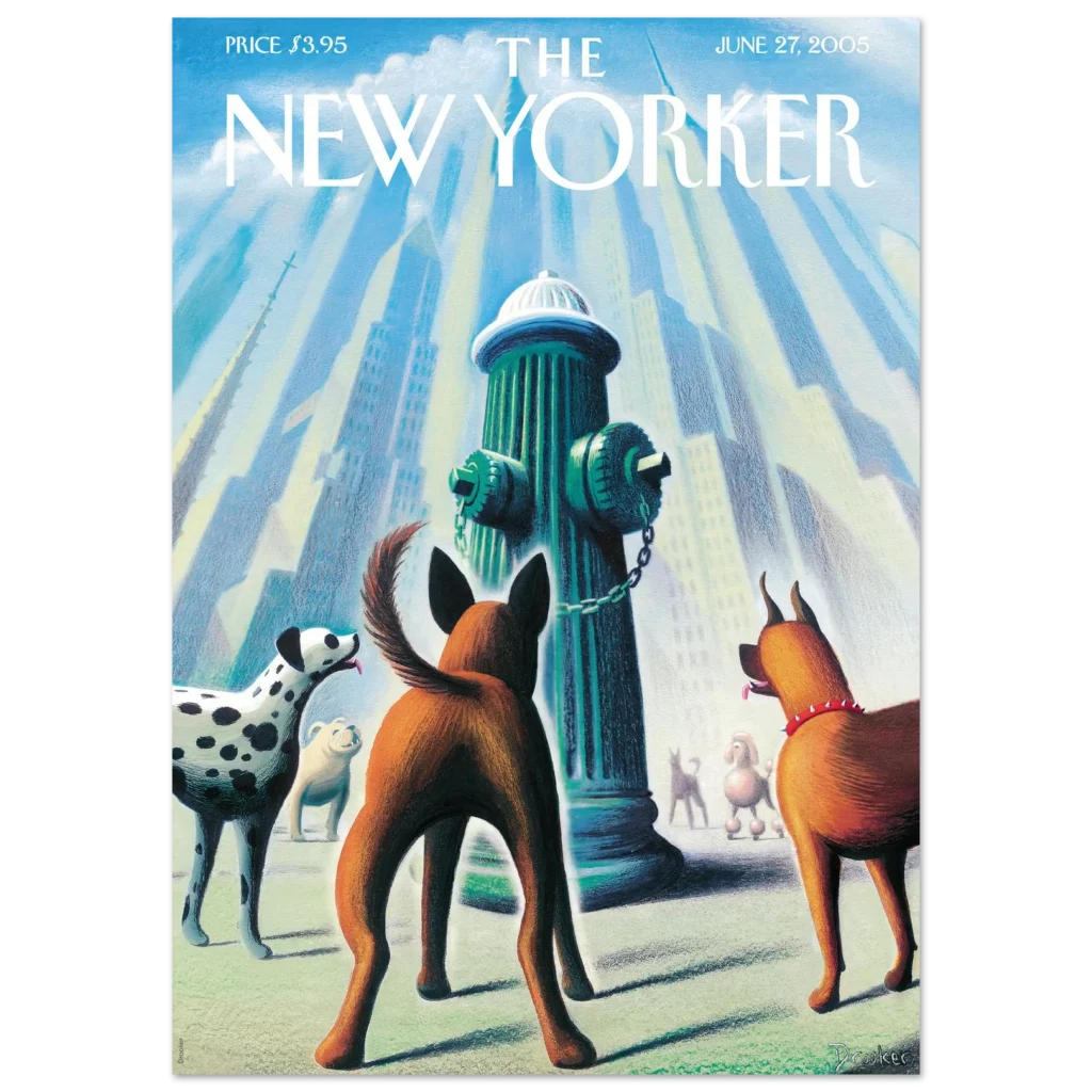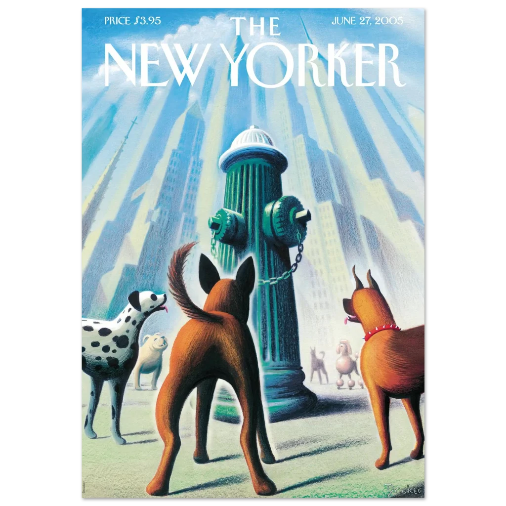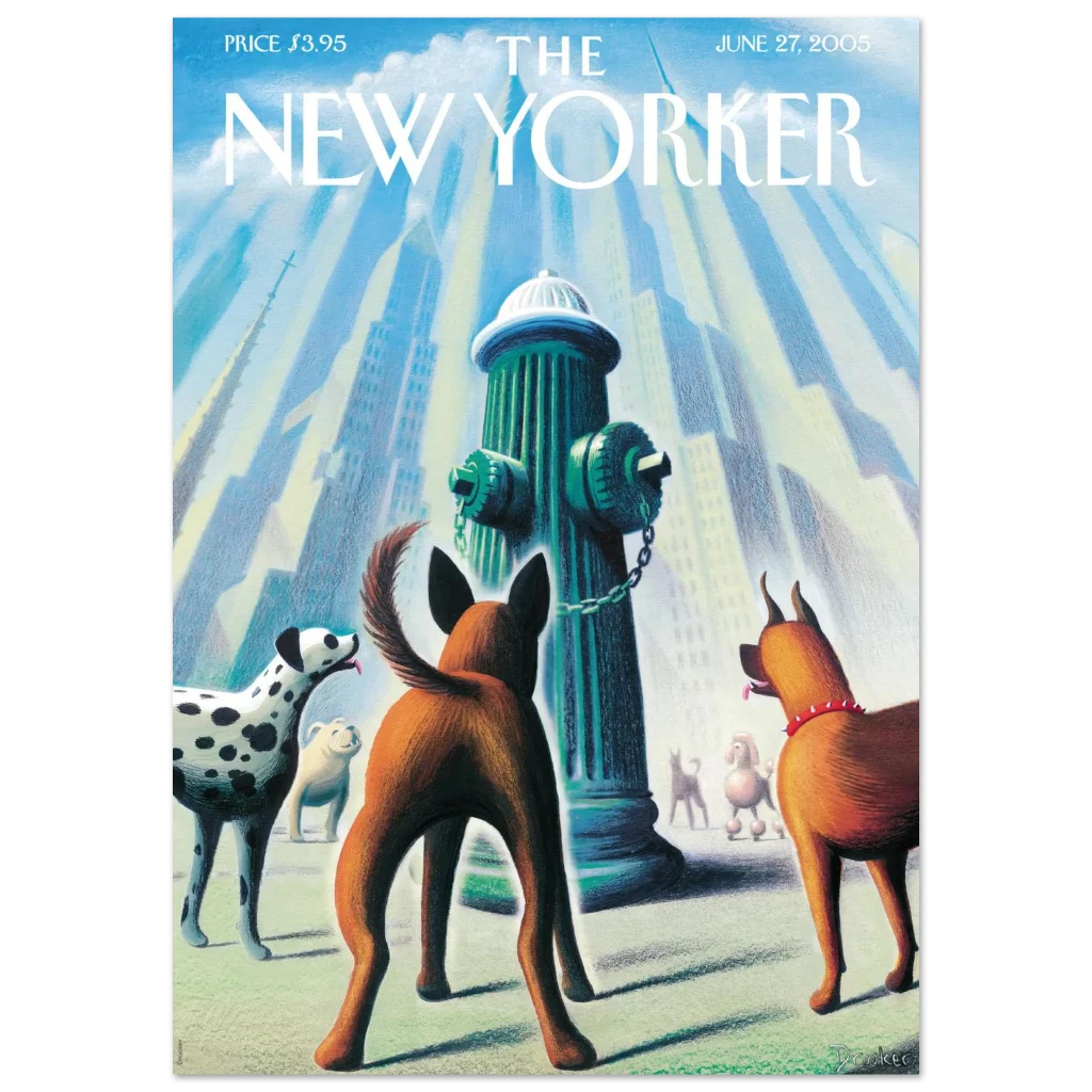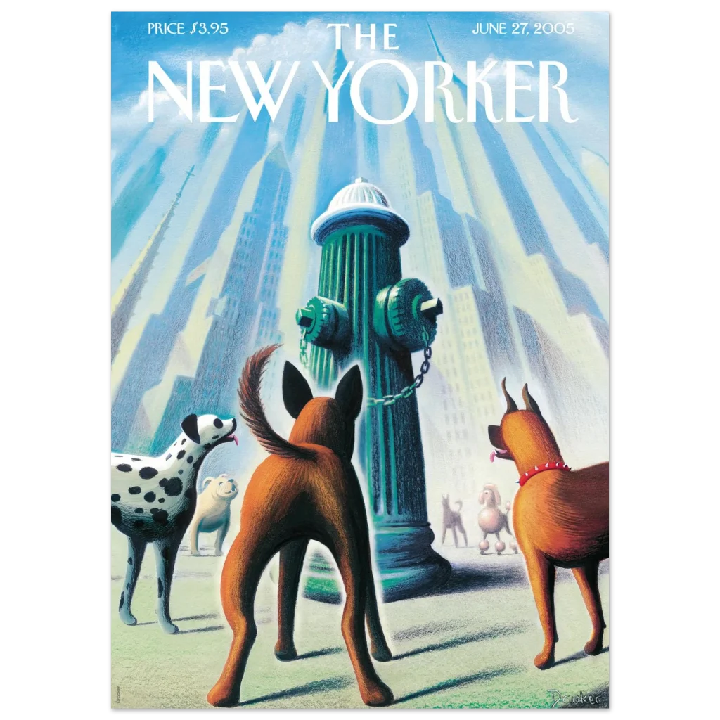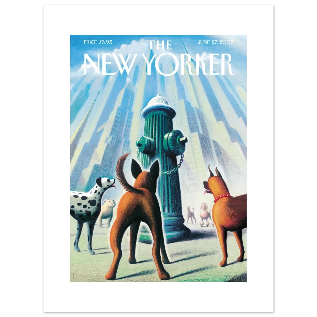 Bring a touch of whimsical city charm and canine delight to your space with this captivating art print, featuring a classic New Yorker cover. “Every Dog Has Its Day” captures a playful moment in the urban landscape, where a curious pack of pups gathers around a fire hydrant, bathed in a soft, ethereal light. This unique piece, with its delightful color palette and heartwarming subject, is perfect for dog lovers and those who appreciate iconic illustration.