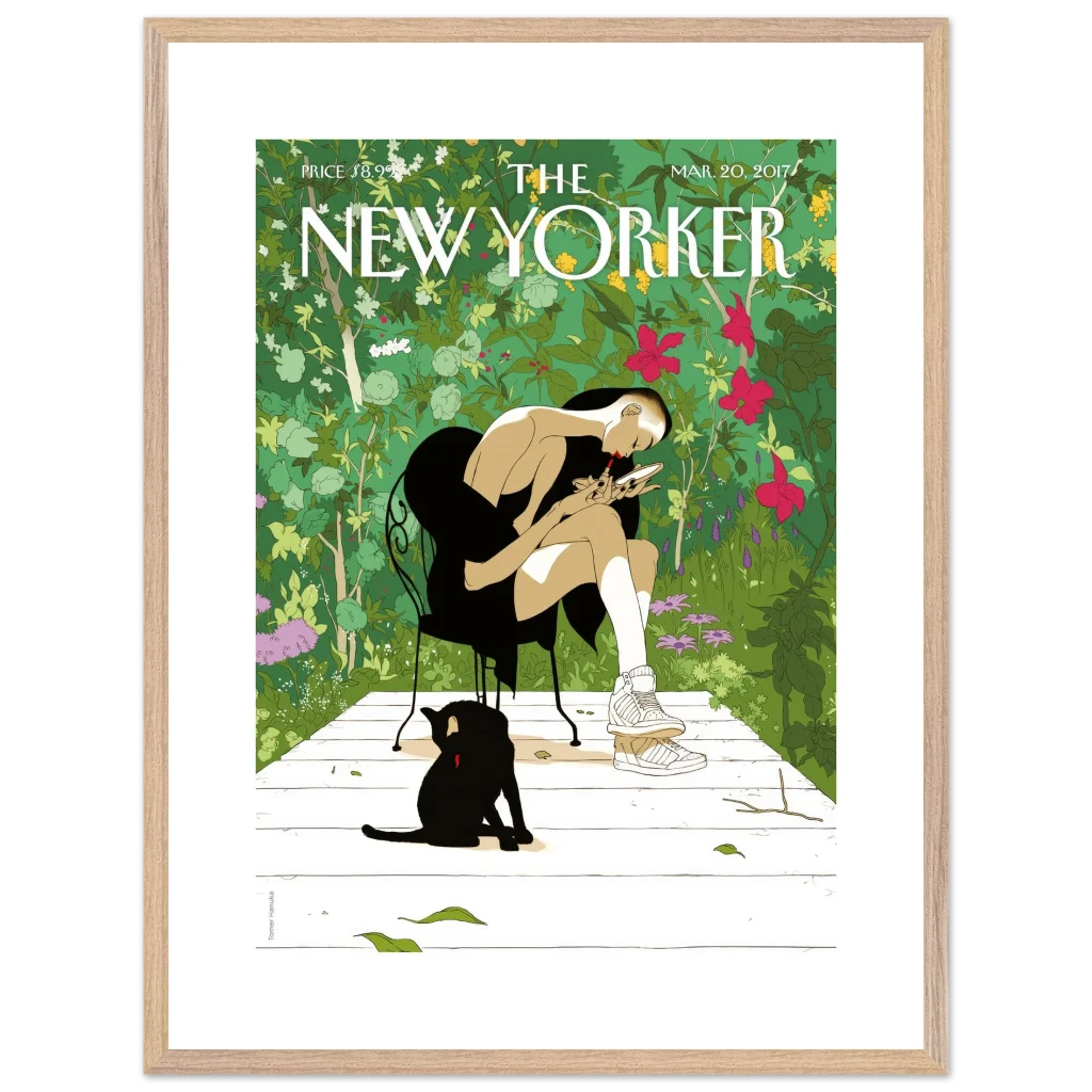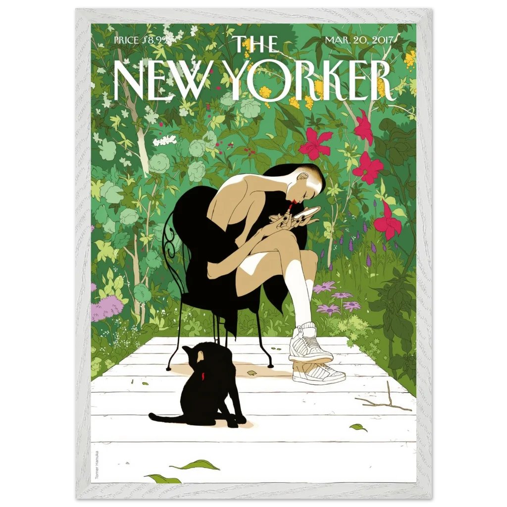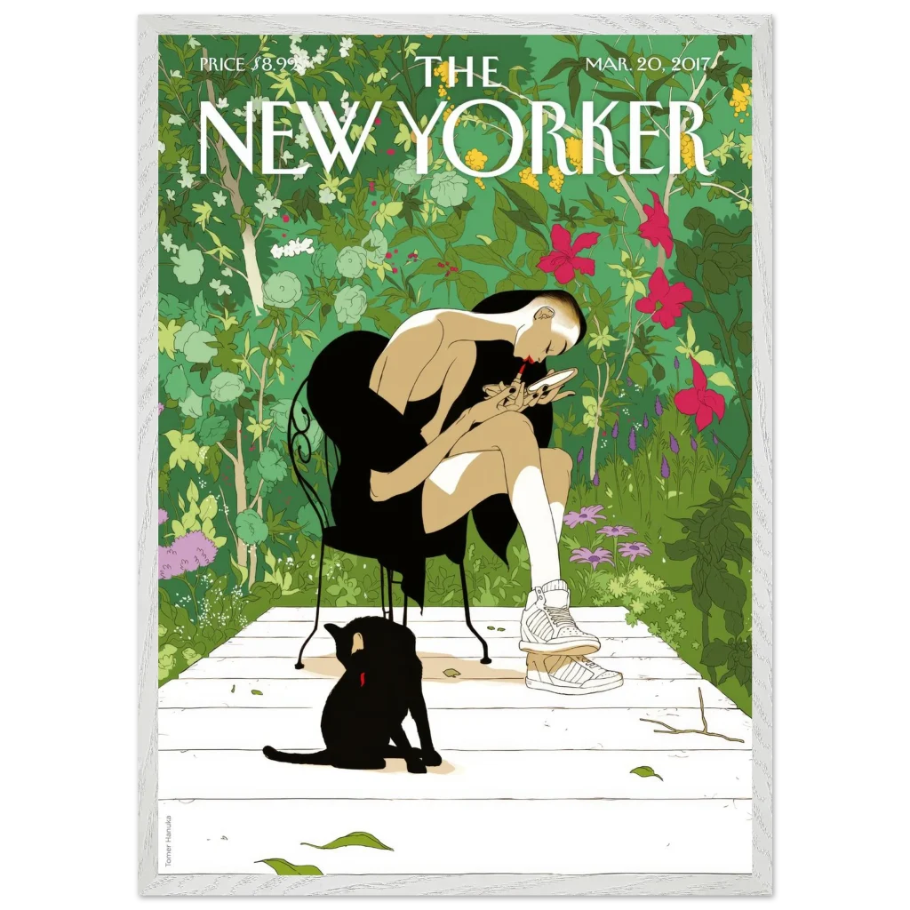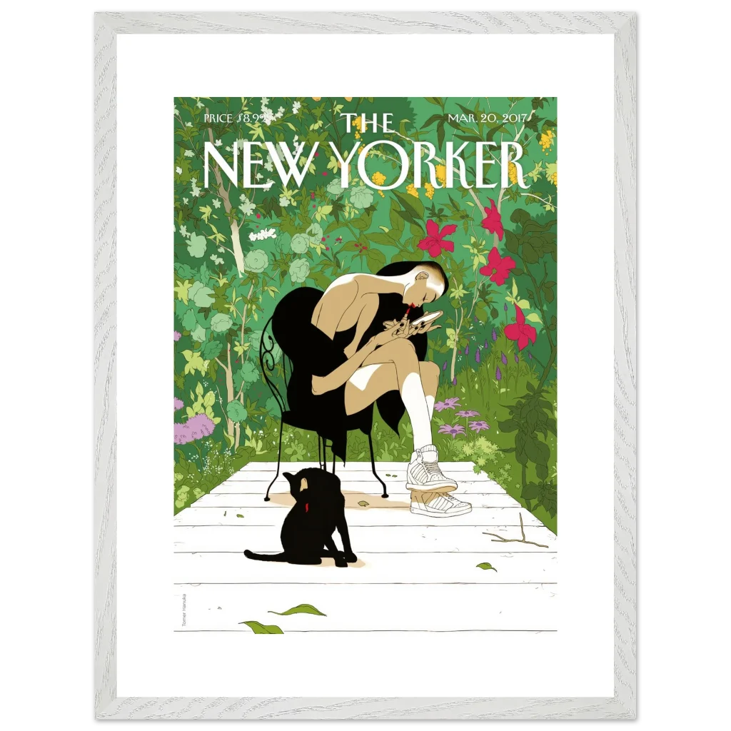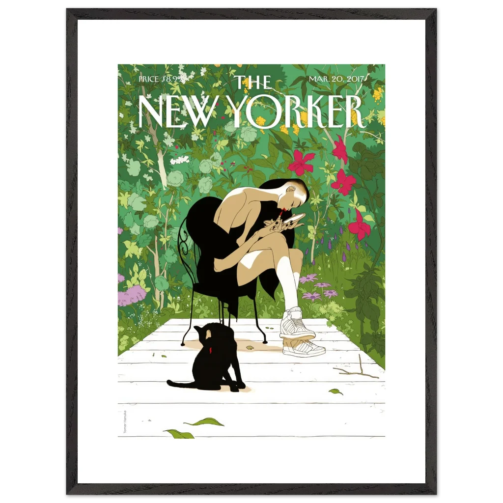 Capture a moment of quiet sophistication and vibrant nature with our “Garden Glamour” framed poster, featuring Tomer Hanuka’s iconic New Yorker cover art. This stunning piece, rich with lush greens and pops of pink, violet, and yellow, portrays a contemporary scene of serene beauty and subtle allure, perfect for adding a touch of modern elegance to any room. It’s more than just a print; it’s a conversation starter, inviting observers to appreciate the intricate details and the story within.