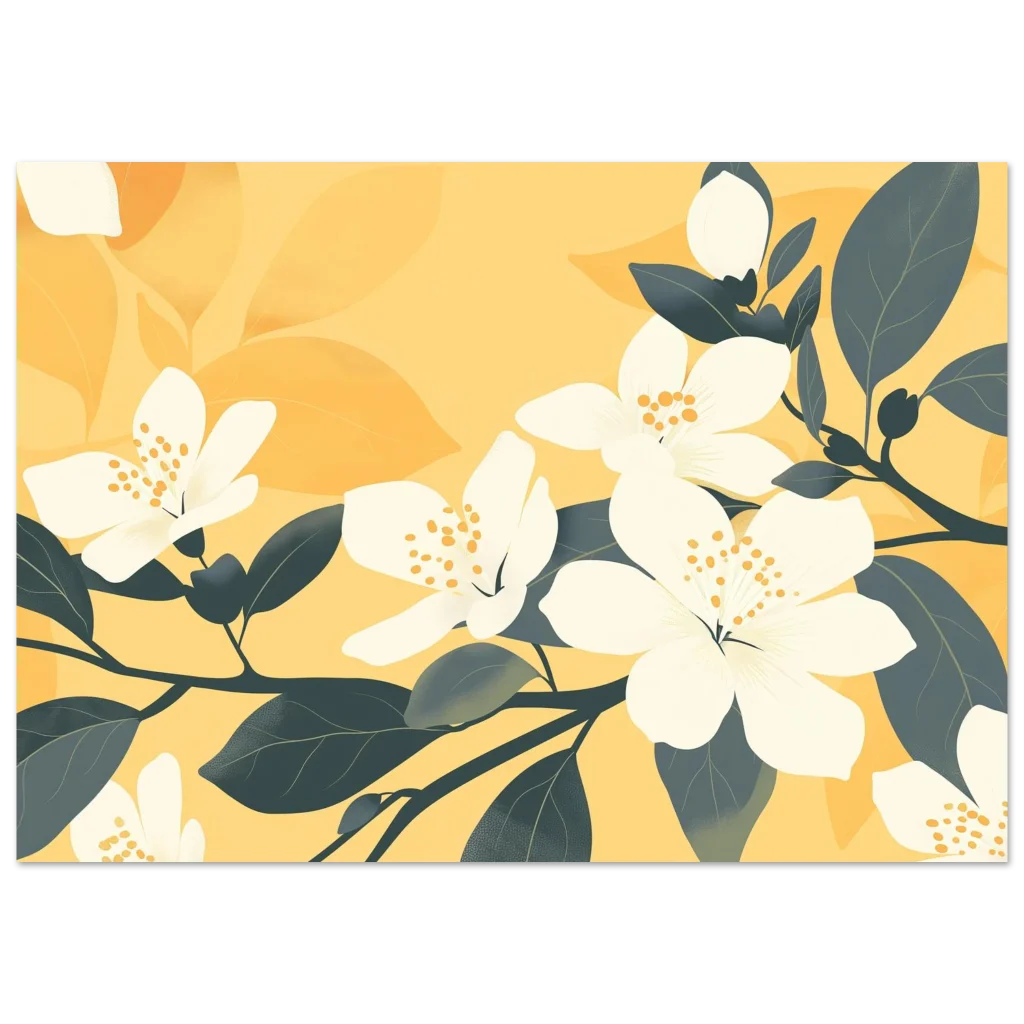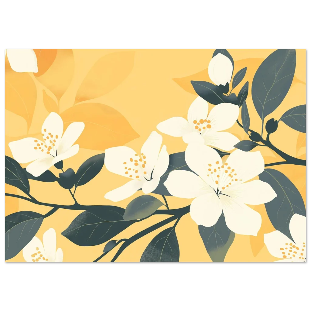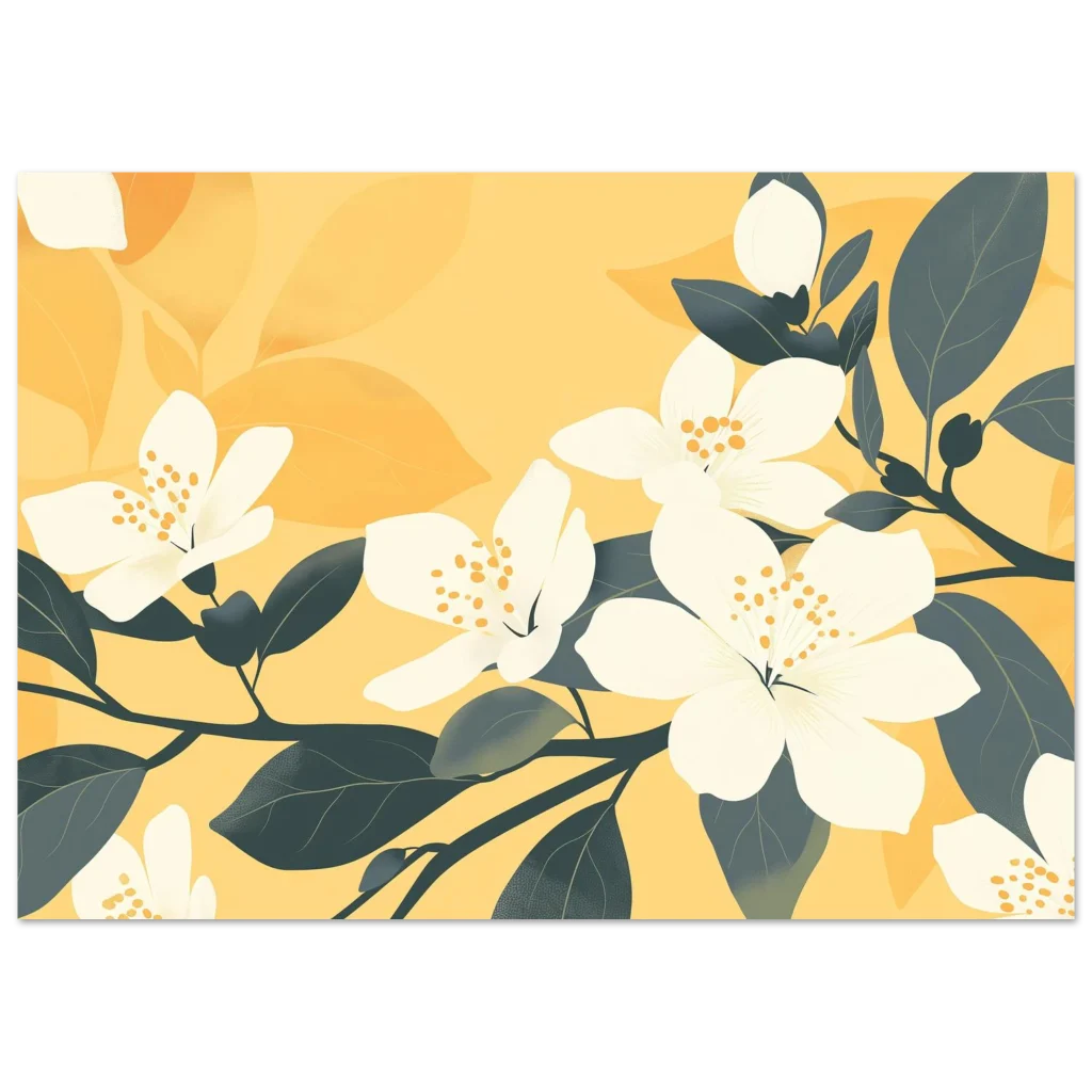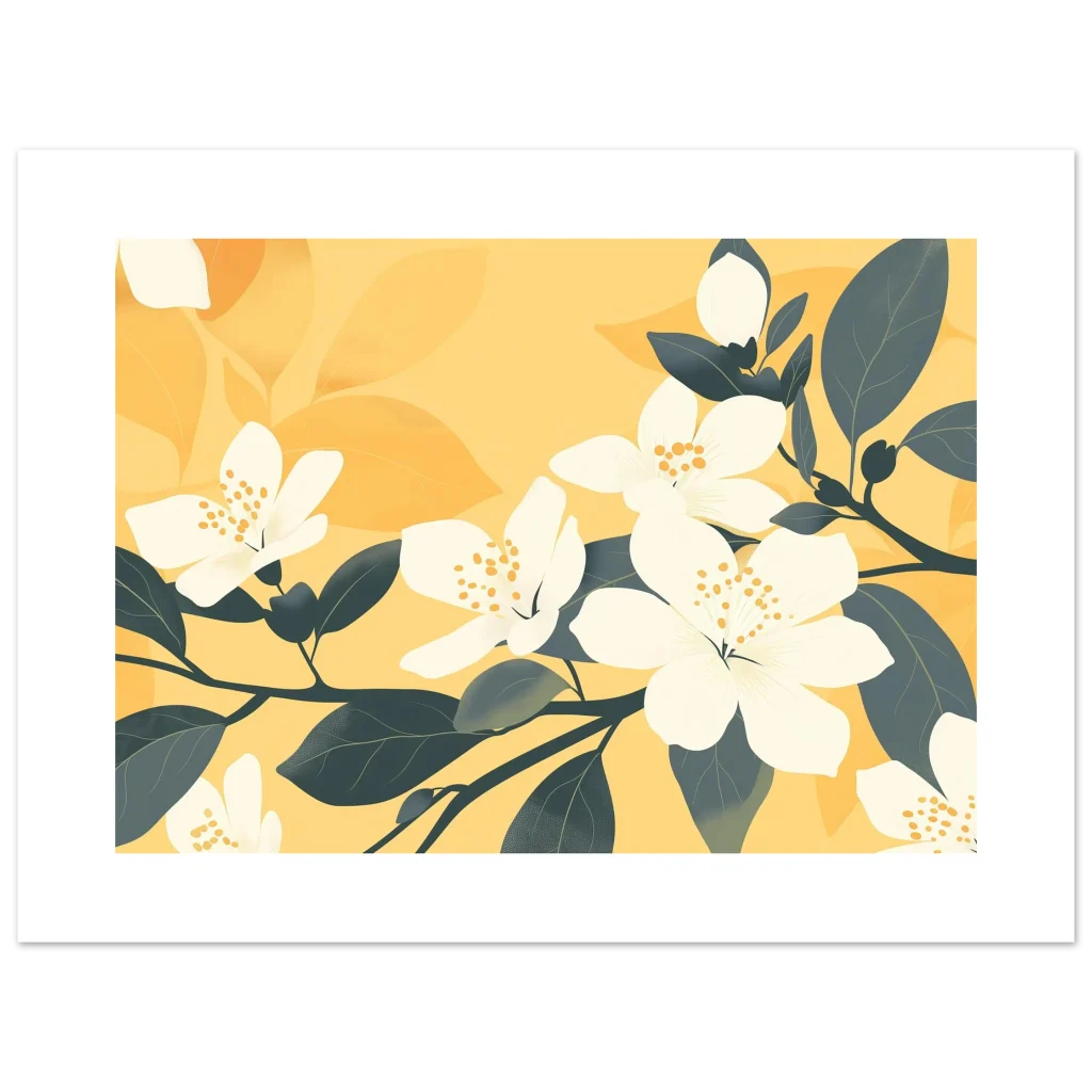 Bring the warmth of a perpetual spring into your home with our “Golden Bloom” art print. This captivating piece, with its harmonious blend of soft yellows and refreshing dark teal leaves, features elegantly rendered white blossoms that seem to glow with an inner light. It’s perfect for adding a touch of serene sophistication and modern botanical charm to any living space, bedroom, or office.