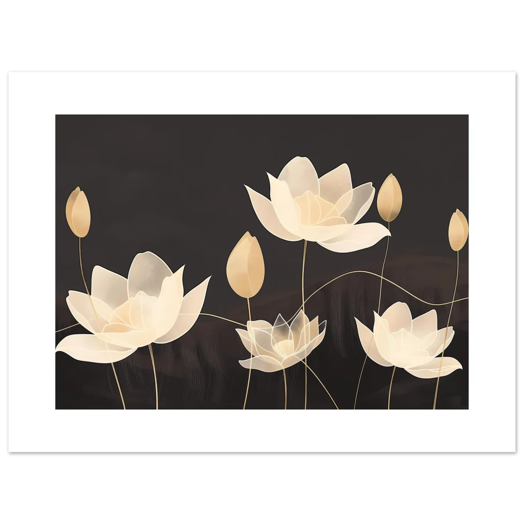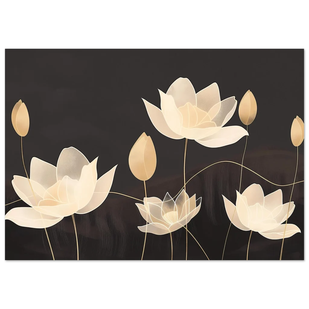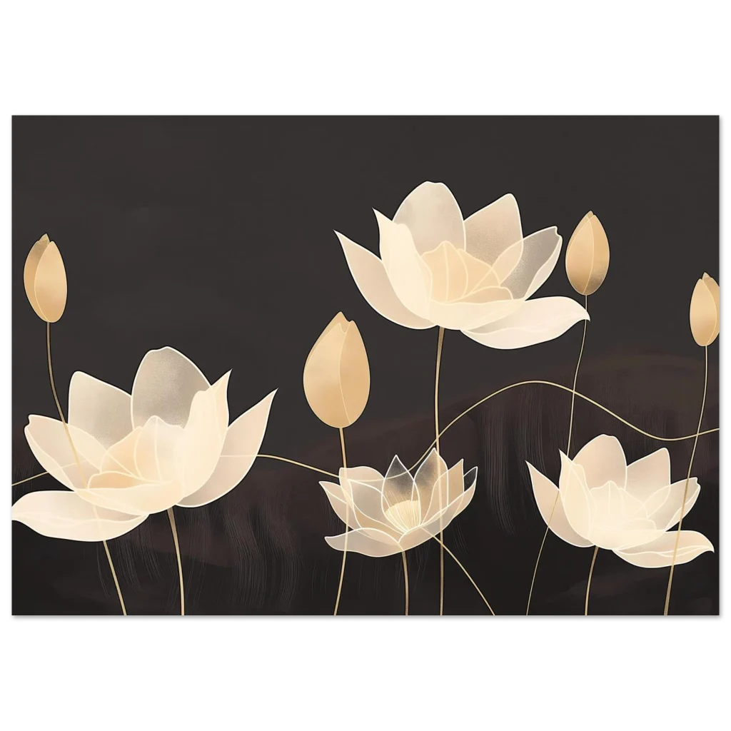 Invite an aura of serene elegance into your space with our Golden Bloom Serenity poster. Featuring beautifully rendered lotus flowers in soft, ethereal gold and cream tones against a deep, muted background, this artwork evokes a sense of calm and sophisticated tranquility. The delicate lines and subtle textures create a visual symphony perfect for enhancing any room with a touch of timeless beauty.