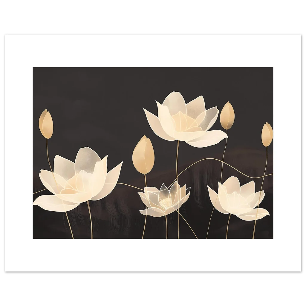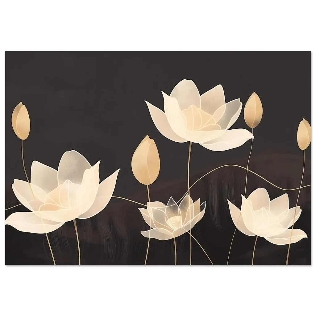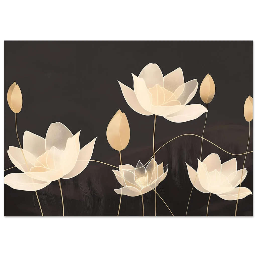 Invite an aura of serene elegance into your space with our Golden Bloom Serenity poster. Featuring beautifully rendered lotus flowers in soft, ethereal gold and cream tones against a deep, muted background, this artwork evokes a sense of calm and sophisticated tranquility. The delicate lines and subtle textures create a visual symphony perfect for enhancing any room with a touch of timeless beauty.