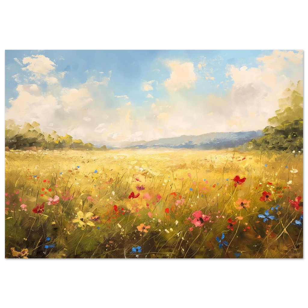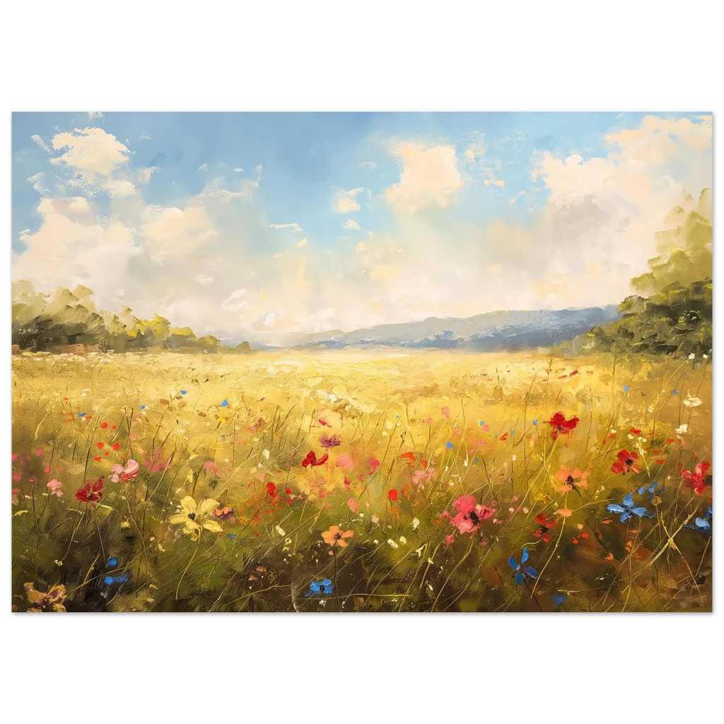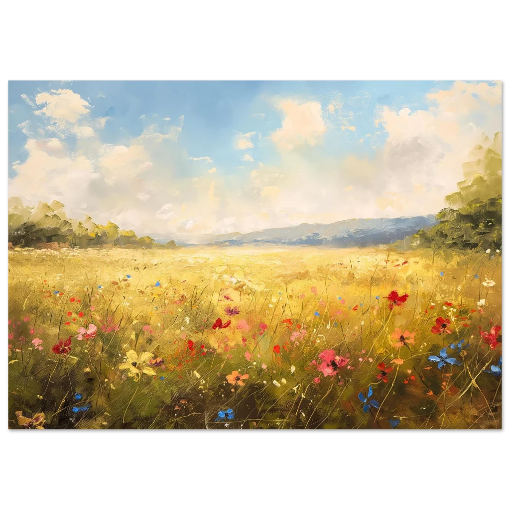 Bring the vibrant warmth of a sun-drenched field into your home with our stunning Golden Meadow Landscape poster. This exquisite piece captures the joyous energy of wildflowers dancing under a bright, airy sky, rendered with rich impasto textures and a lively color palette that evokes a feeling of serene escape.