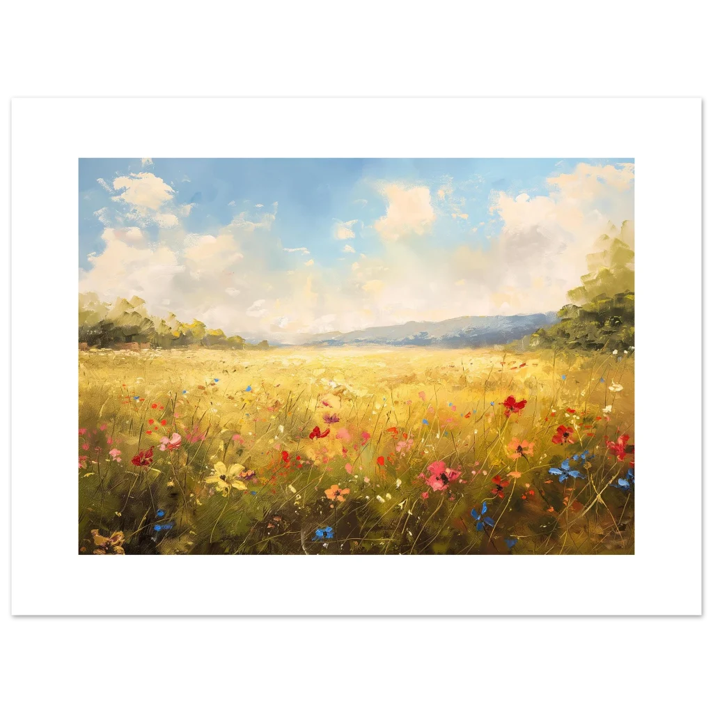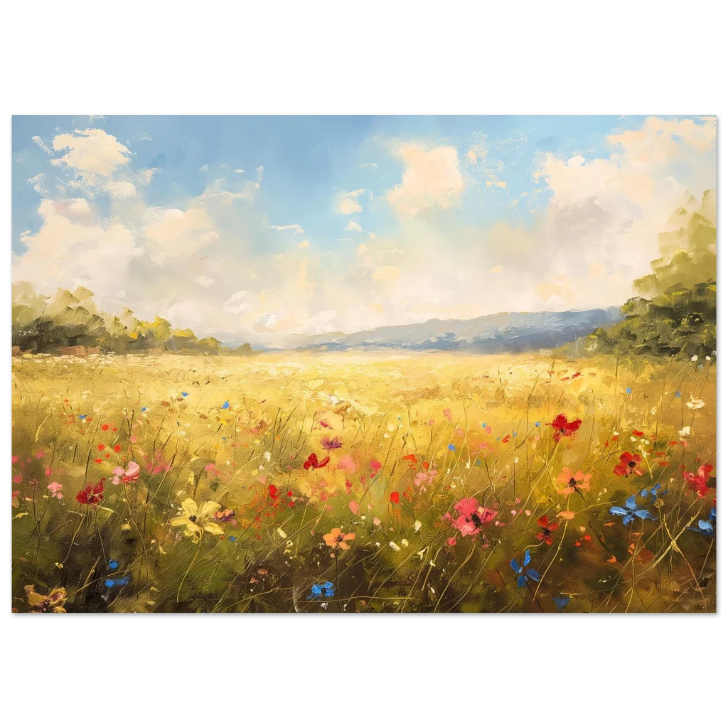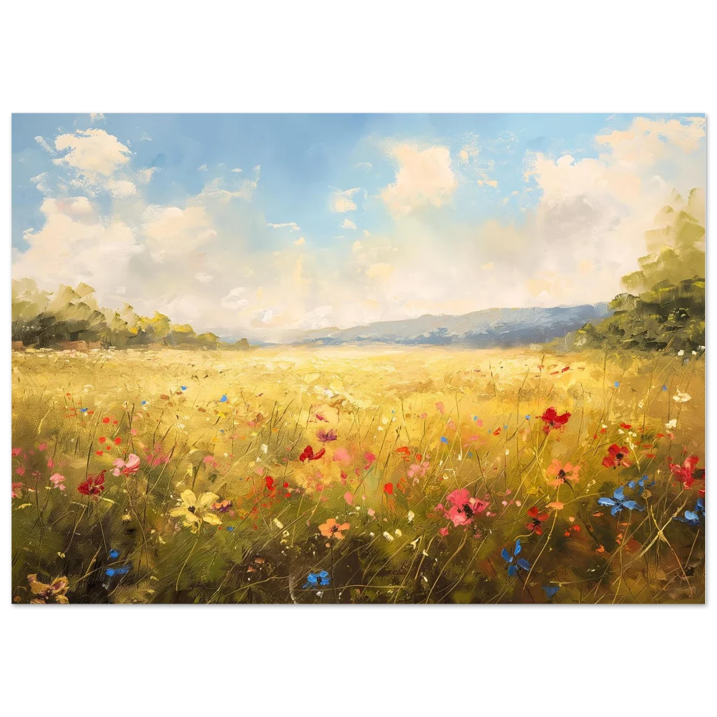 Bring the vibrant warmth of a sun-drenched field into your home with our stunning Golden Meadow Landscape poster. This exquisite piece captures the joyous energy of wildflowers dancing under a bright, airy sky, rendered with rich impasto textures and a lively color palette that evokes a feeling of serene escape.