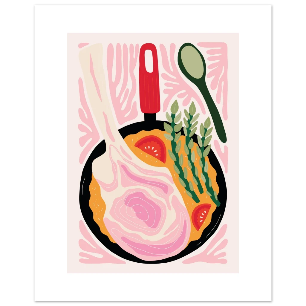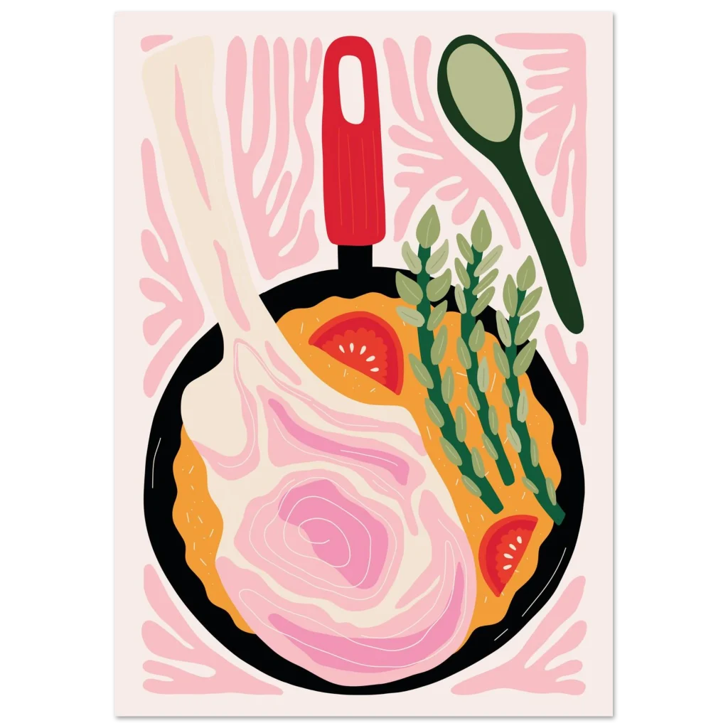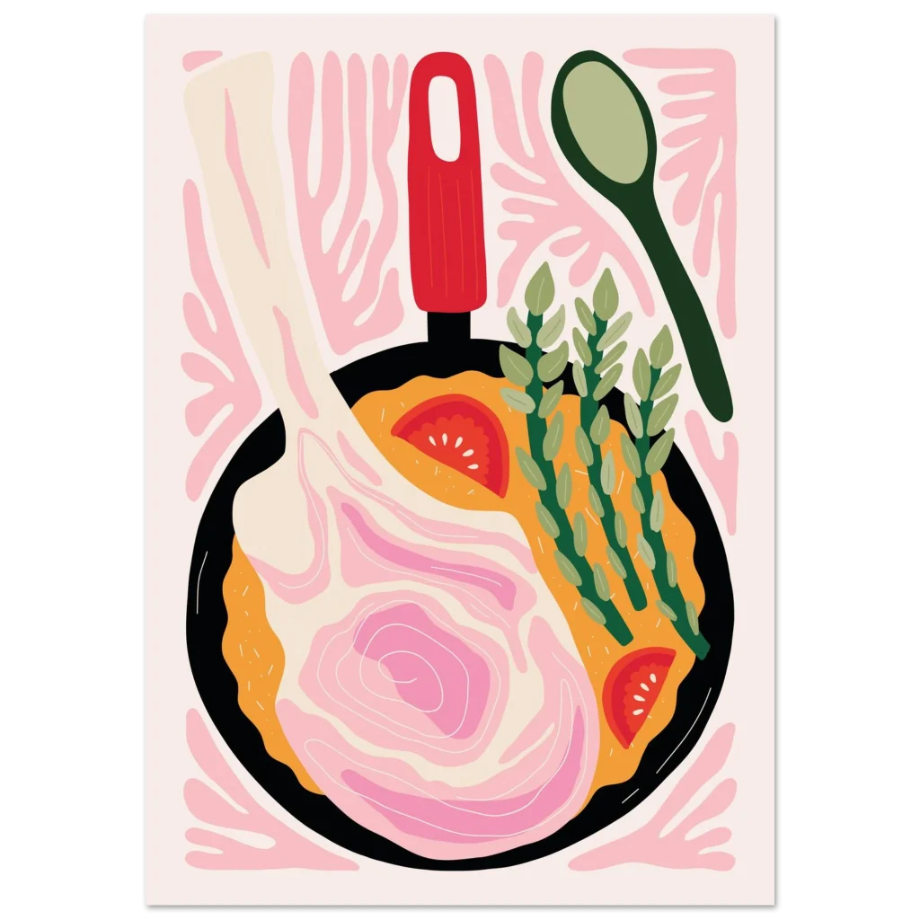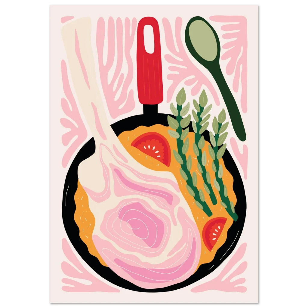 Infuse your kitchen or dining area with a playful touch of gourmet artistry! This vibrant poster captures the essence of a beautifully cooked meal with a modern, abstract twist, featuring a tender steak, crisp asparagus, and juicy tomatoes in a lively color palette. It’s the perfect conversation starter for foodies and art lovers alike, bringing a unique character to your culinary space.