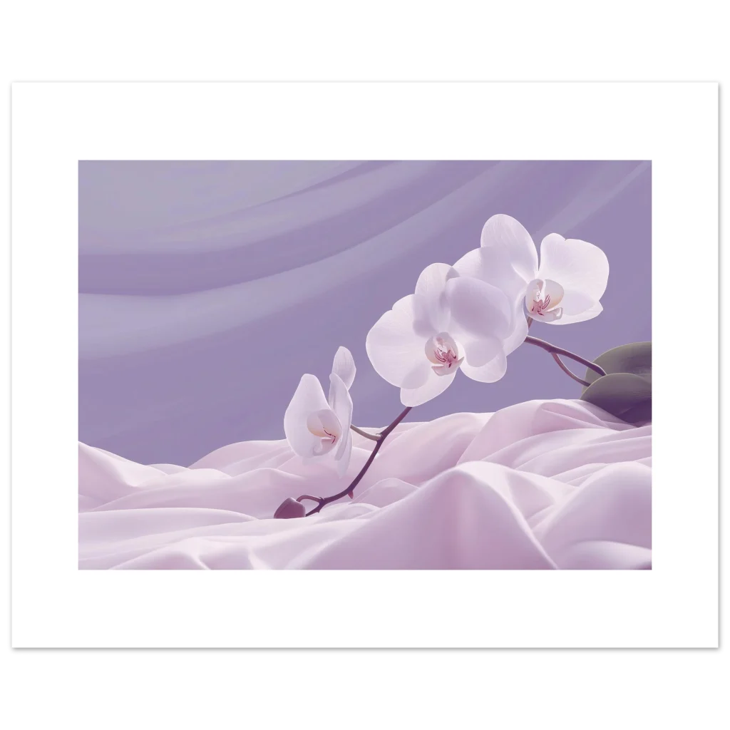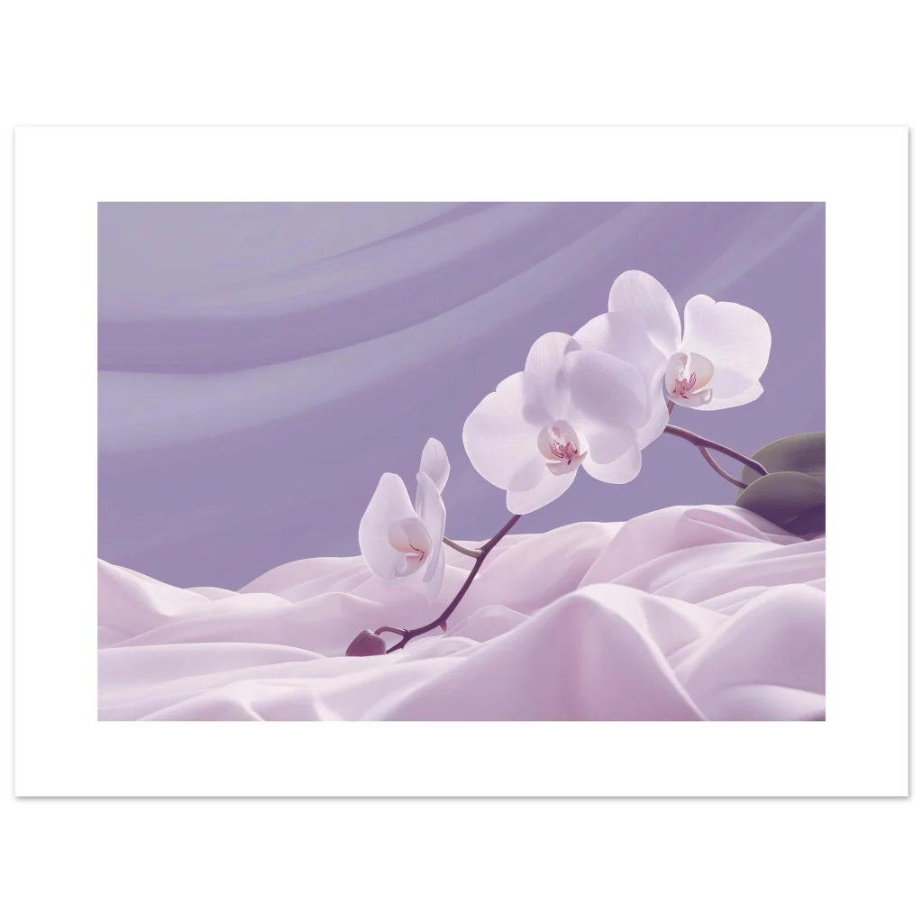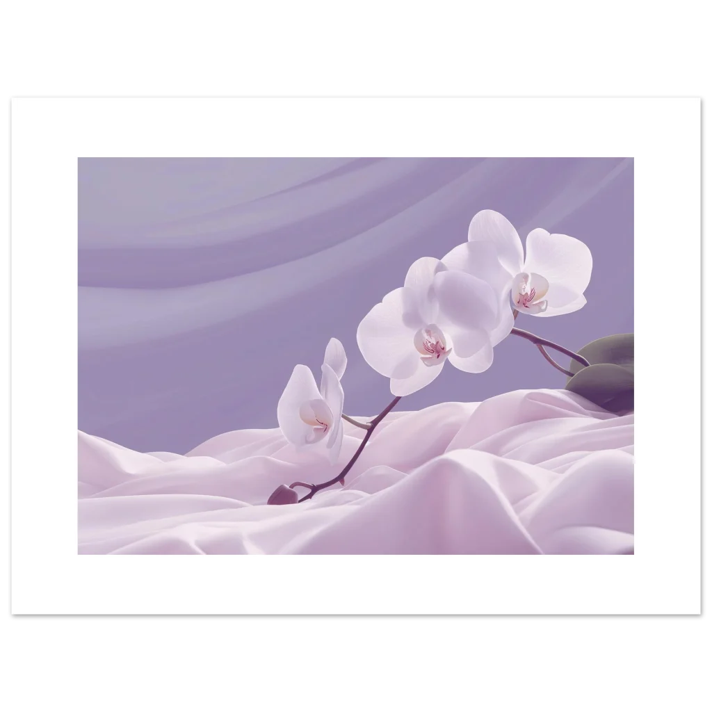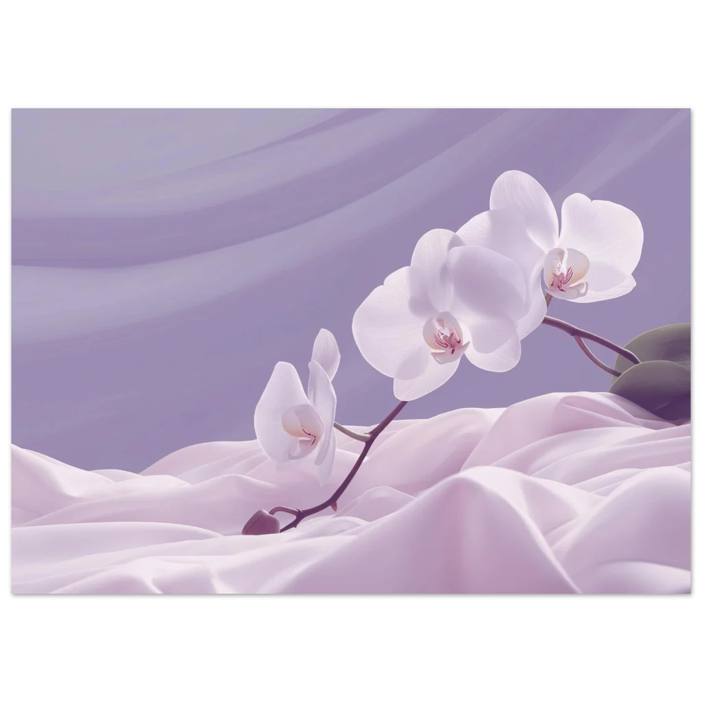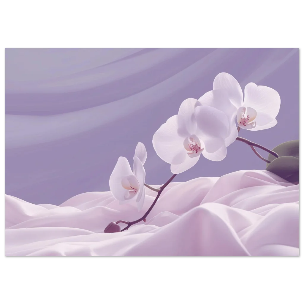 Bring an aura of tranquility and delicate beauty into your space with this exquisite poster, capturing the serene elegance of white orchids amidst flowing lavender fabric. The soft, dreamy color palette and graceful composition evoke a sense of calm and sophistication, making it a perfect addition to any living room, bedroom, or office seeking a touch of natural artistry.