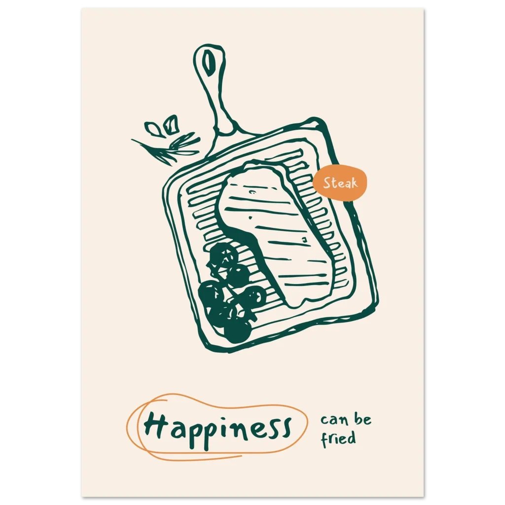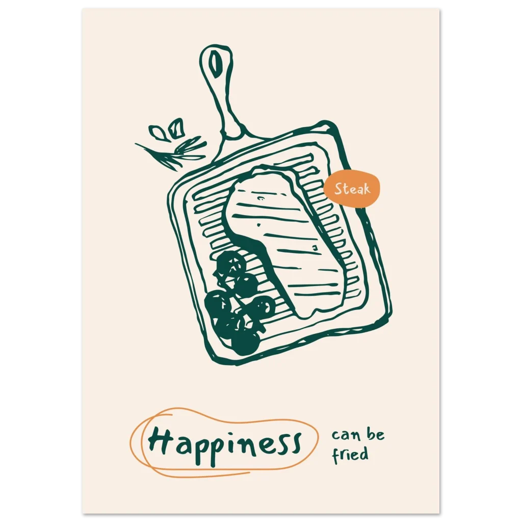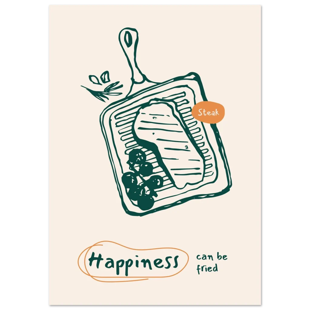 Bring a touch of whimsical culinary delight to your space with our “Happiness Can Be Fried” steak poster. Featuring a charming, hand-drawn illustration of a sizzling steak on a grill pan, this piece is designed to spark joy and perhaps, a craving for your favorite meal. The warm, inviting color palette and playful message make it a perfect addition to kitchens, dining areas, or any spot where good food and good vibes are appreciated.