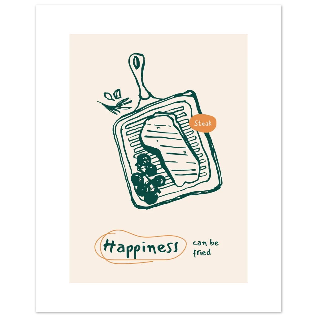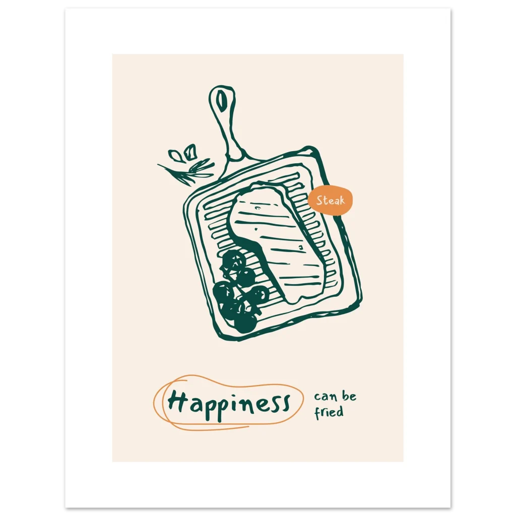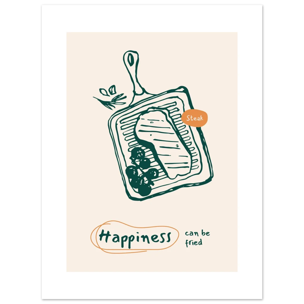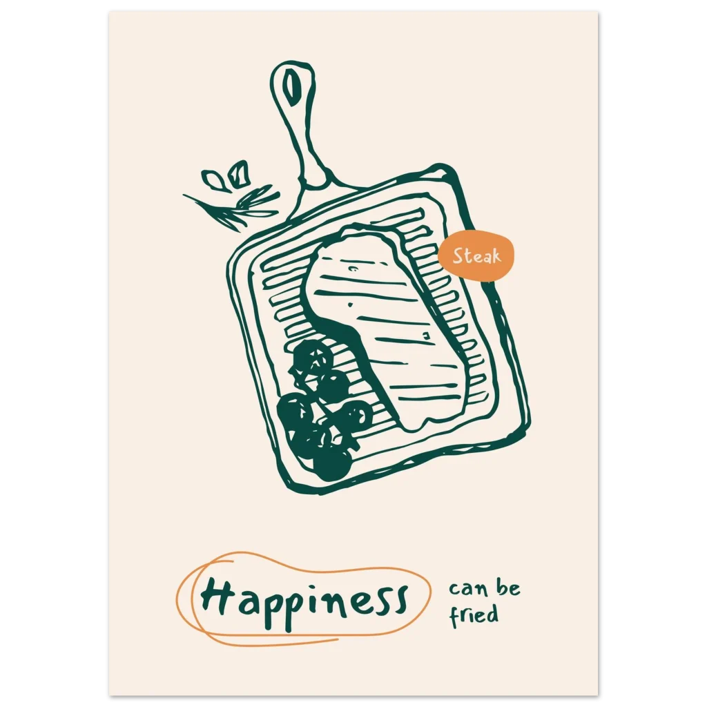 Bring a touch of whimsical culinary delight to your space with our “Happiness Can Be Fried” steak poster. Featuring a charming, hand-drawn illustration of a sizzling steak on a grill pan, this piece is designed to spark joy and perhaps, a craving for your favorite meal. The warm, inviting color palette and playful message make it a perfect addition to kitchens, dining areas, or any spot where good food and good vibes are appreciated.