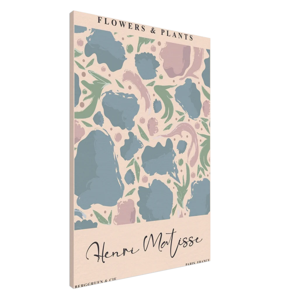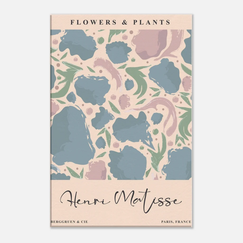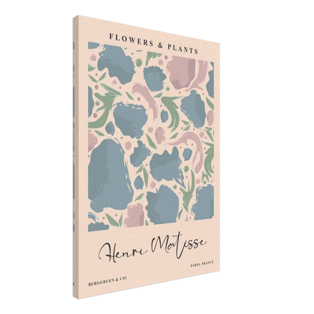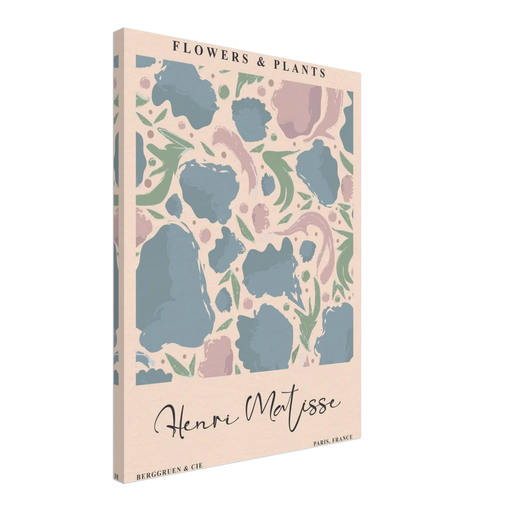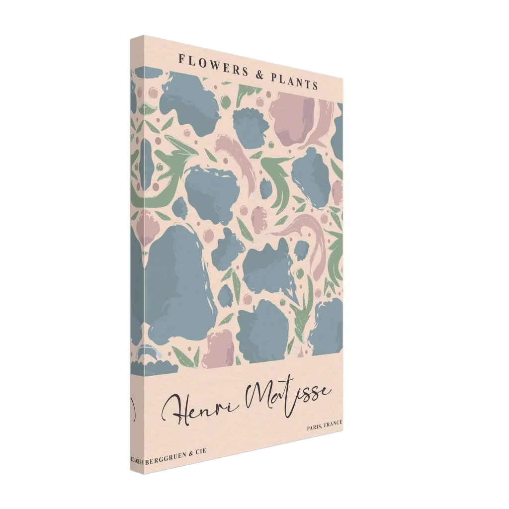 Immerse your space in the serene beauty of abstract botanicals with our Henri Matisse-inspired canvas print. This artwork captures the playful elegance and soothing pastel palette reminiscent of the master, featuring soft blues, dusty pinks, and muted greens that dance across a warm background. The canvas texture elevates the image’s natural look and feel, creating a truly immersive art experience that brings a touch of gallery sophistication to any room.