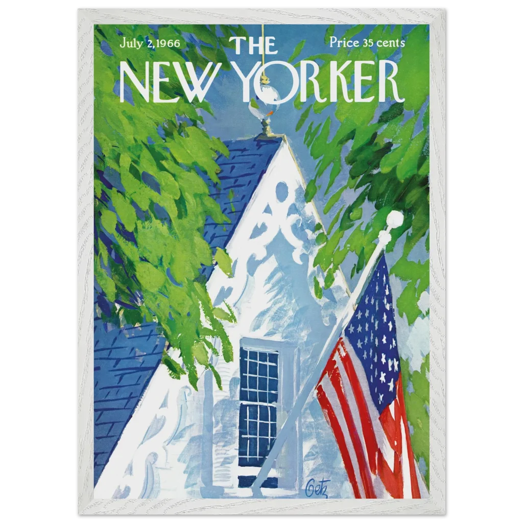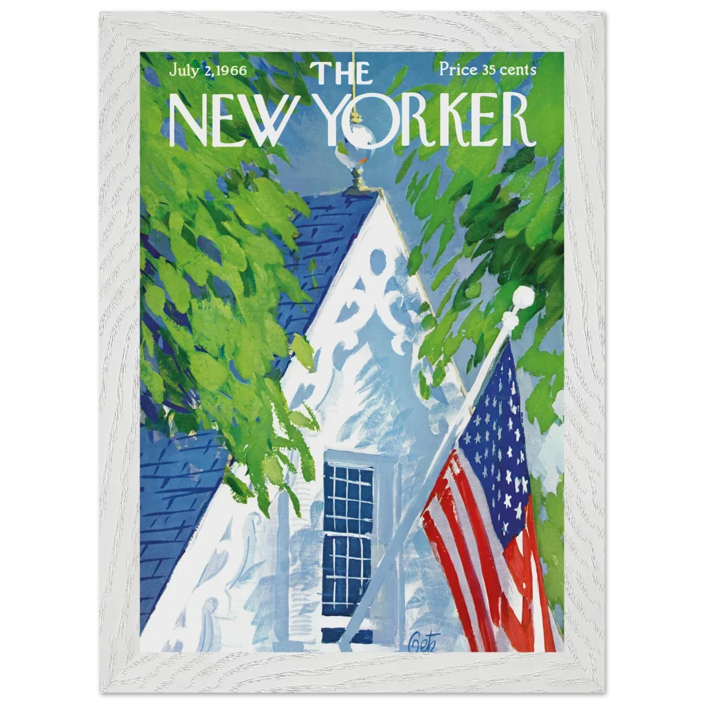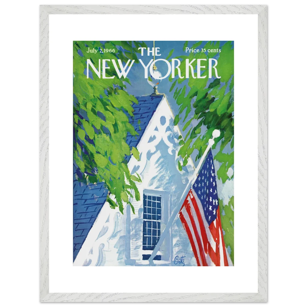 Capture the essence of an idyllic American summer with this timeless July 4th New Yorker cover art, reimagined as a premium framed poster. The vibrant, painterly strokes evoke a sense of nostalgic warmth, featuring a charming white house framed by lush green foliage and a proudly displayed American flag. This piece is perfect for those who appreciate classic Americana and a touch of vintage sophistication in their home décor.