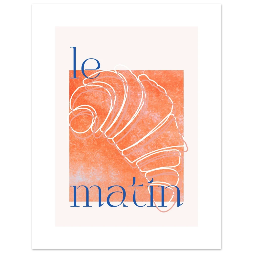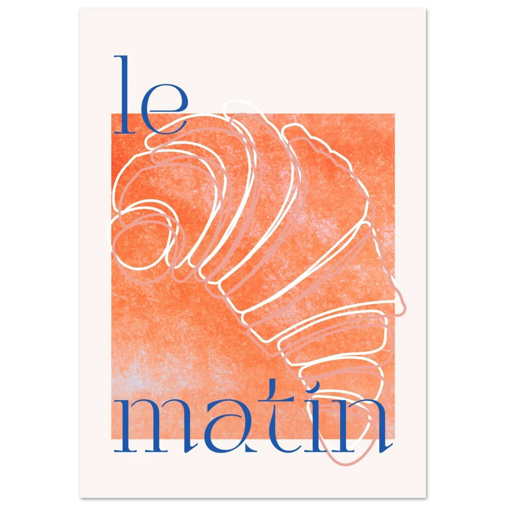 Embrace the warmth of a Parisian morning with our ‘Le Matin’ art print. This delightful abstract design, featuring a minimalist croissant outline against a vibrant, textured orange background, captures the essence of a tranquil breakfast. The bold blue typography adds a chic, modern touch, making it a perfect piece for your kitchen, dining area, or any space craving a touch of sophisticated charm.