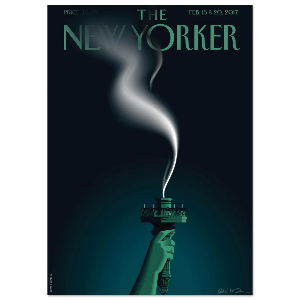 Illuminate your space with a powerful statement piece. This striking poster, reminiscent of a classic New Yorker cover, captures the iconic torch of the Statue of Liberty, reimagined with a poignant, smoky glow against a deep, somber teal and black backdrop. It’s a piece that speaks volumes, perfect for those who appreciate art with a profound message and a touch of minimalist elegance.