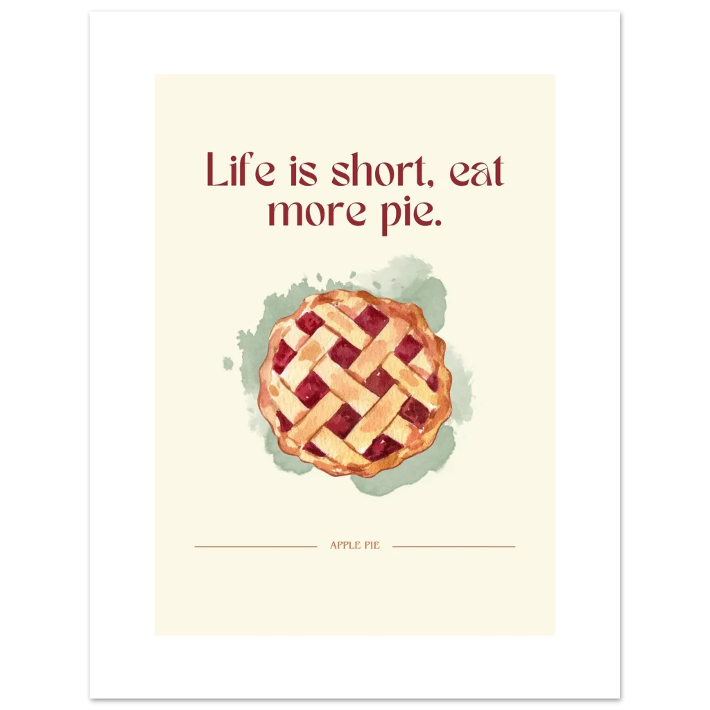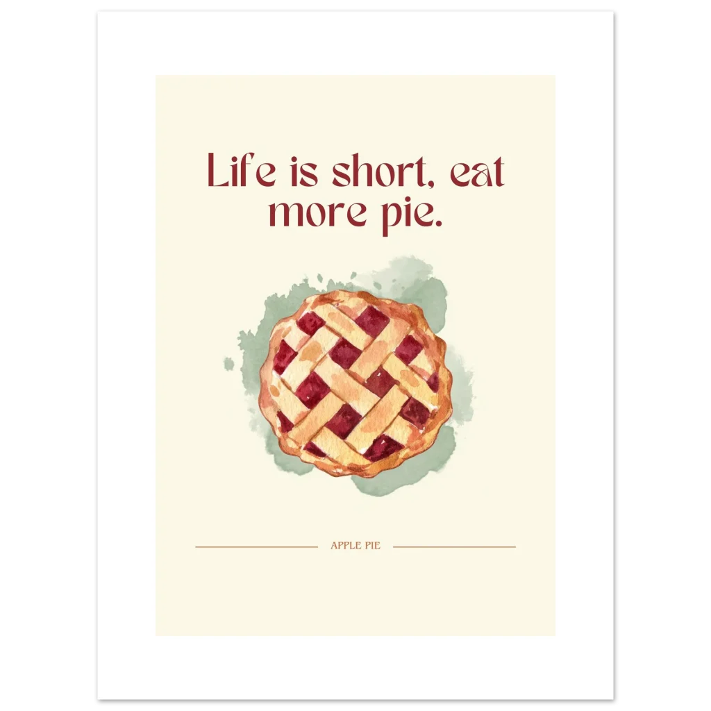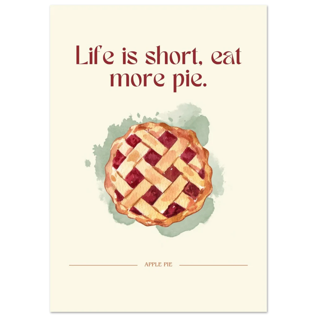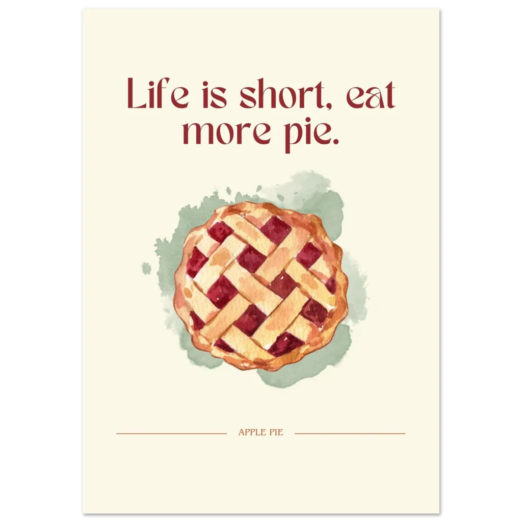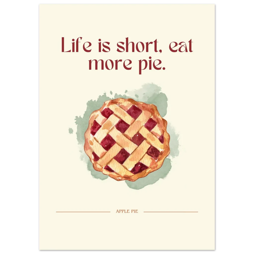Embrace the sweet moments in life with our charming “Life is Short, Eat More Pie” poster. Featuring a delightful watercolor apple pie illustration set against a warm, inviting background with subtle green accents, this piece adds a touch of whimsical coziness and a gentle reminder to savor life’s simple pleasures. Perfect for kitchens, dining areas, or any space that could use a dash of cheer and delicious inspiration.