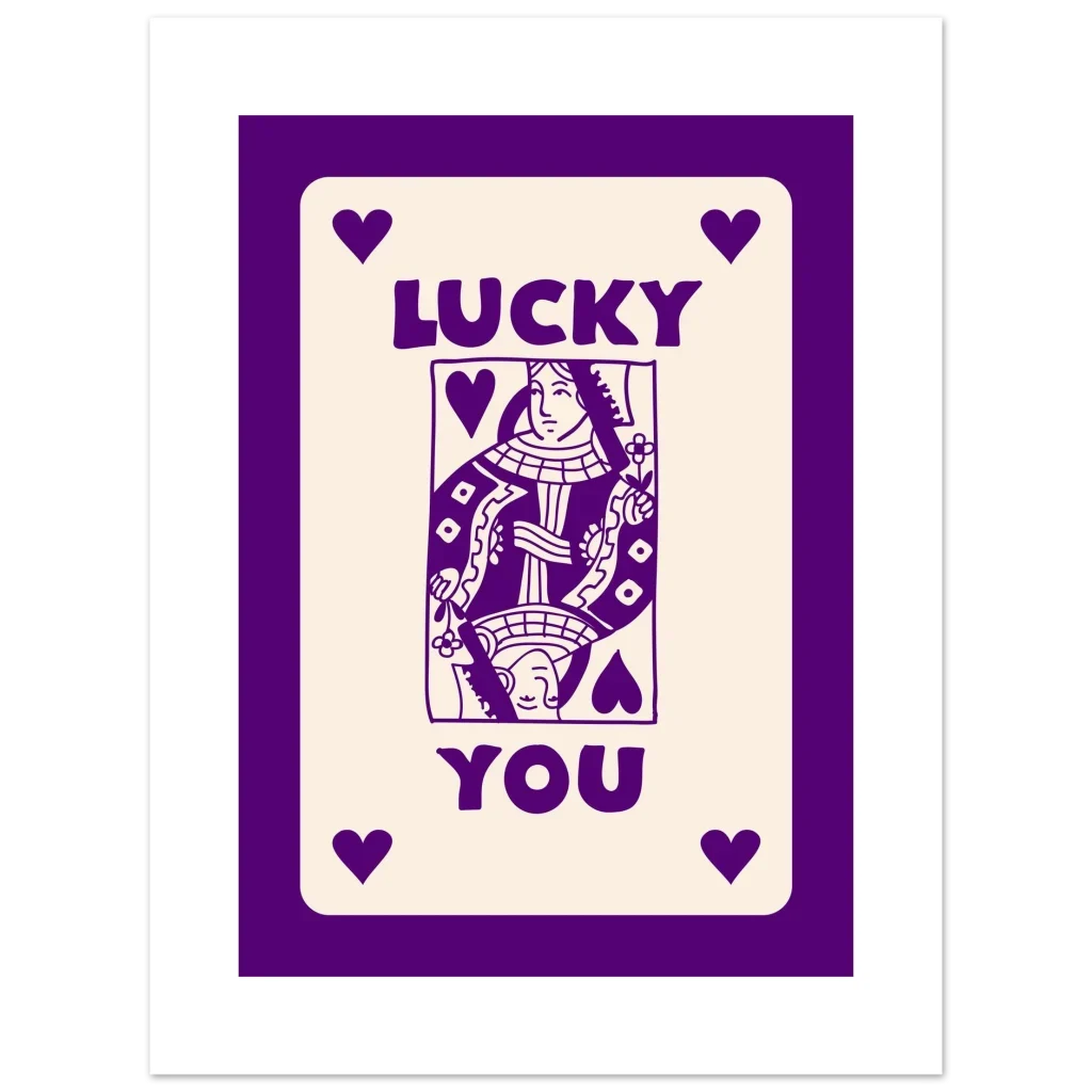 Lucky You Queen of Hearts Poster – Vibrant Purple & Cream Vintage Card Art Print