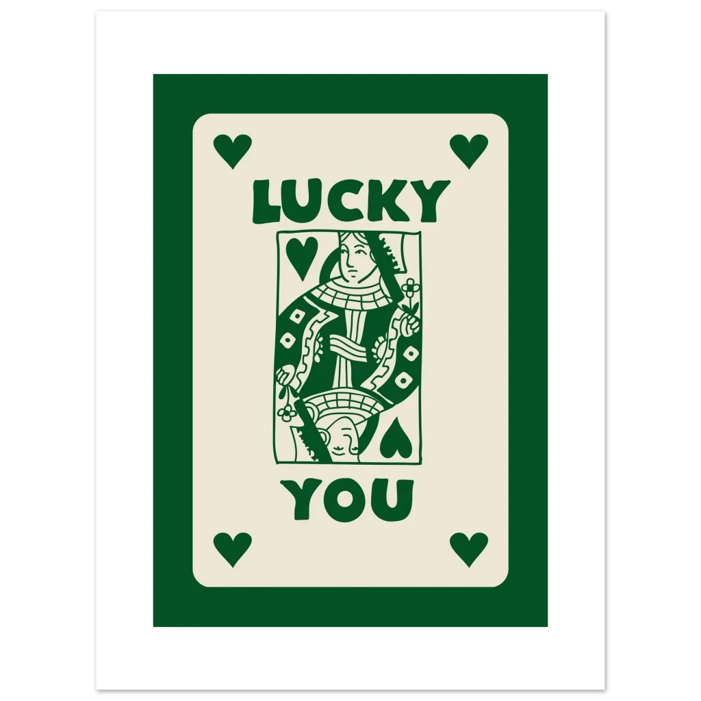 Bring a touch of vintage charm and good fortune to your space with our “Lucky You” Queen of Hearts poster. Inspired by classic playing card and tarot aesthetics, this design features a bold, deep green on a creamy ivory background, exuding a timeless elegance with a playful wink. It’s perfect for adding a bit of personality and positive vibes to any room, reminding you to embrace your luck every day.