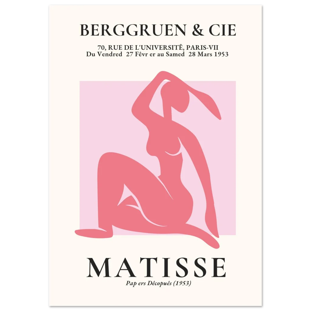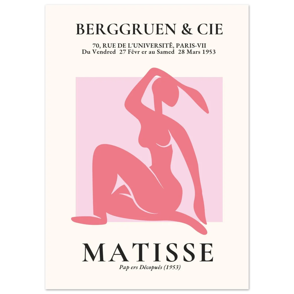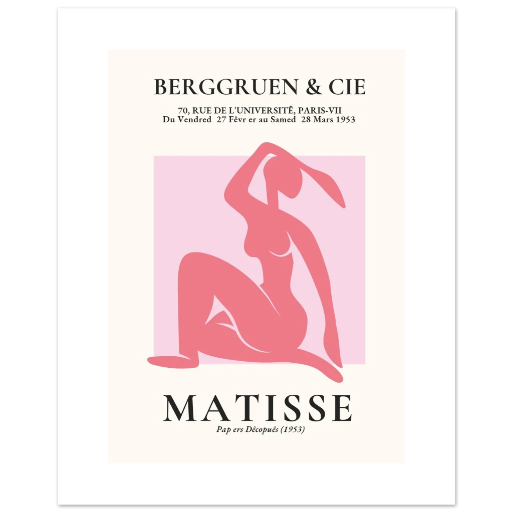 Bring the timeless elegance of Matisse’s iconic cut-outs into your home with this stunning figurative art print. Featuring a graceful pink nude silhouette against a soft background, this poster captures the playful sophistication and bold simplicity that defined the master’s late works. It’s a celebration of form and color, perfect for adding a touch of classic modernism and serene beauty to any space.