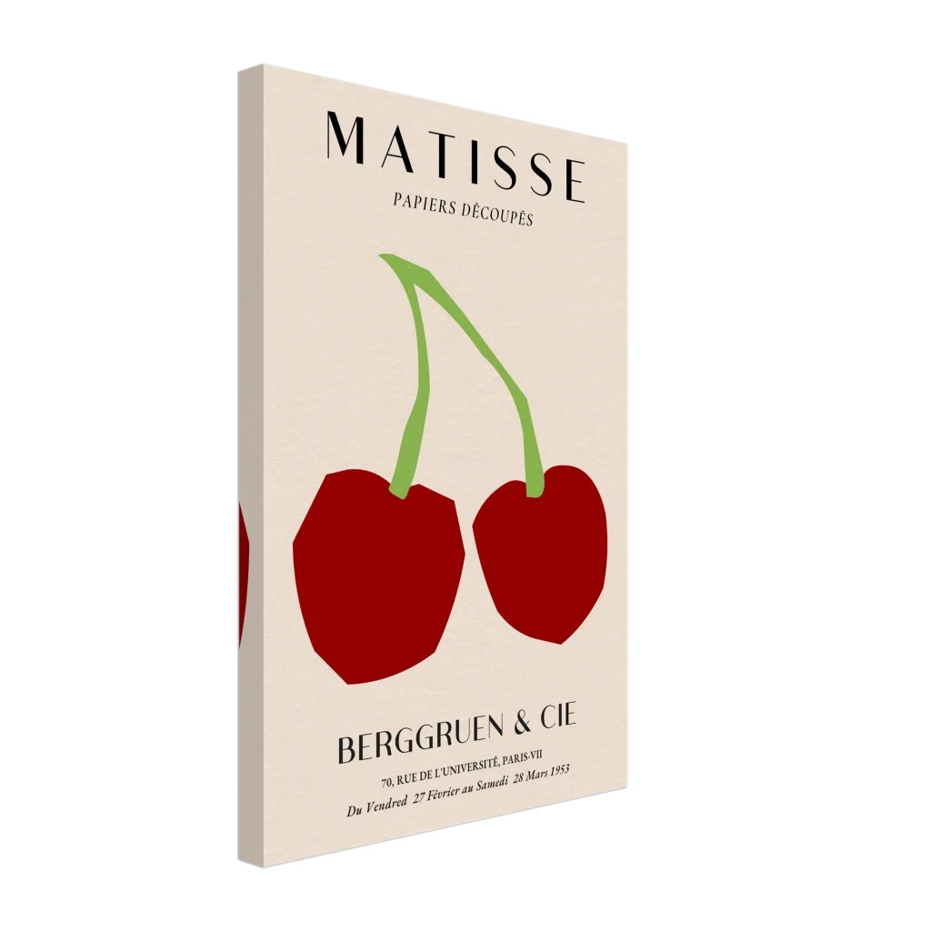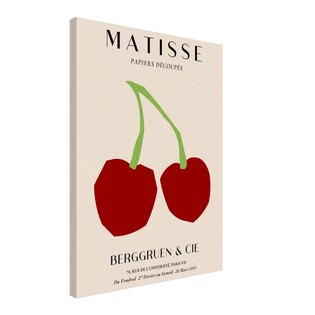 Bring a touch of whimsical elegance and modernist charm into your home with our Matisse-inspired cherries canvas print. The striking simplicity of the ‘Papiers Découpés’ aesthetic, featuring bold red cherries on a soft, neutral background, instantly elevates any space. Our canvas texture enhances the image’s natural look and feel, creating a truly immersive art experience that captures the essence of a timeless exhibition.