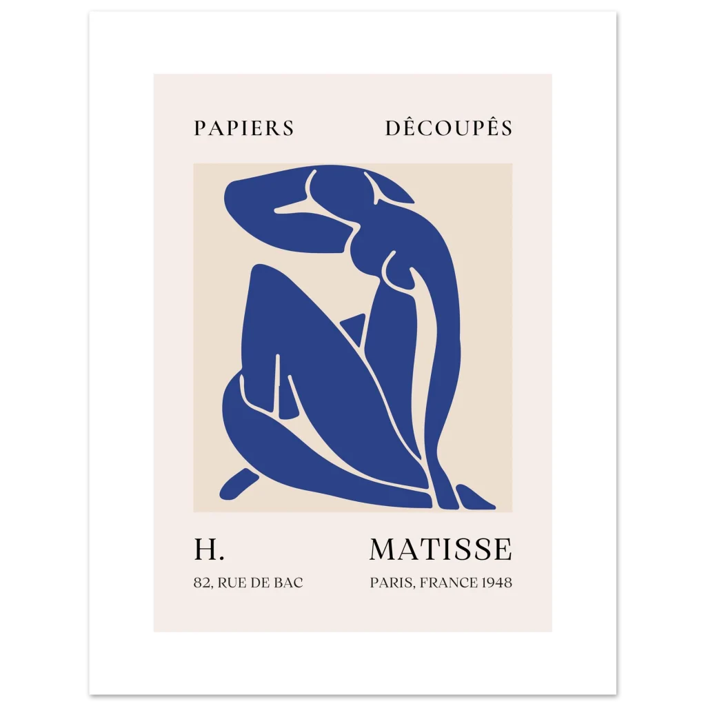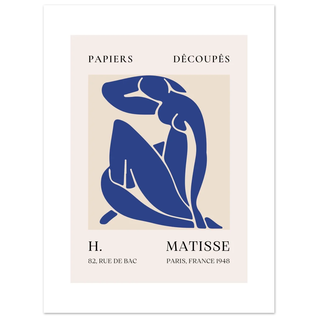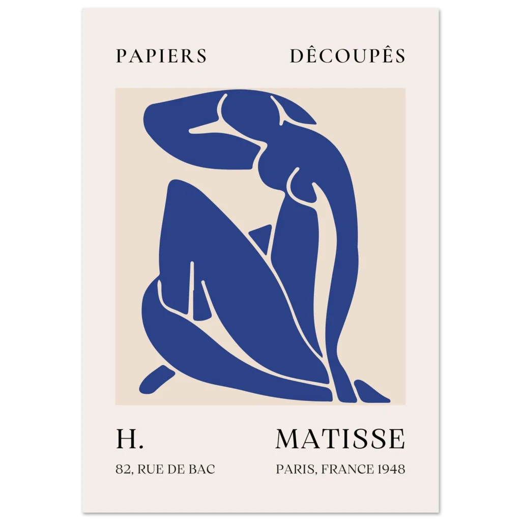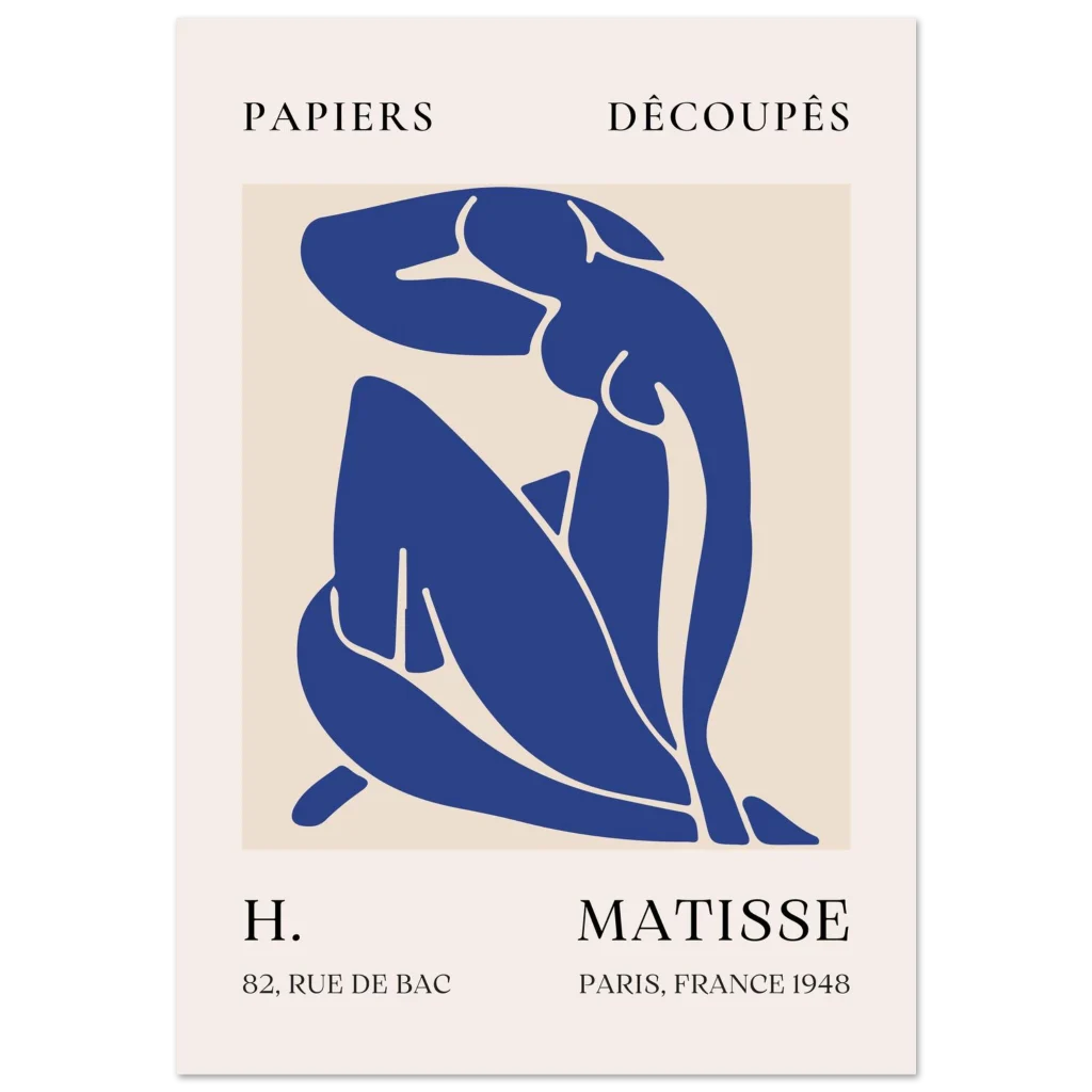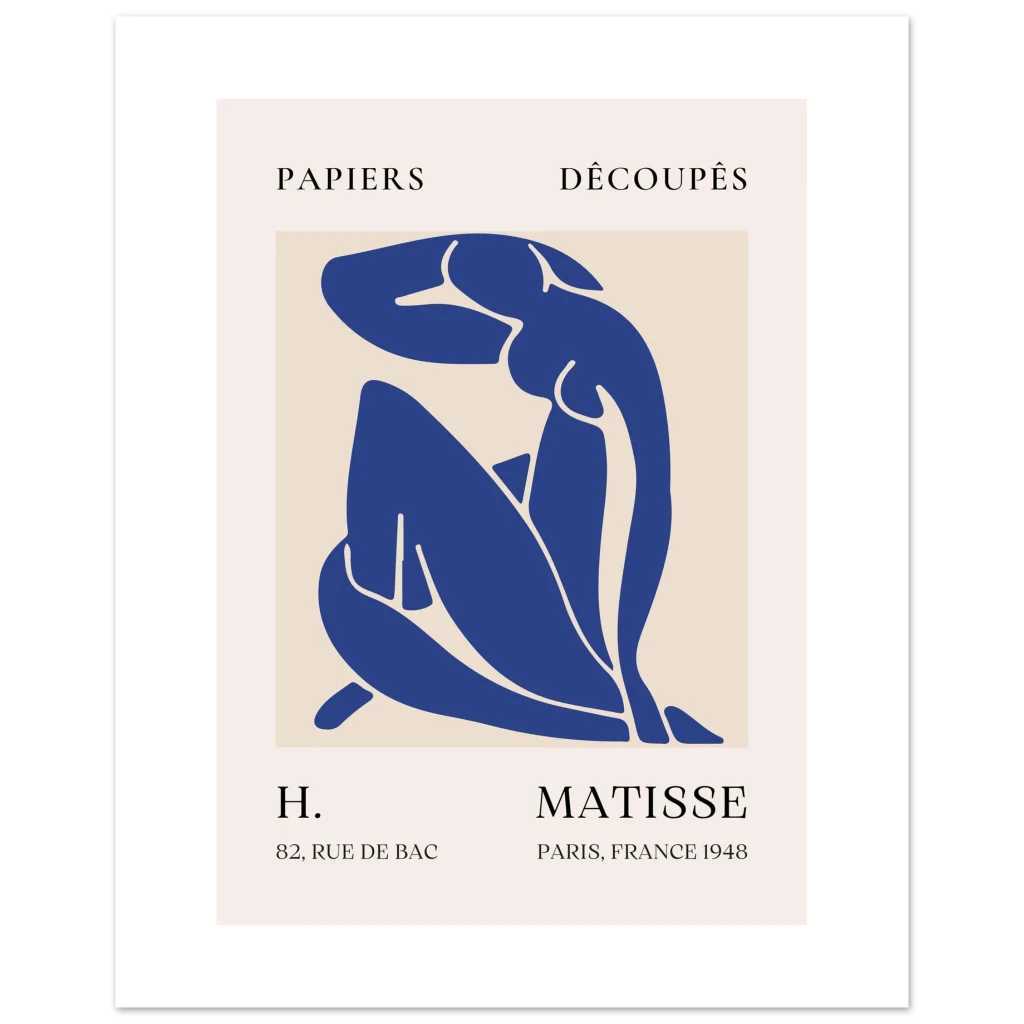 Bring timeless elegance and a touch of modern artistry to your space with our Matisse-inspired ‘Papiers Découpés’ poster. This abstract piece, featuring a serene nude figure in a striking navy blue against a soft beige background, captures the minimalist beauty and sophisticated charm of the iconic cut-out style. It’s an ideal addition for art lovers seeking a statement piece that blends classic inspiration with contemporary appeal.