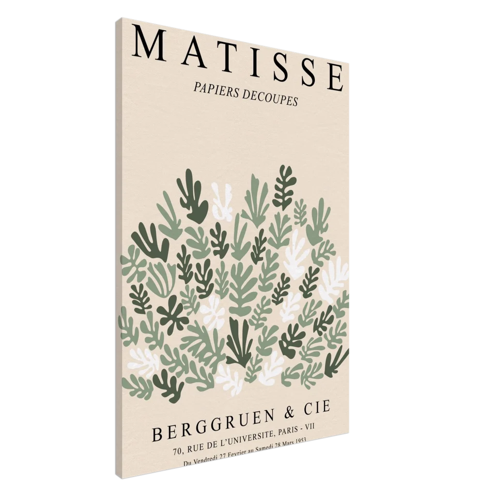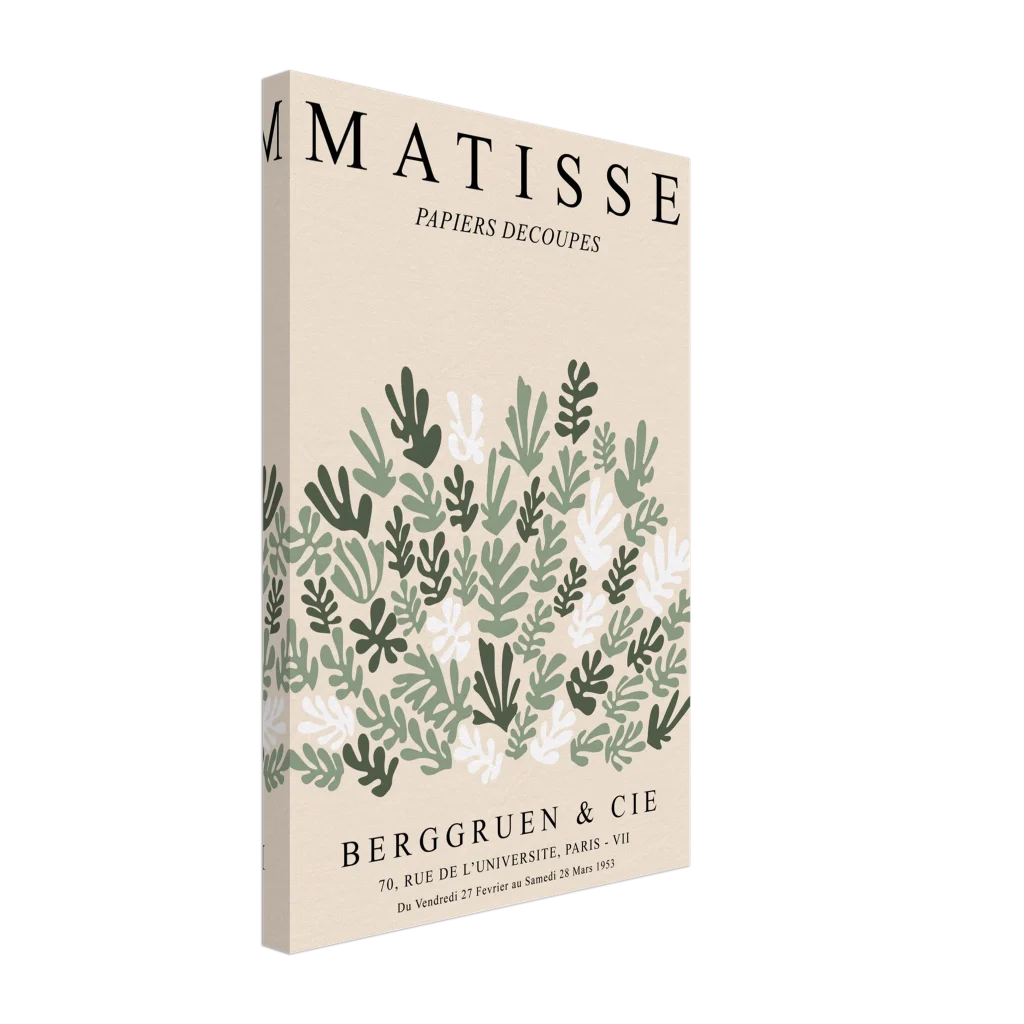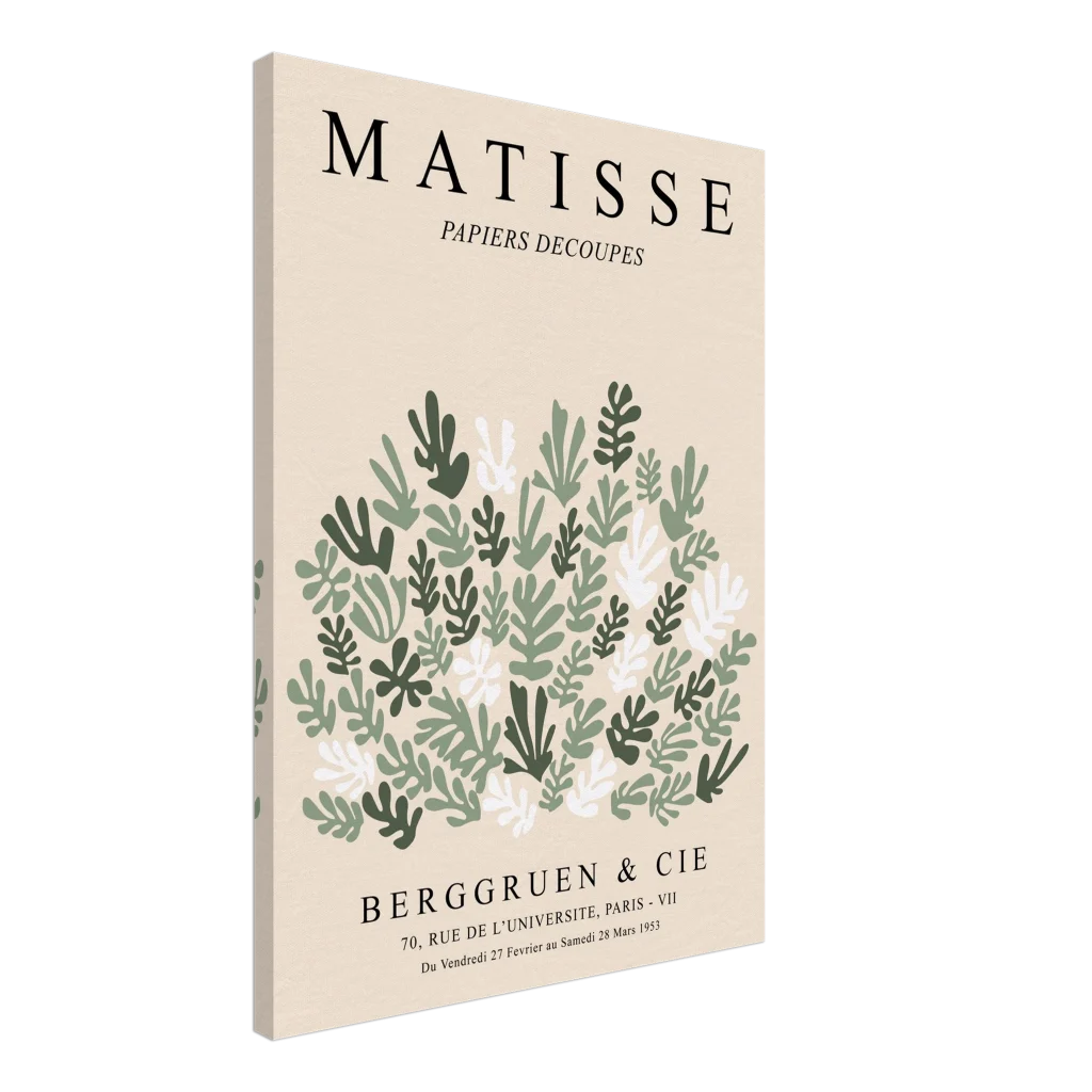 Bring the tranquil elegance of mid-century modern art into your living space with our Matisse Cut-Outs inspired canvas print. Featuring a captivating array of stylized green and cream leaves on a soft, neutral background, this piece embodies a serene botanical charm that complements any contemporary decor. The canvas texture enhances the image’s natural look and feel, creating a truly immersive art experience.