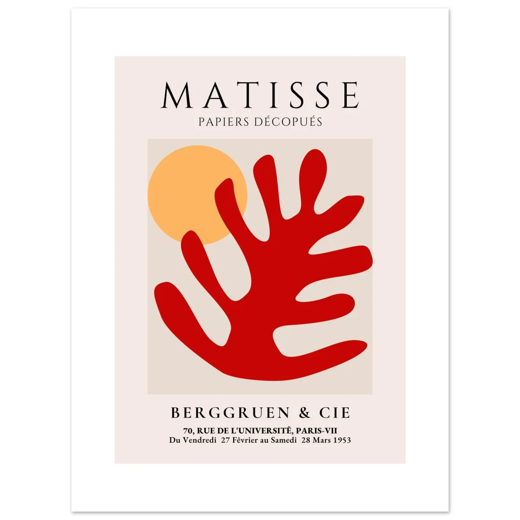 Bring the timeless elegance of Matisse’s iconic cut-outs into your home with this stunning art print. Capturing the bold simplicity and vibrant energy of the original Papies Découpés exhibition, this poster features a striking abstract design in rich red and warm orange tones, set against a soft, neutral background. It’s a perfect blend of modern sophistication and classic artistic charm, ideal for adding a splash of color and a touch of art history to any room.