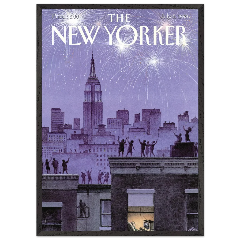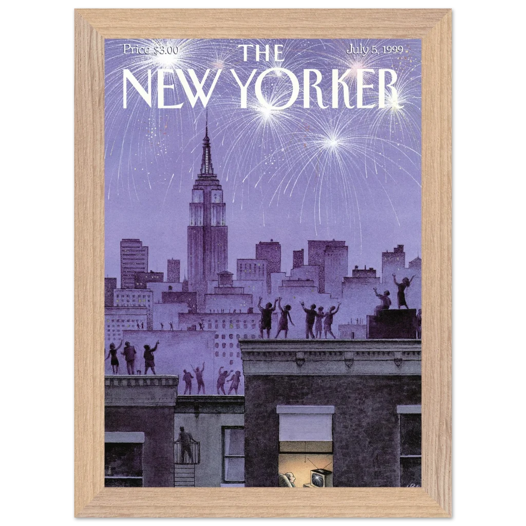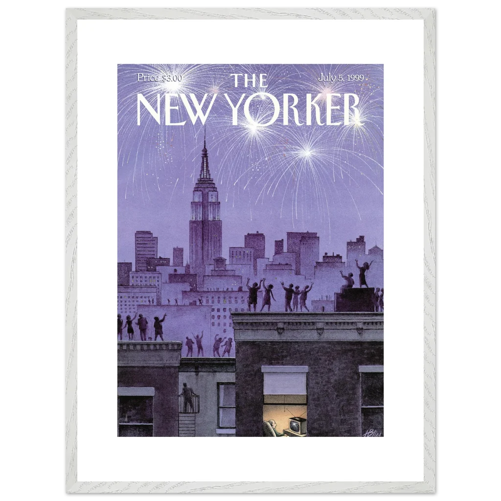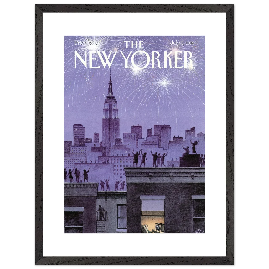 Capture the electric thrill of a New York City summer night with our ‘Midnight Fireworks’ framed poster. This iconic artwork, with its vibrant fireworks illuminating the city skyline and joyful rooftop revelers, evokes a sense of shared wonder and urban magic. A lone figure watching TV adds a touch of relatable charm, making this piece a captivating conversation starter for any space.