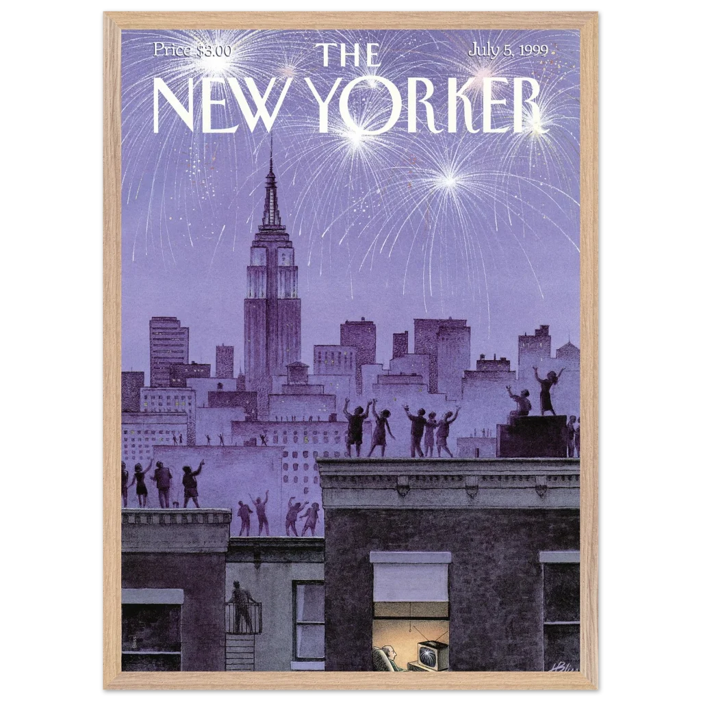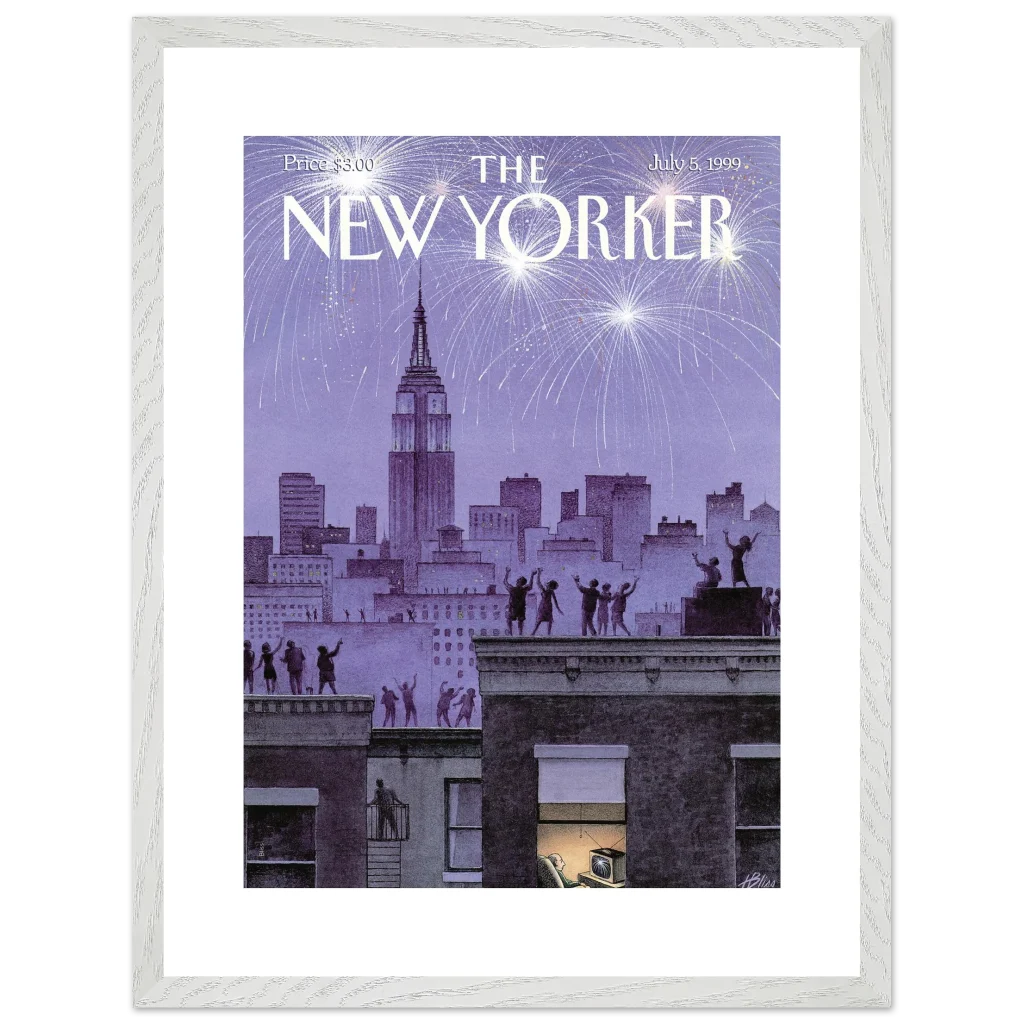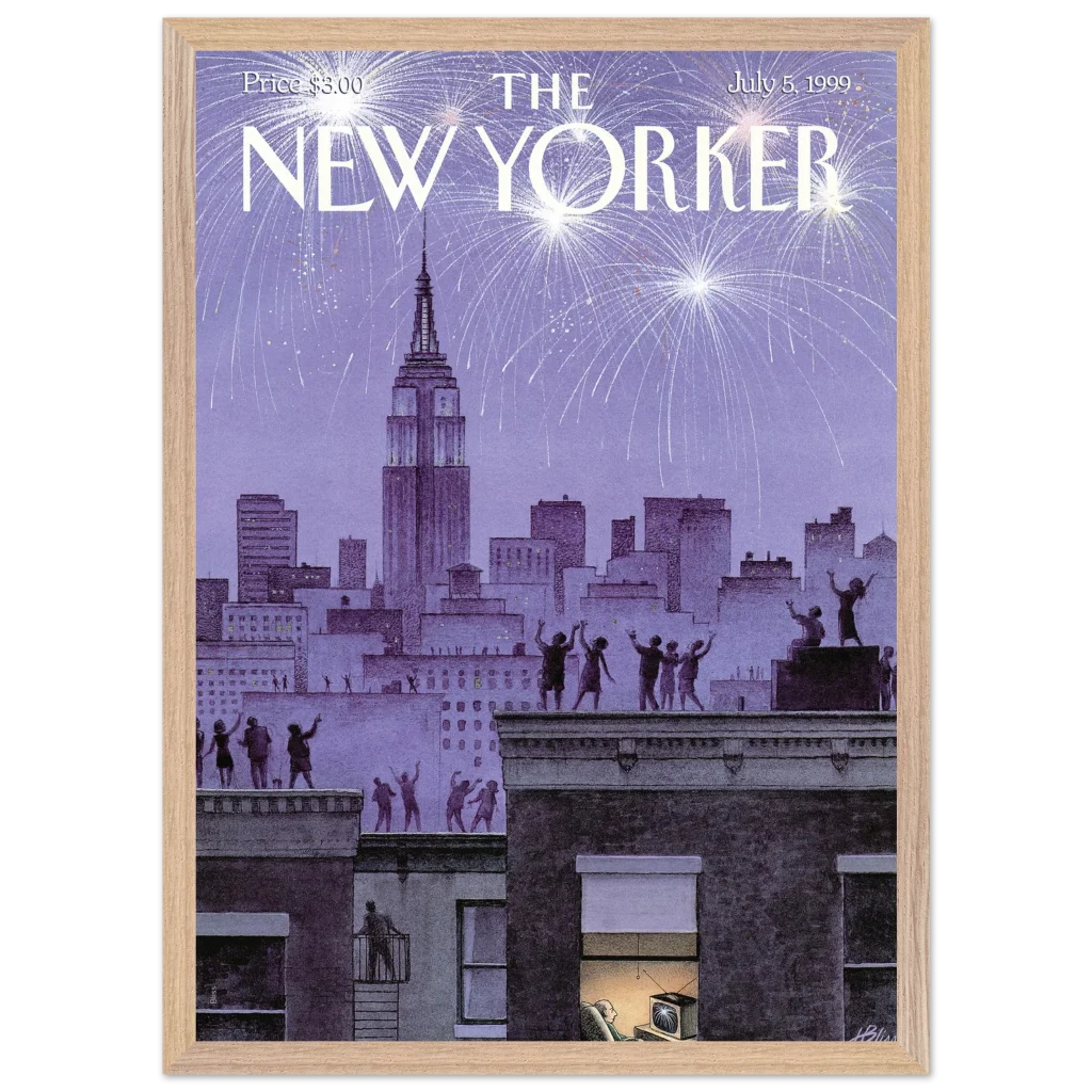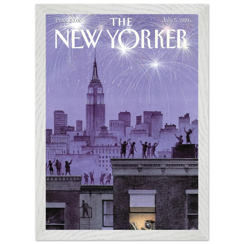 Capture the electric thrill of a New York City summer night with our ‘Midnight Fireworks’ framed poster. This iconic artwork, with its vibrant fireworks illuminating the city skyline and joyful rooftop revelers, evokes a sense of shared wonder and urban magic. A lone figure watching TV adds a touch of relatable charm, making this piece a captivating conversation starter for any space.