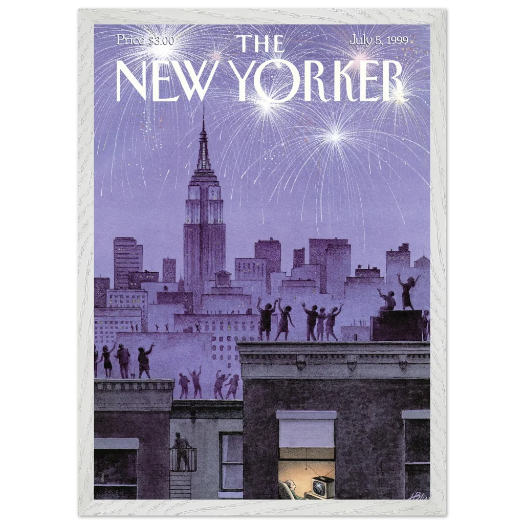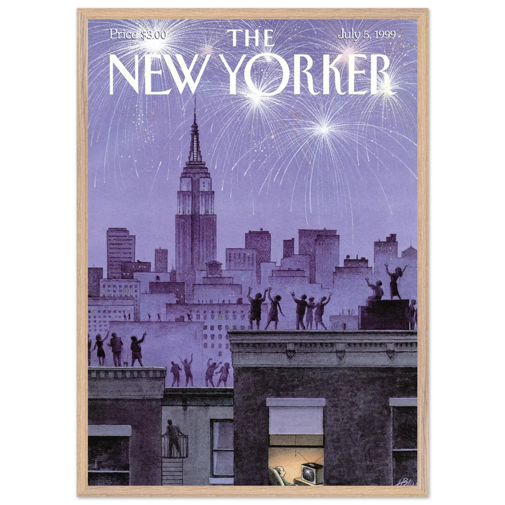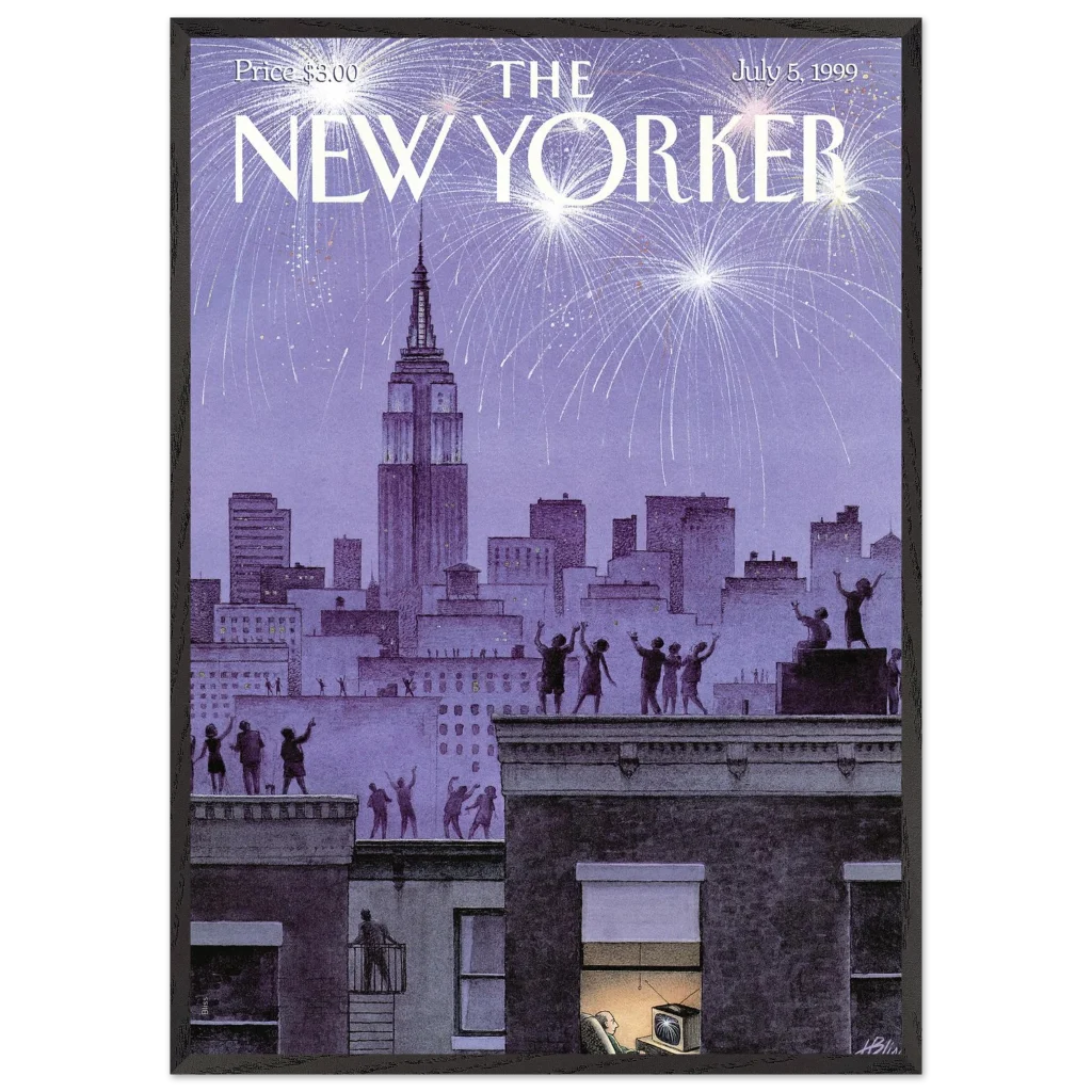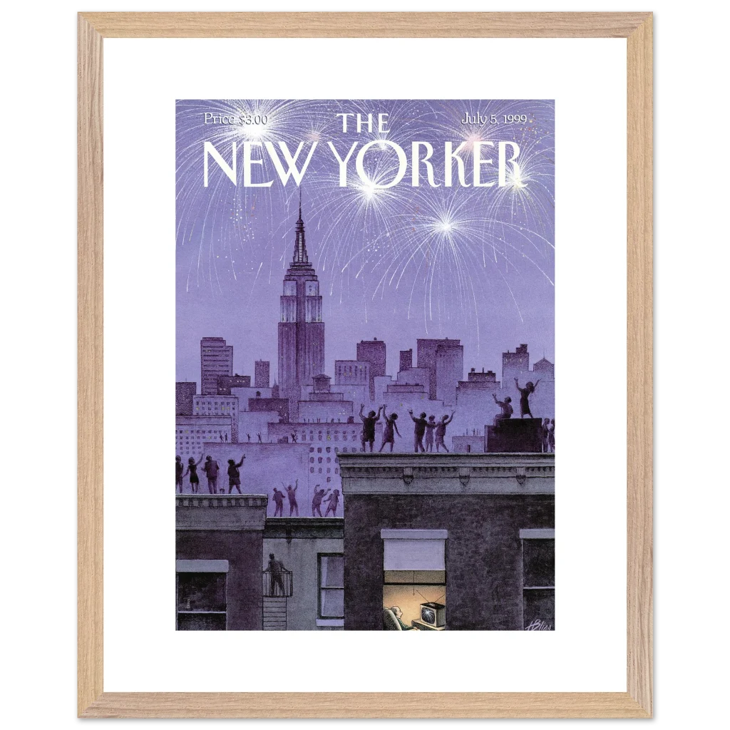 Capture the electric thrill of a New York City summer night with our ‘Midnight Fireworks’ framed poster. This iconic artwork, with its vibrant fireworks illuminating the city skyline and joyful rooftop revelers, evokes a sense of shared wonder and urban magic. A lone figure watching TV adds a touch of relatable charm, making this piece a captivating conversation starter for any space.