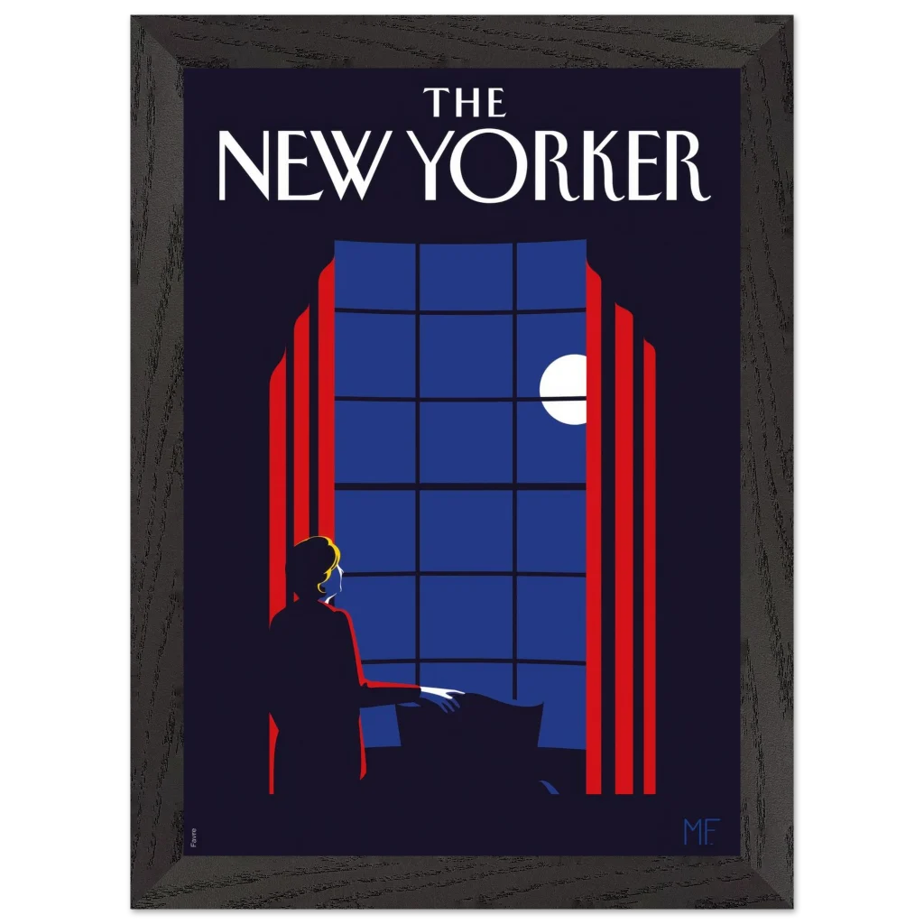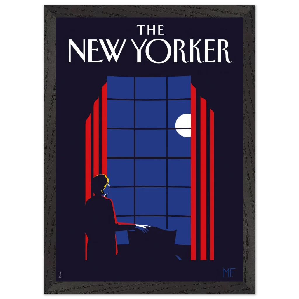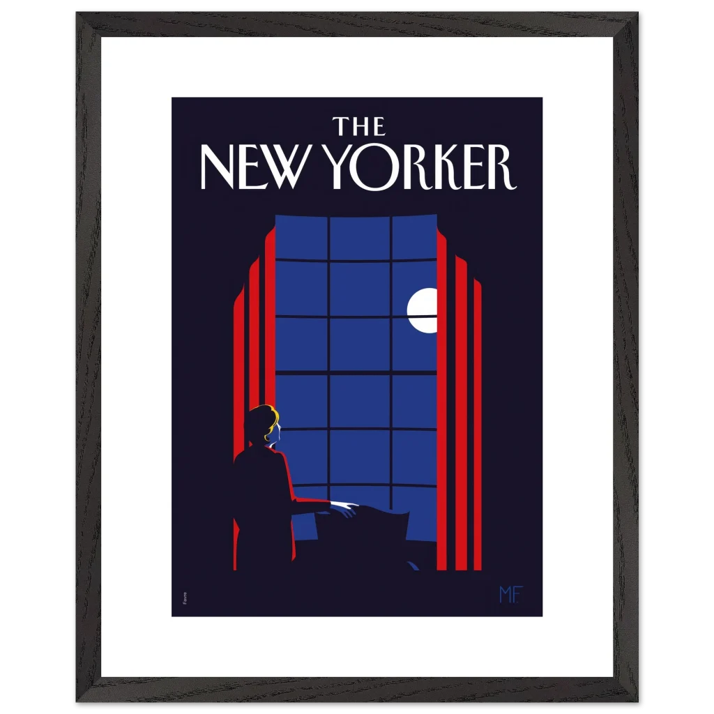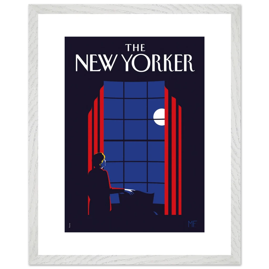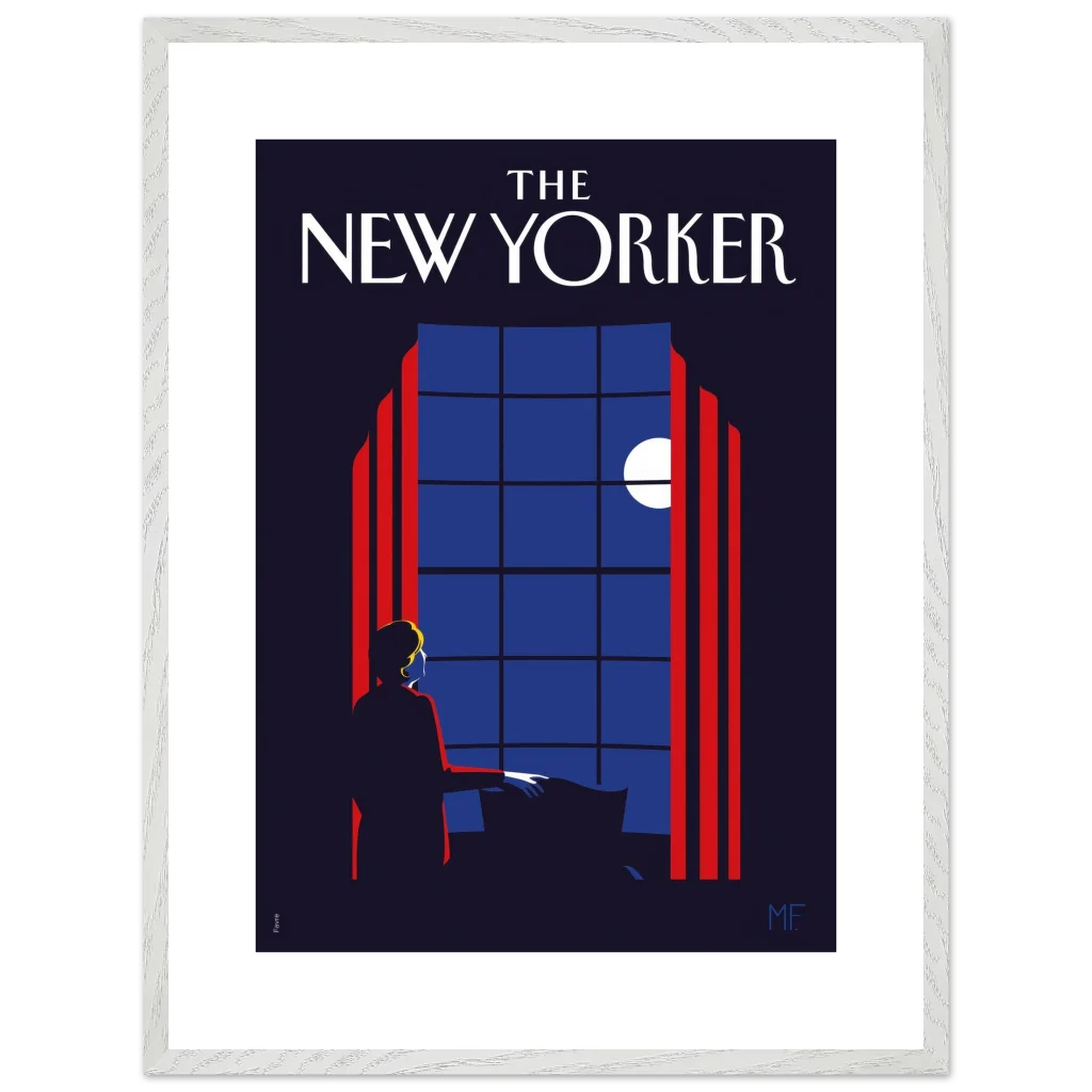 Capture the timeless elegance of a quiet evening with our “Midnight Serenade” framed poster, inspired by classic New Yorker covers. This captivating art deco piece, with its striking midnight blues and vibrant red accents, depicts a solitary figure gazing at the moonlit sky through a grand window. It’s an invitation to introspection and a touch of sophisticated charm for any room.