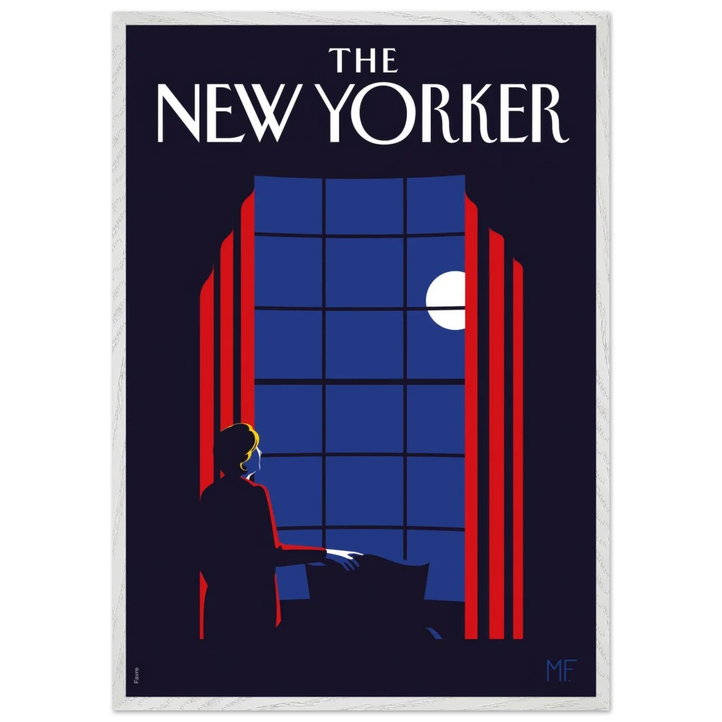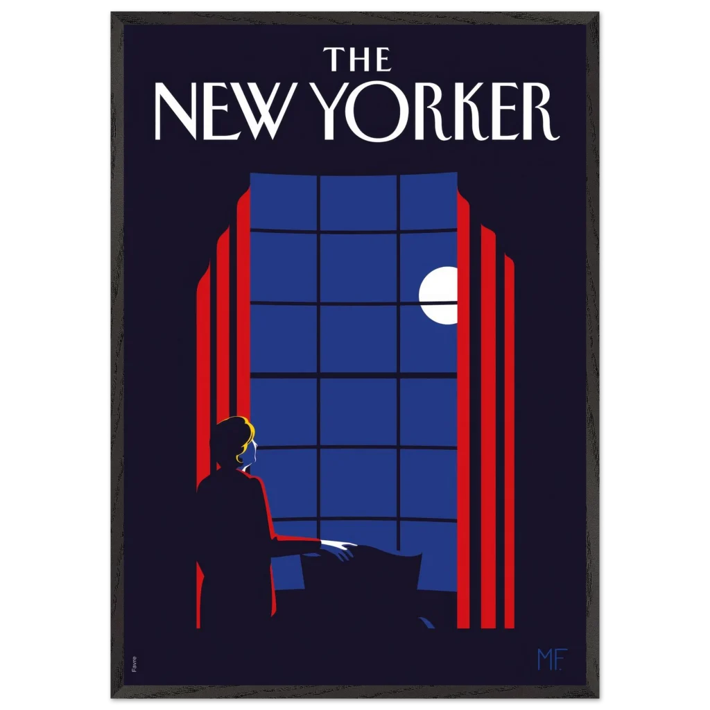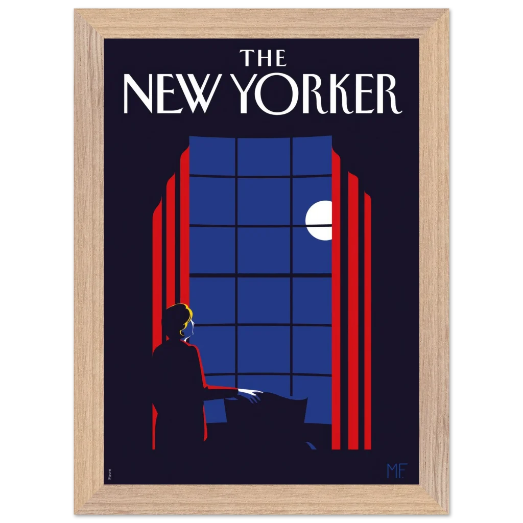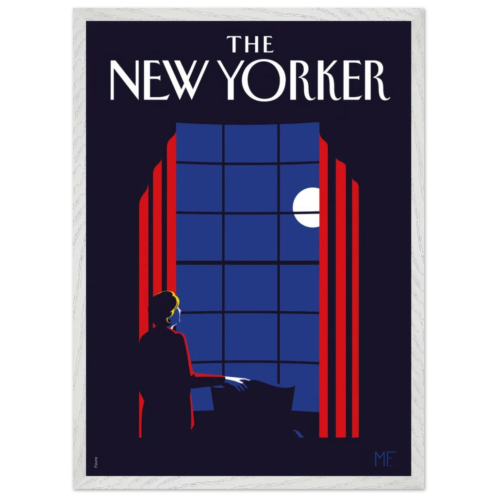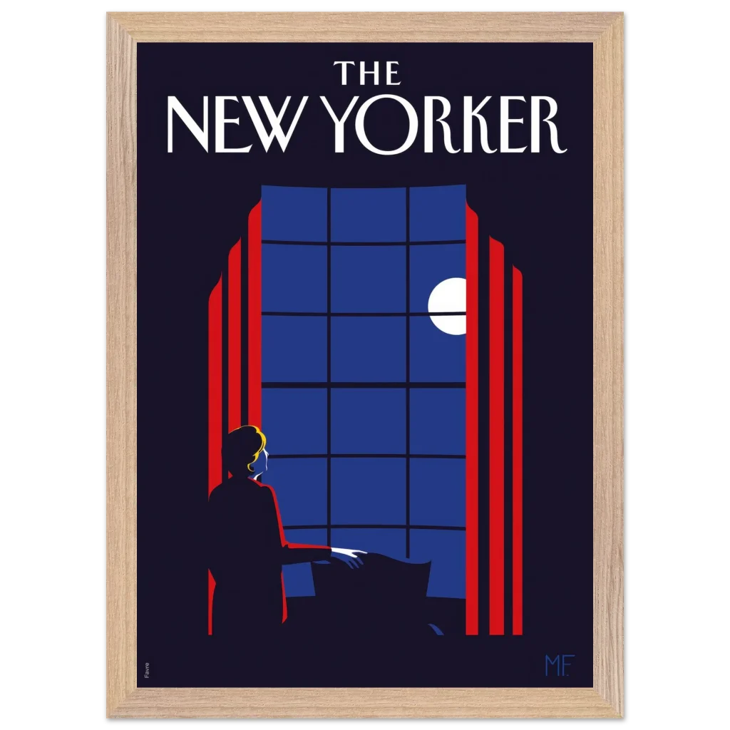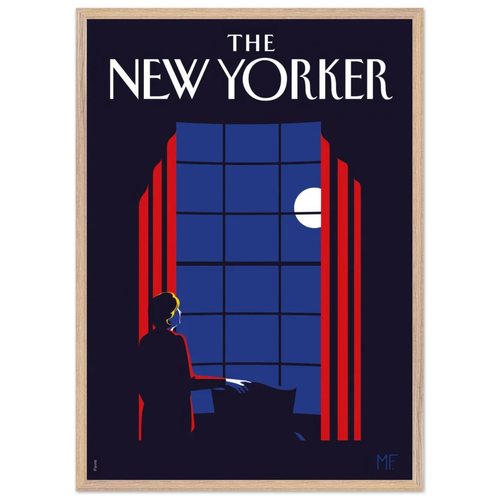 Capture the timeless elegance of a quiet evening with our “Midnight Serenade” framed poster, inspired by classic New Yorker covers. This captivating art deco piece, with its striking midnight blues and vibrant red accents, depicts a solitary figure gazing at the moonlit sky through a grand window. It’s an invitation to introspection and a touch of sophisticated charm for any room.