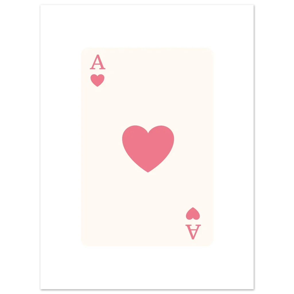 Bring a touch of whimsical charm and a hint of luck to your walls with our minimalist Ace of Hearts poster. Featuring a clean, crisp design in a delightful pastel pink against a creamy background, this print offers a fresh, modern aesthetic that’s perfect for adding personality to any space. It’s an ideal choice for card game enthusiasts, romantics, or anyone who appreciates playful yet sophisticated decor.