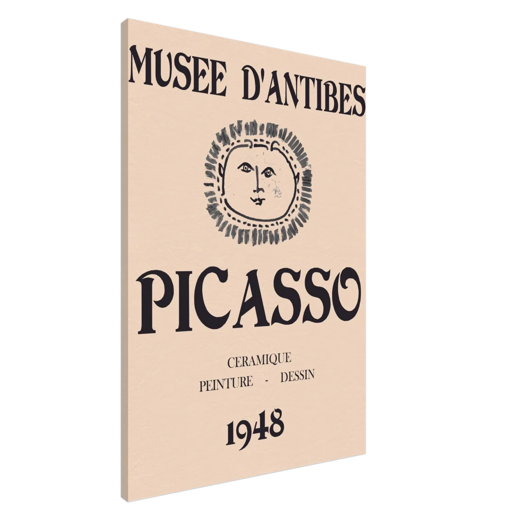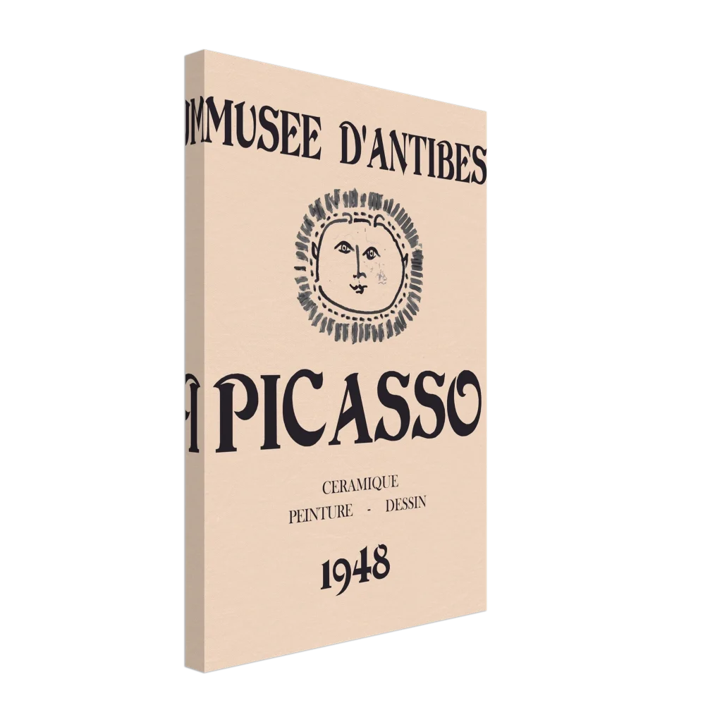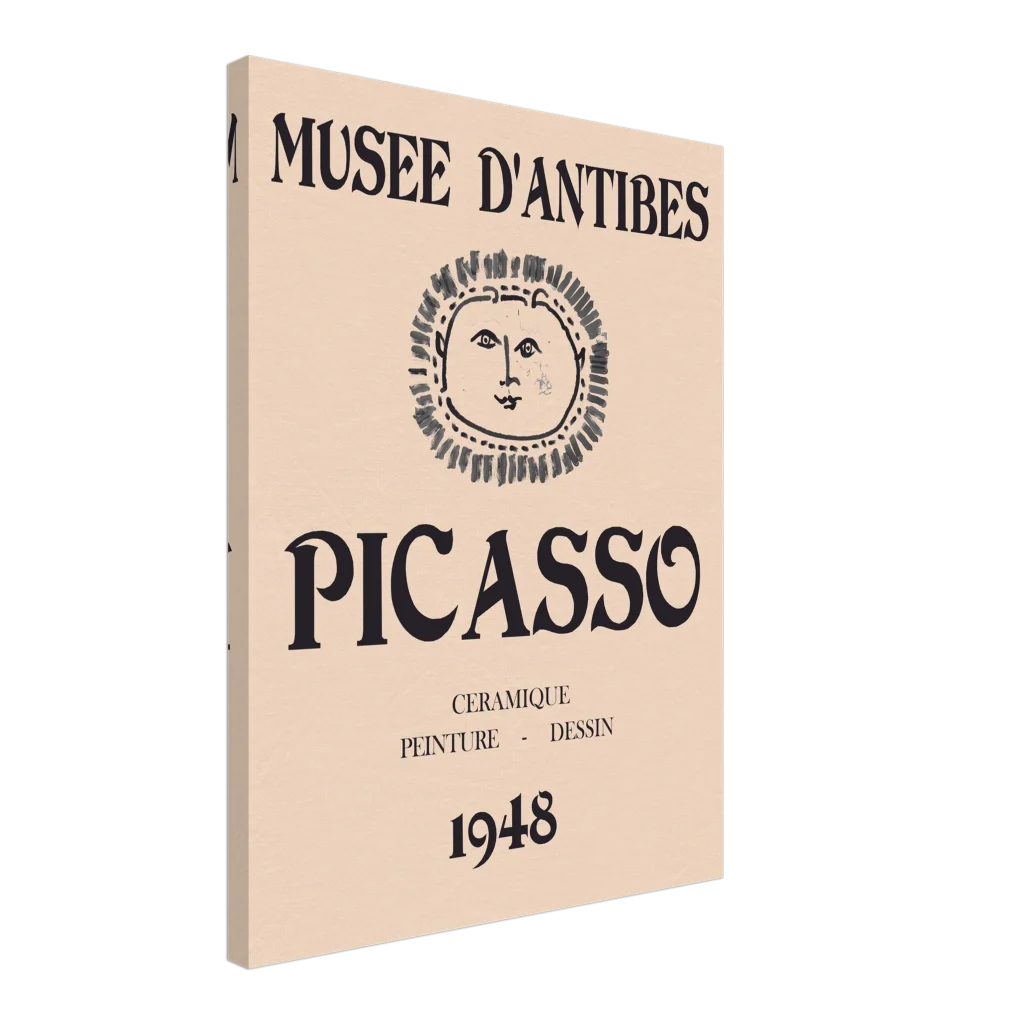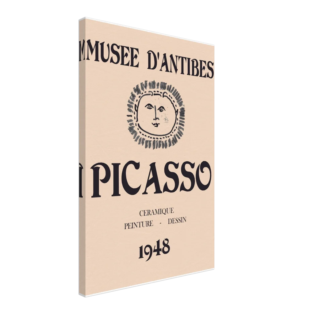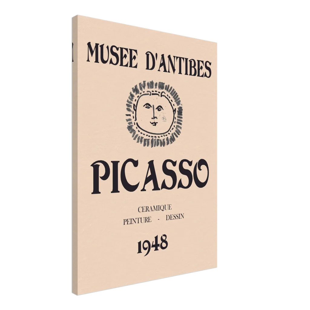Immerse yourself in the timeless allure of modern art with our exclusive canvas print, featuring a minimalist rendition of a classic Picasso exhibition poster from the Musée d’Antibes. The iconic sun face and bold typography evoke a sophisticated, vintage aesthetic perfect for any art enthusiast. This canvas print transforms any room into a gallery, offering enhanced texture and enduring beauty that captures the spirit of 1948.