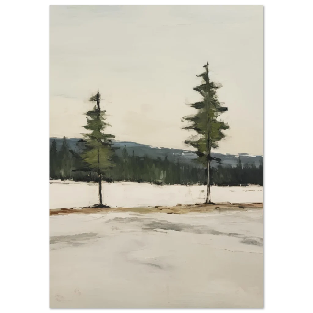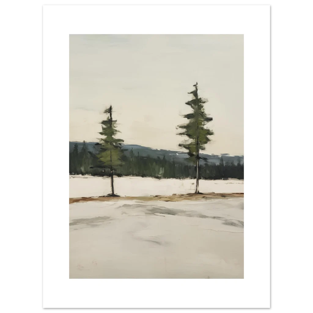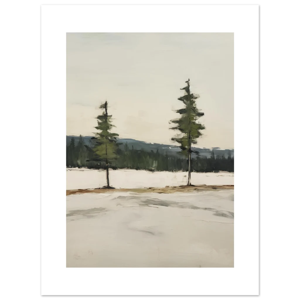 Bring the peaceful tranquility of a winter landscape into your home with this stunning art print. Featuring two solitary evergreens standing gracefully against a muted sky and snow-dusted ground, this piece captures a serene and contemplative mood with its expressive brushstrokes and earthy palette. Perfect for creating a calming atmosphere in any room, this poster offers a timeless aesthetic that complements a variety of decor styles, from modern minimalist to rustic charm.