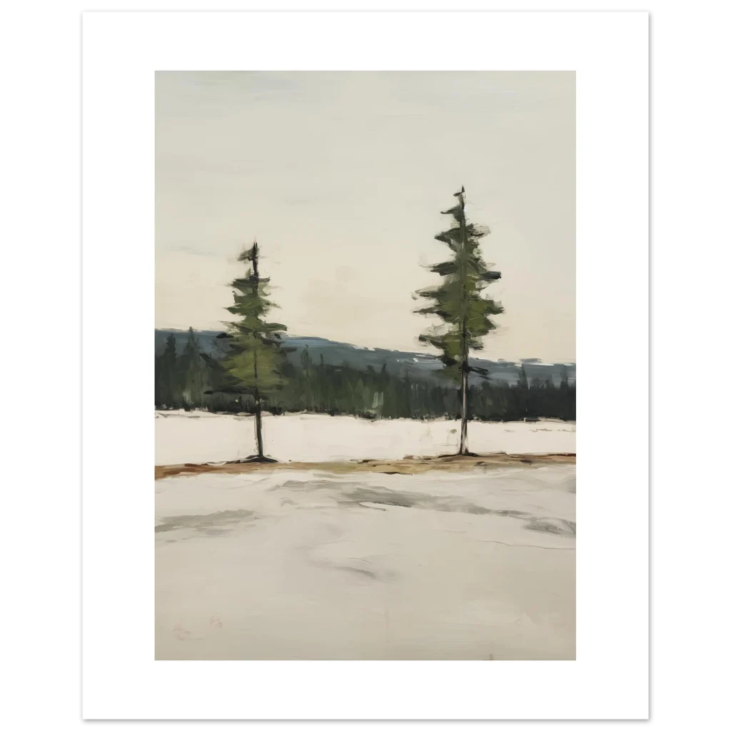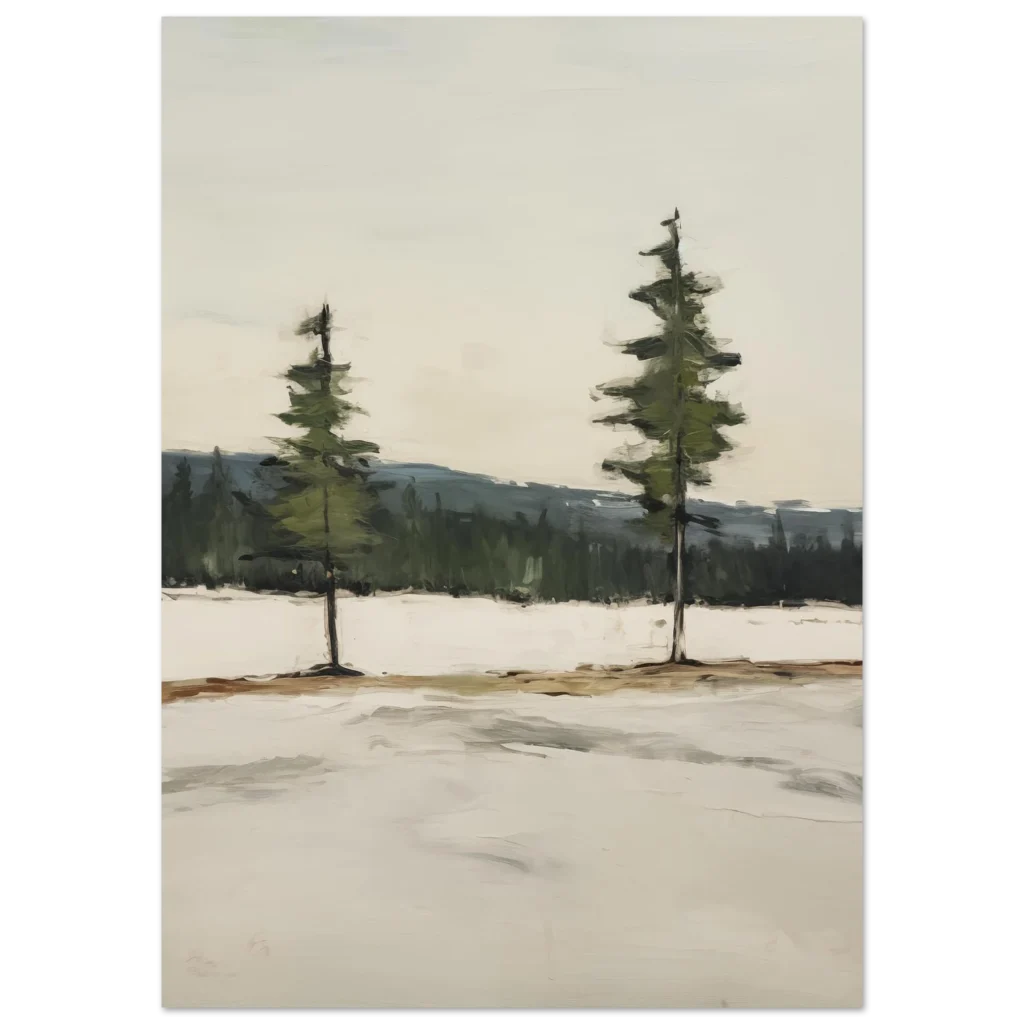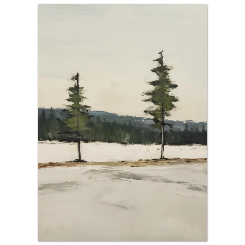 Bring the peaceful tranquility of a winter landscape into your home with this stunning art print. Featuring two solitary evergreens standing gracefully against a muted sky and snow-dusted ground, this piece captures a serene and contemplative mood with its expressive brushstrokes and earthy palette. Perfect for creating a calming atmosphere in any room, this poster offers a timeless aesthetic that complements a variety of decor styles, from modern minimalist to rustic charm.
