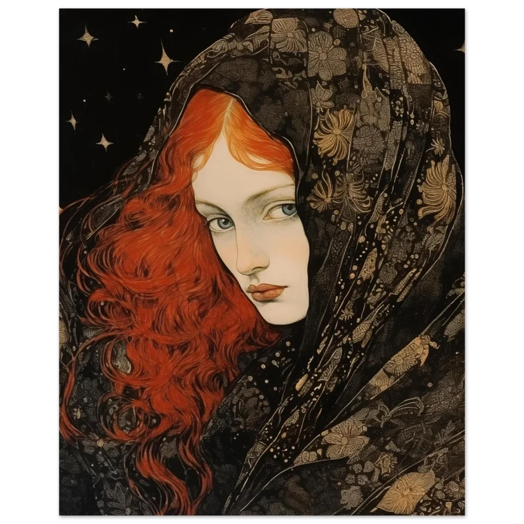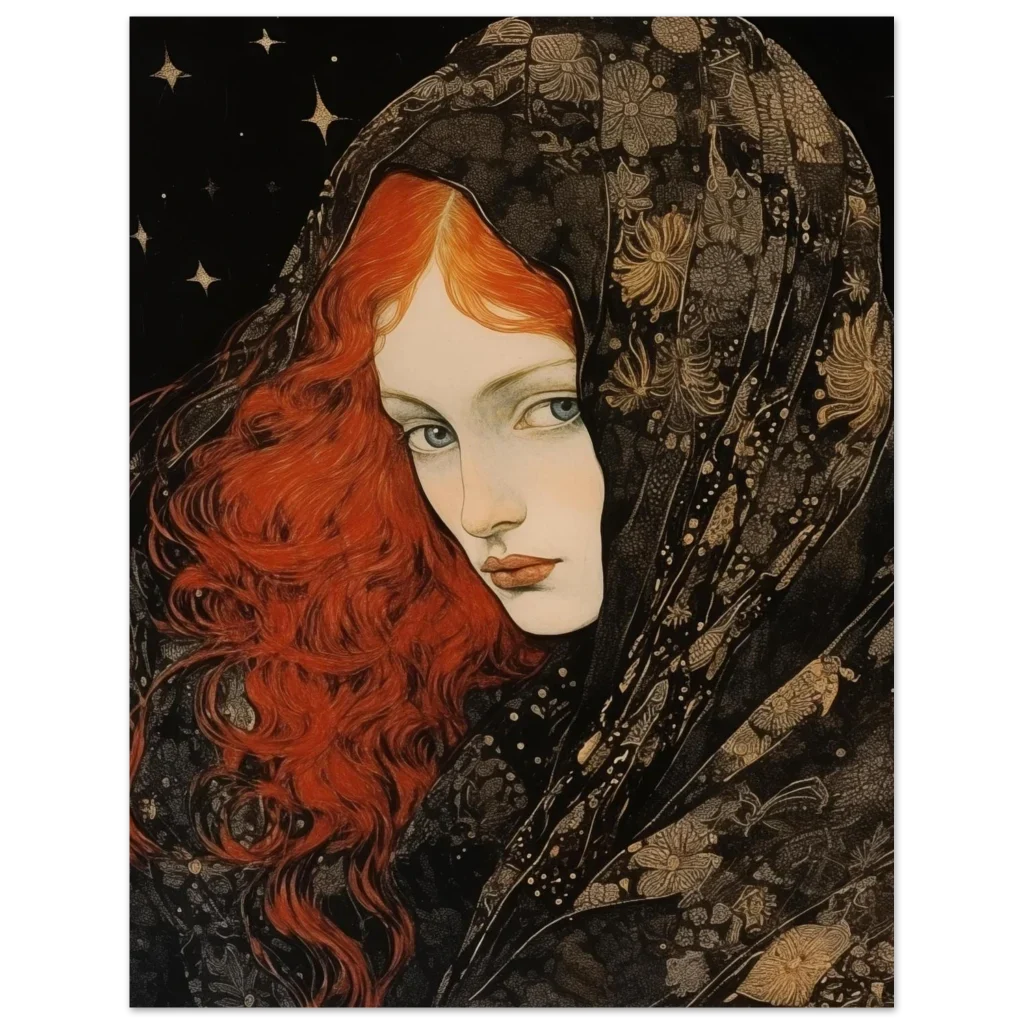 Unveil a captivating gaze and fiery allure with our ‘Mystic Red-Haired Woman’ poster. This artwork, reminiscent of Pre-Raphaelite grace intertwined with ethereal mystery, brings an enigmatic beauty to any space. The rich tones and intricate details, from the flowing red hair to the patterned shroud and subtle starlight, are rendered with breathtaking clarity on our premium matte paper.