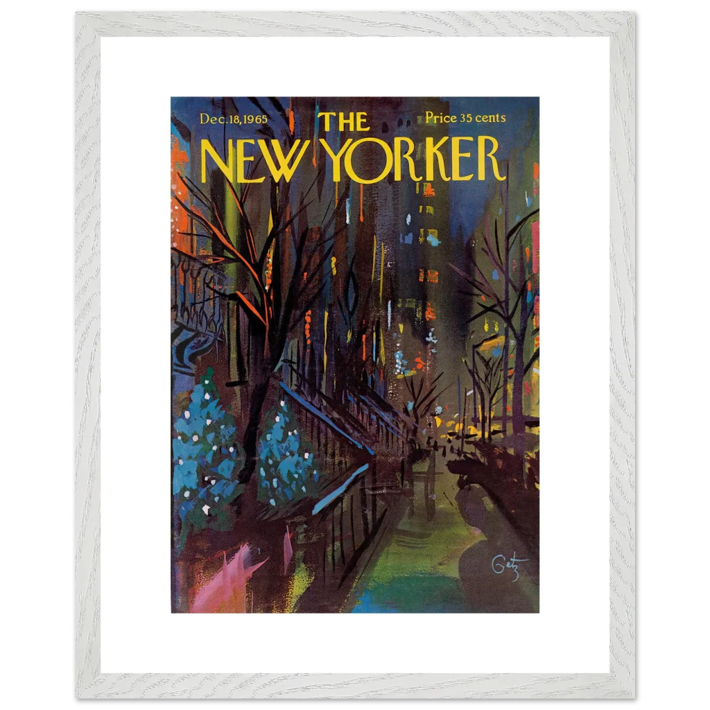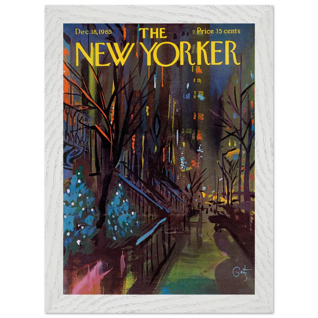 Capture the timeless allure of a New York City winter twilight with this stunning framed poster, featuring the iconic December 18, 1965, New Yorker cover art. Its rich, moody blues and vibrant pops of orange, yellow, and turquoise perfectly evoke the chic, sophisticated atmosphere of the season. This abstract masterpiece, with its impressionistic street scene and subtle holiday cheer, will add a touch of vintage elegance and metropolitan charm to any space, inviting contemplation and conversation.