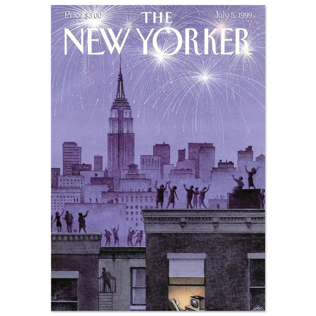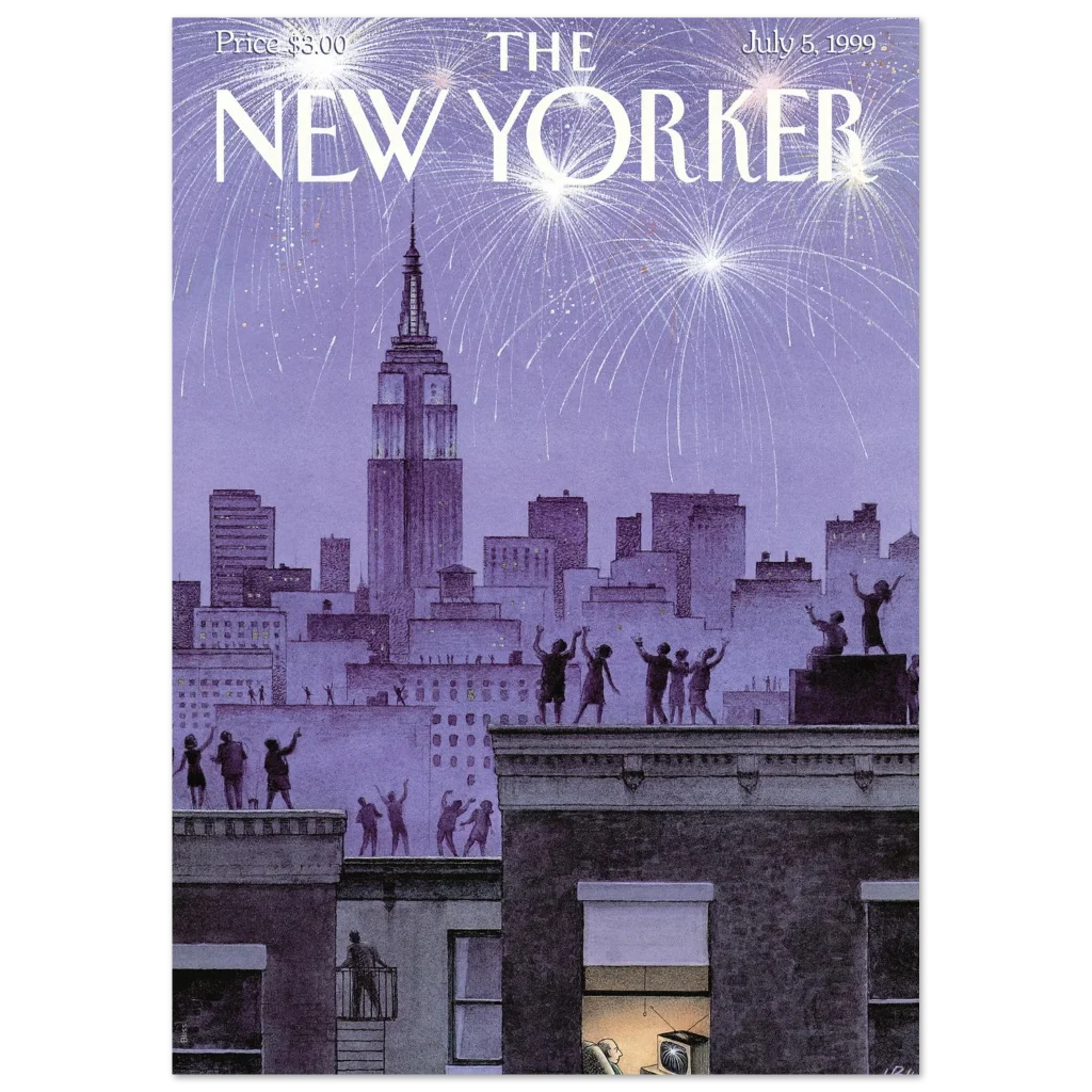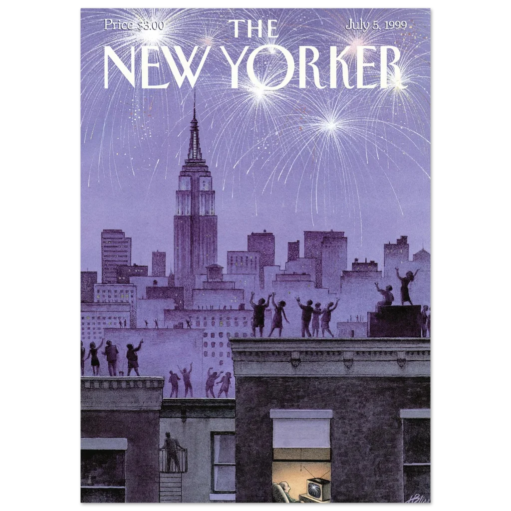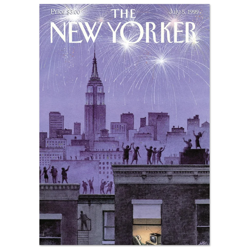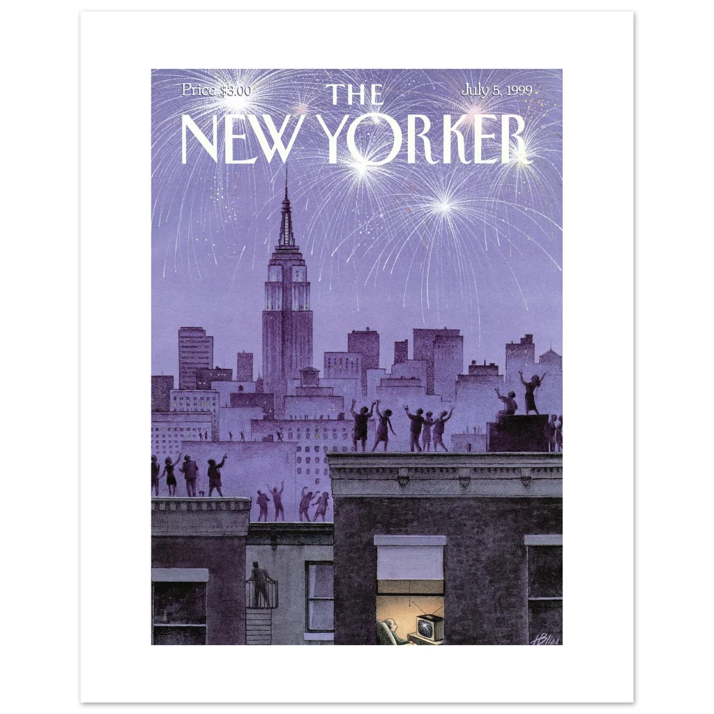 Capture the enchanting spirit of a New York summer night with this captivating poster, featuring a cityscape bathed in the soft glow of distant fireworks. It’s a whimsical scene that evokes both joyous celebration and quiet contemplation, perfect for adding a touch of urban charm and nostalgic wonder to any space.