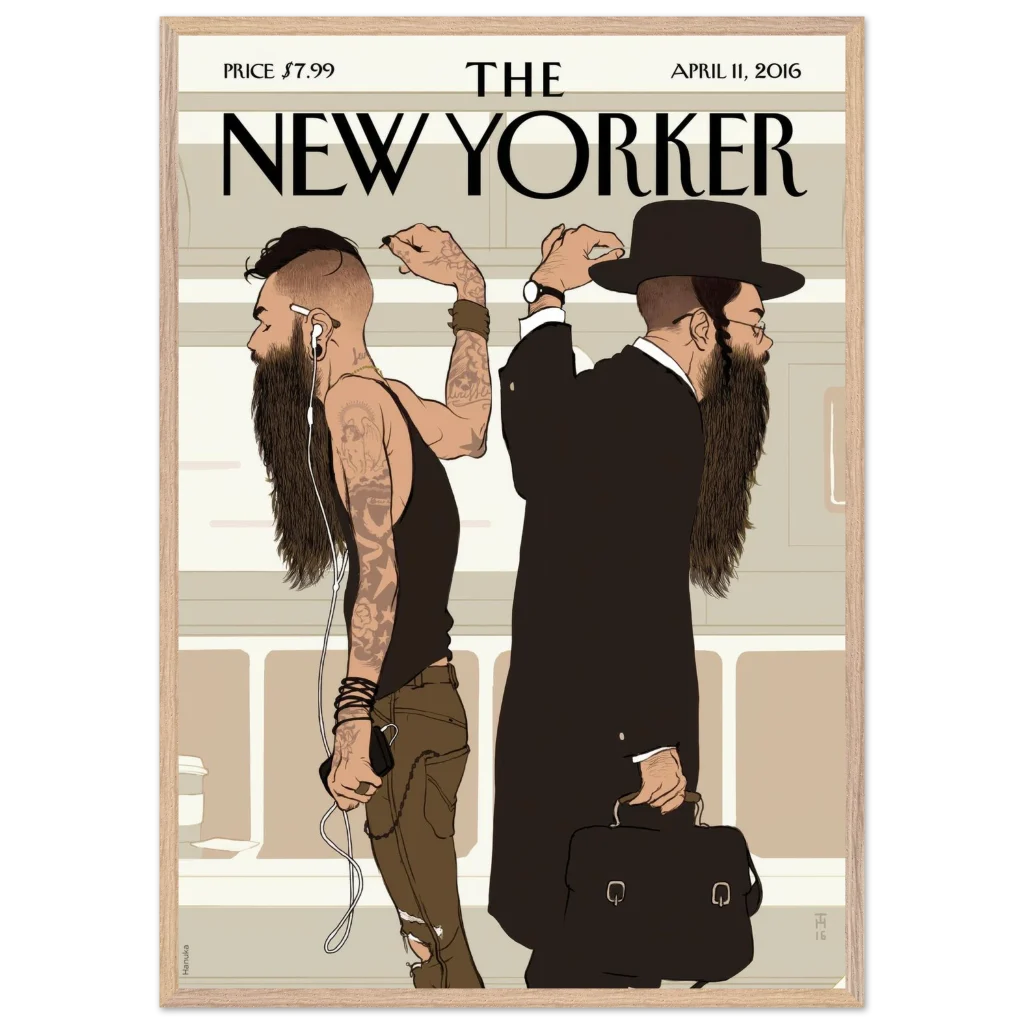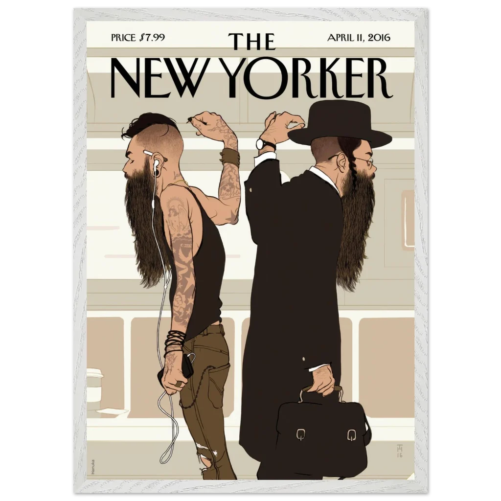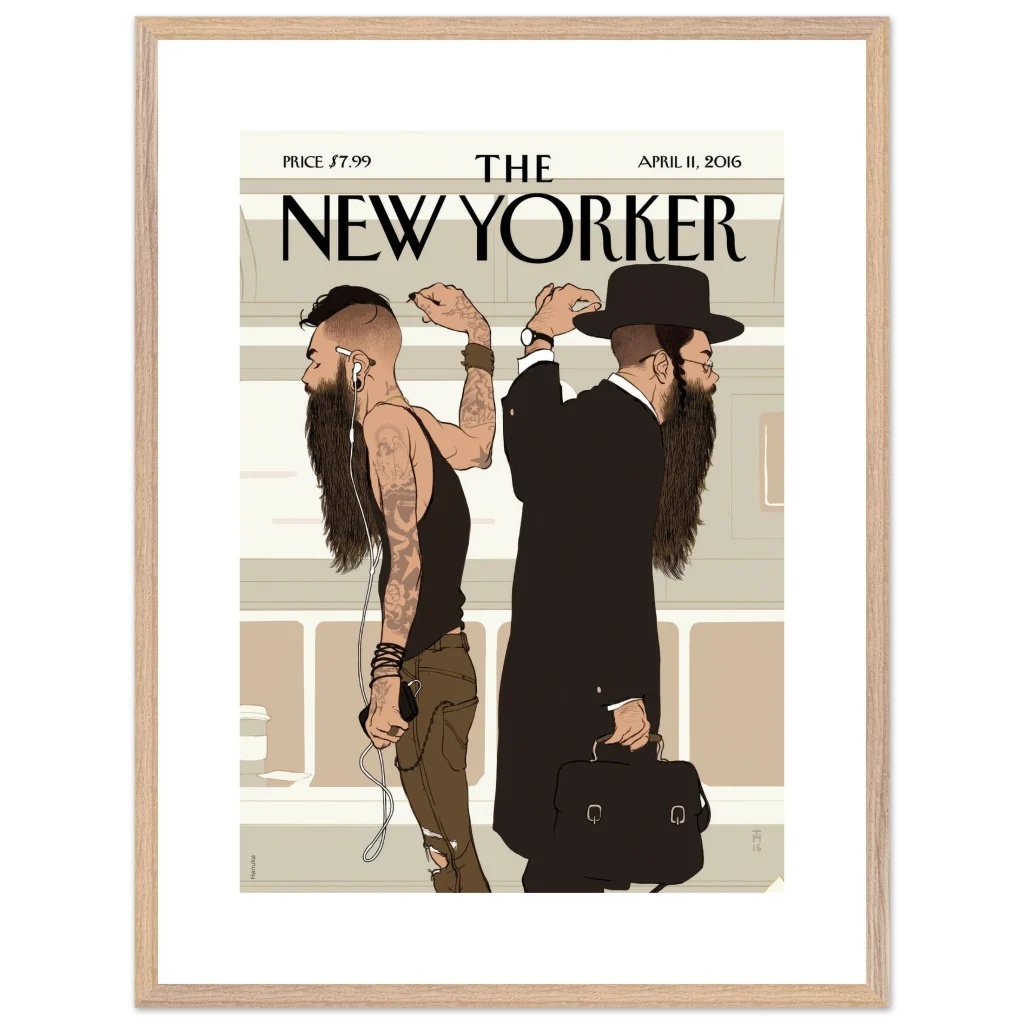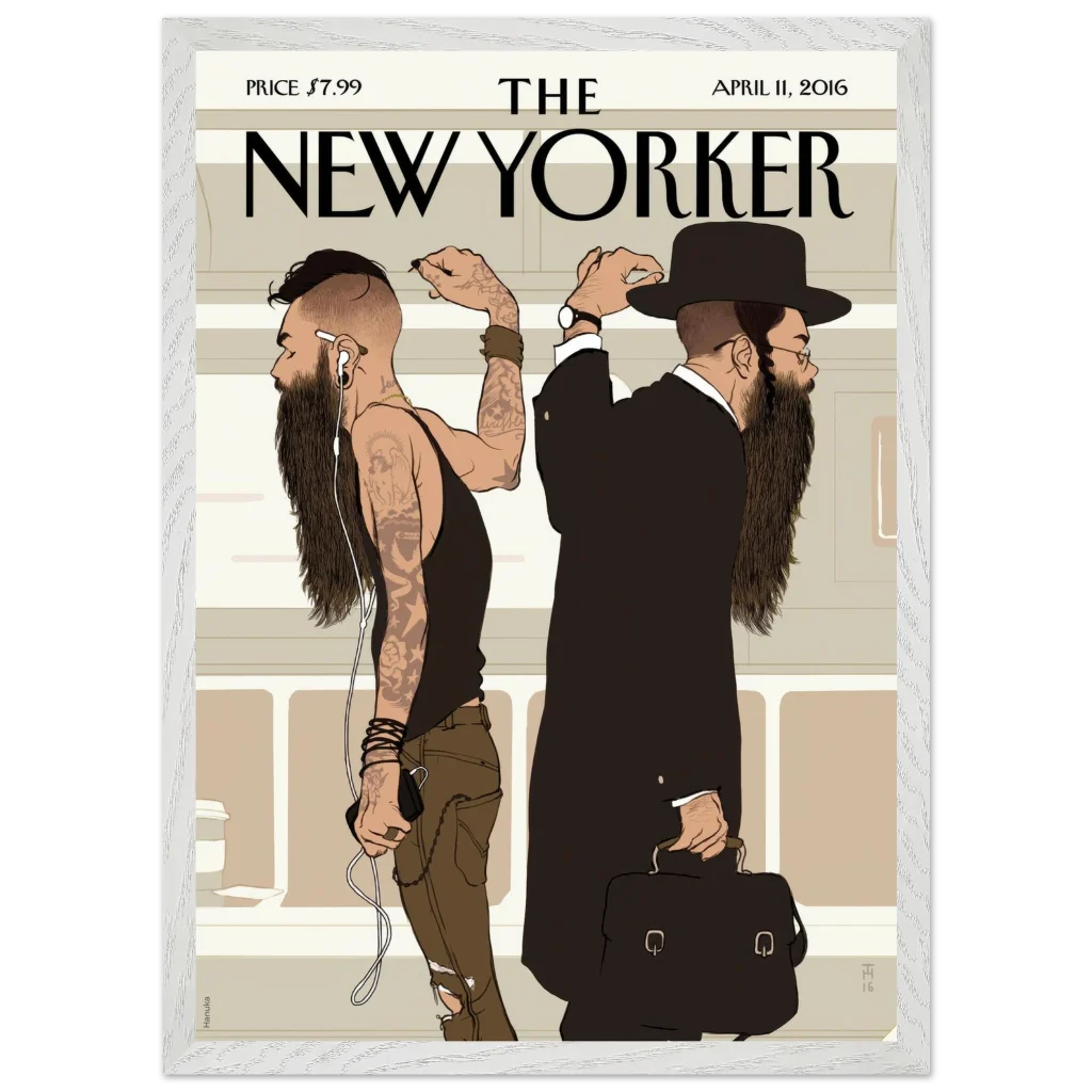 Capture the compelling narrative of urban life with this iconic New Yorker ‘Beards’ cover art. This thought-provoking illustration, rich in cultural contrast, brings a sophisticated yet striking visual statement to any space. Perfect for the discerning art lover or anyone who appreciates the subtle complexities of modern society, this premium framed poster offers a unique conversation starter and a timeless piece of contemporary art for your home or office.