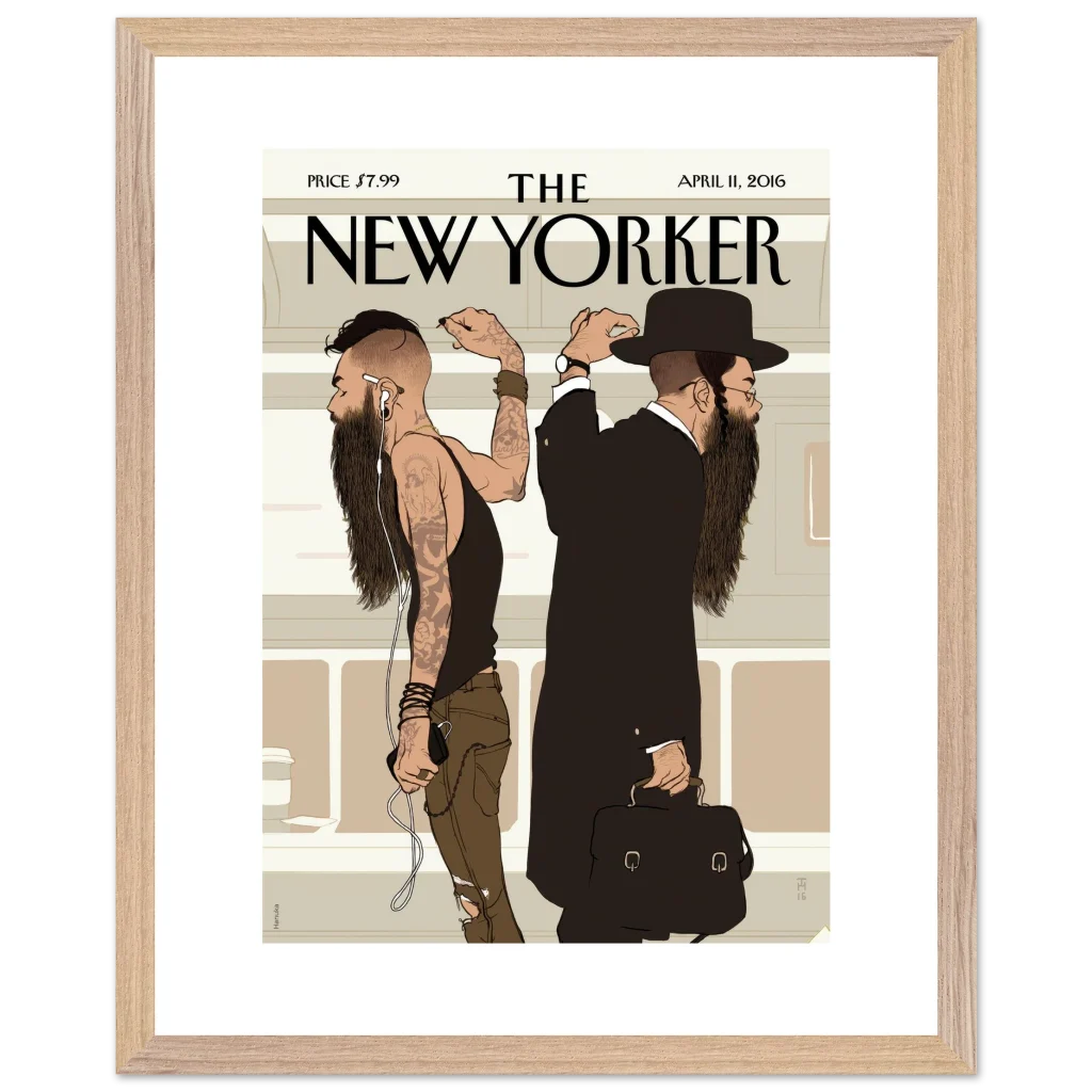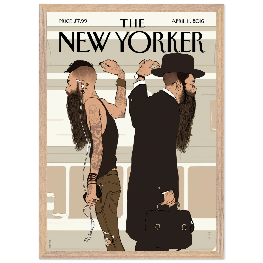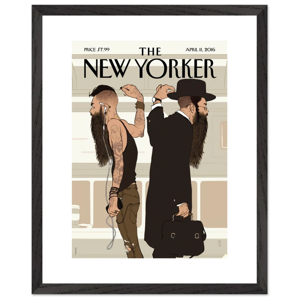 New Yorker ‘Beards’ Cover Wall Art – Cultural Contrast Illustration Premium Wooden Framed Poster with Matte Paper