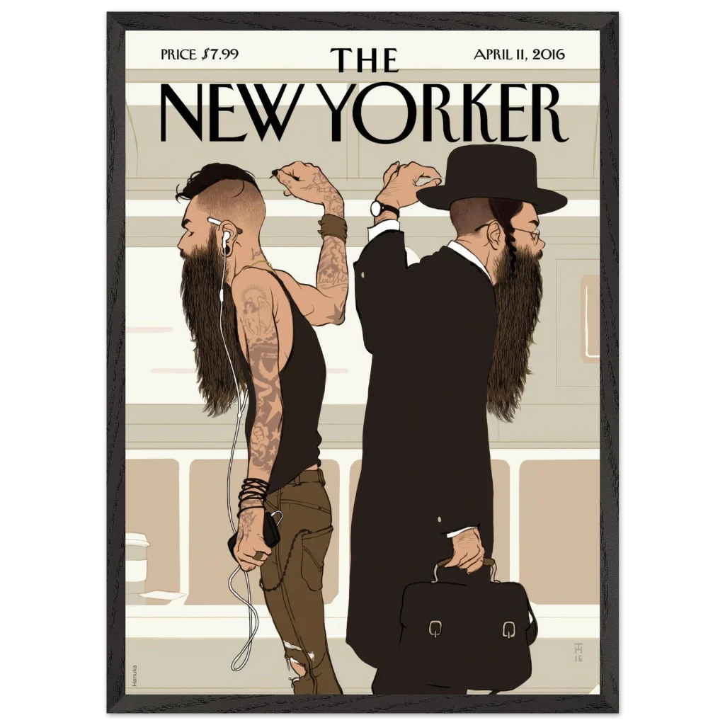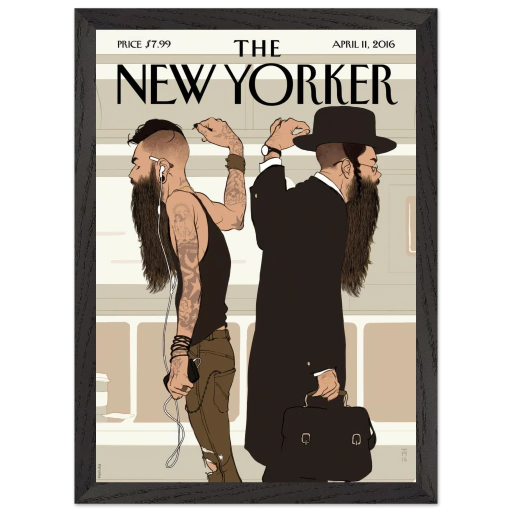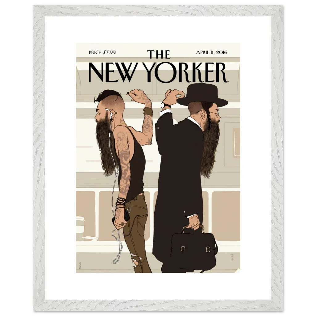 New Yorker ‘Beards’ Cover Wall Art – Cultural Contrast Illustration Premium Wooden Framed Poster with Matte Paper