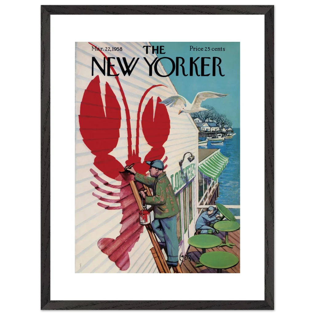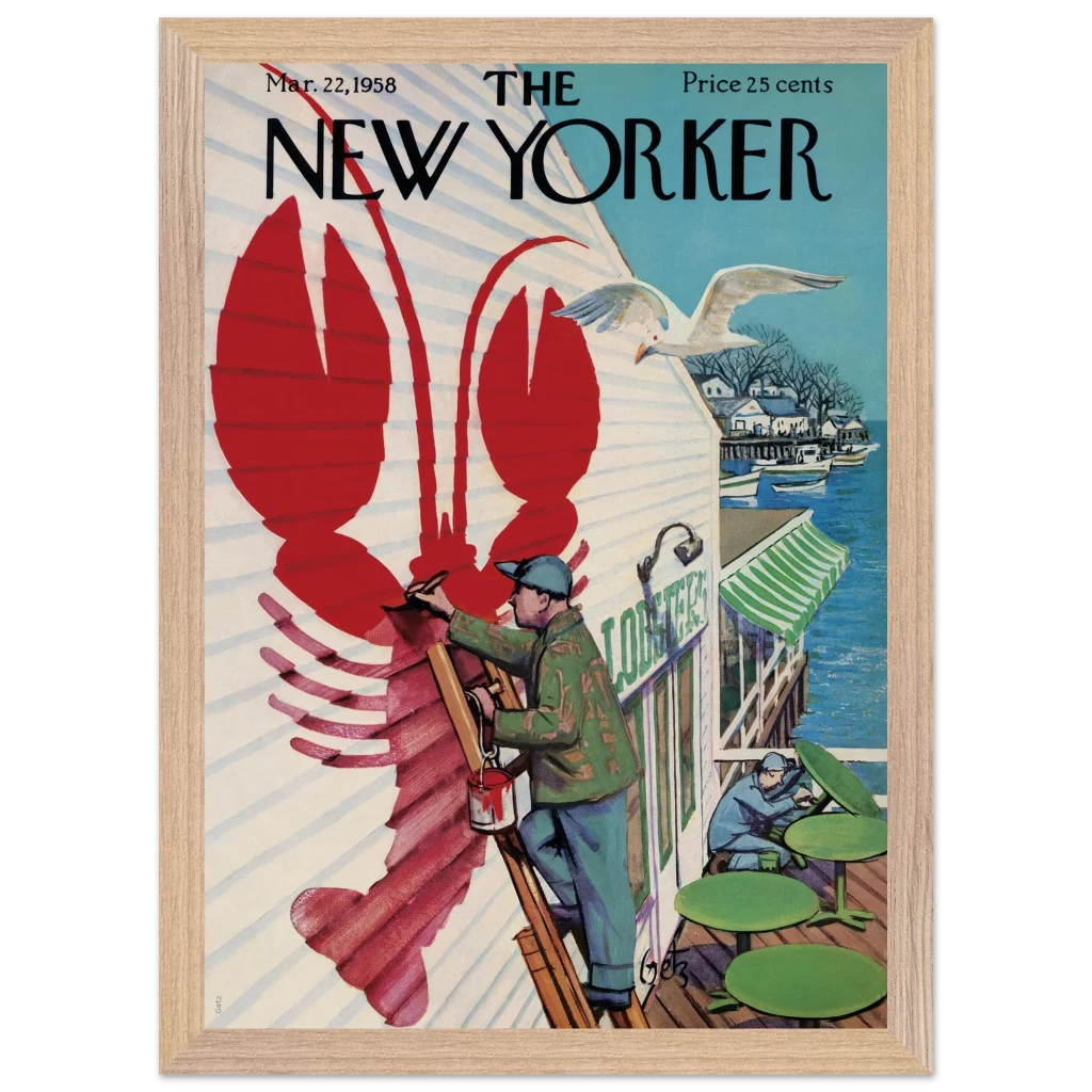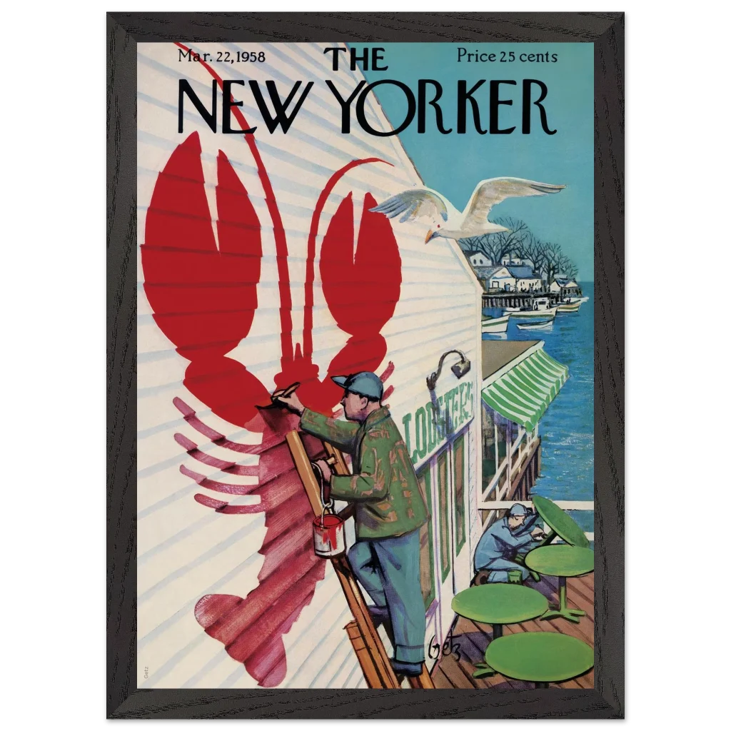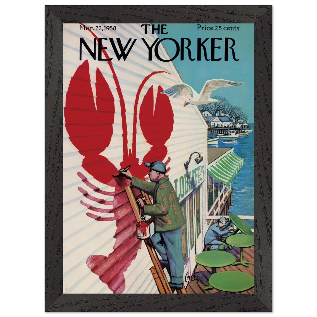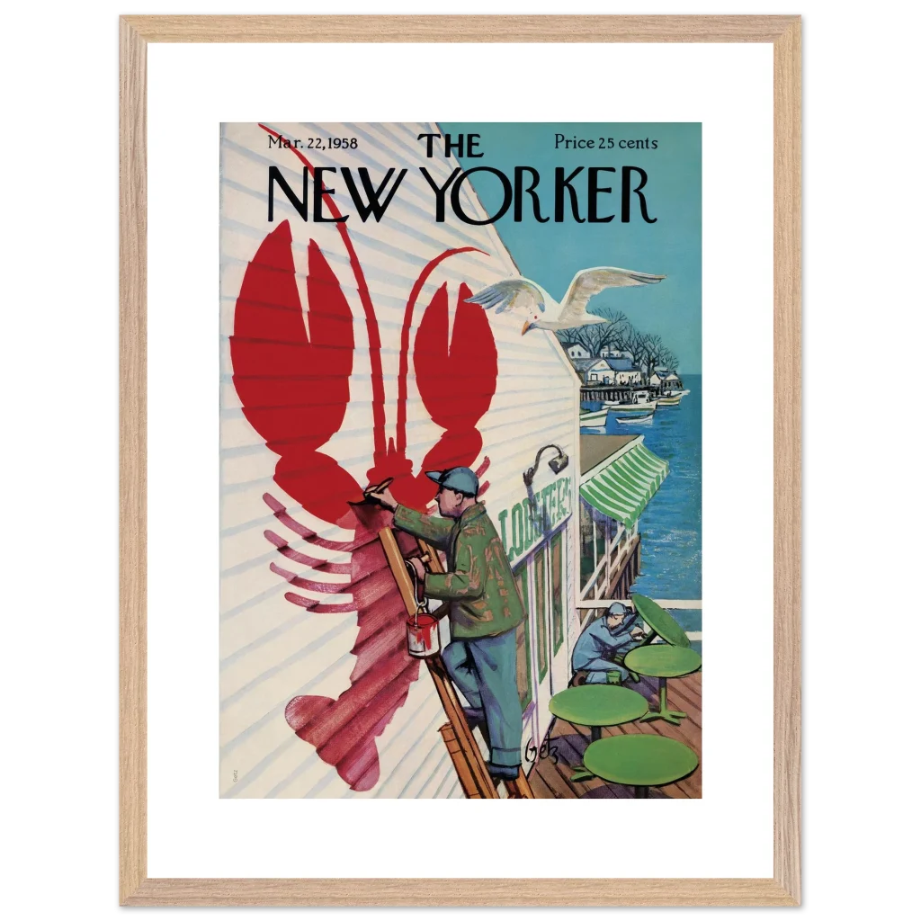Bring the charm of coastal life and a touch of mid-century nostalgia into your home with this iconic New Yorker cover art. Featuring a whimsical scene of a fisherman painting a vibrant red lobster, this piece captures a playful yet serene seaside mood, perfect for adding character to any room. It’s a delightful nod to classic illustration and a celebration of timeless Americana.