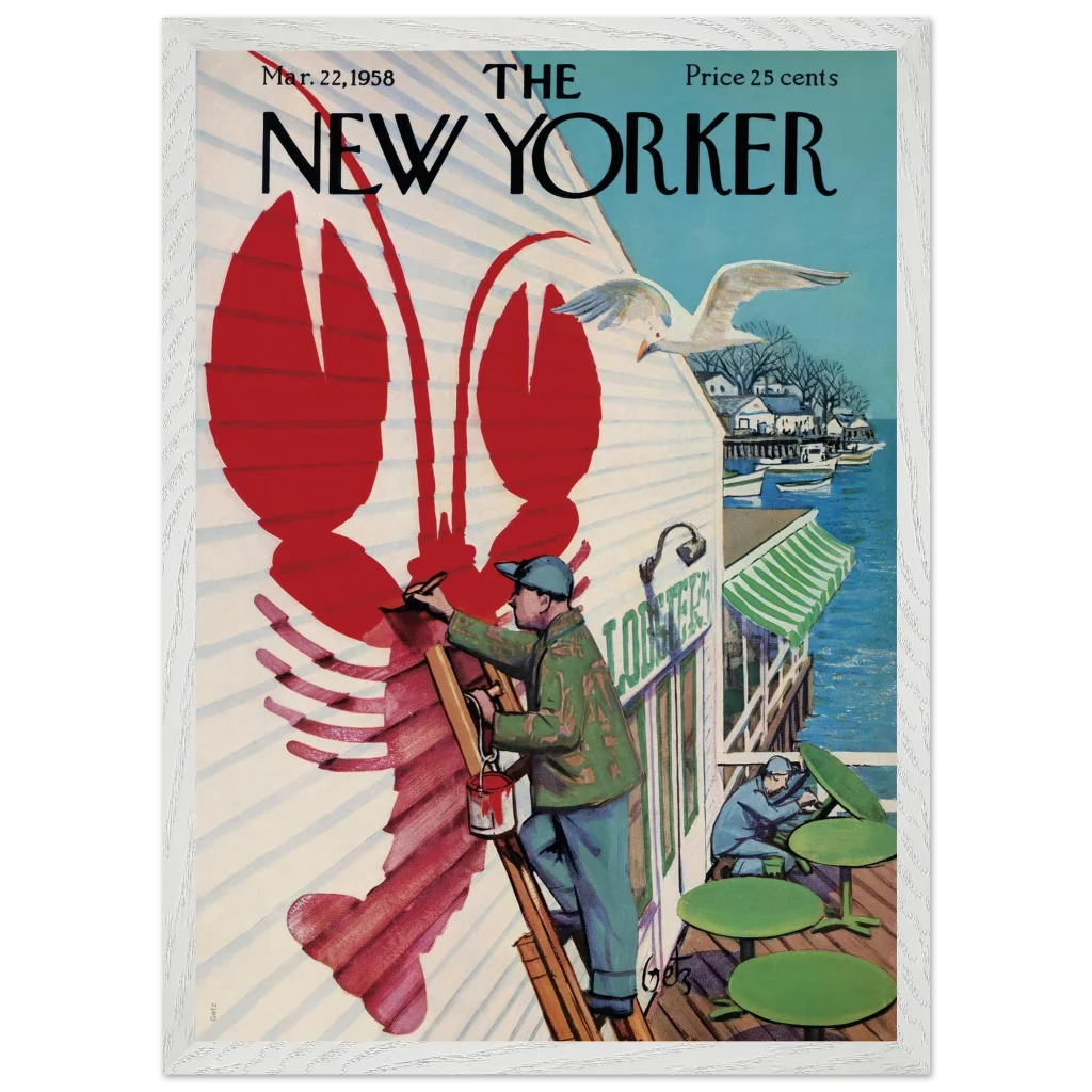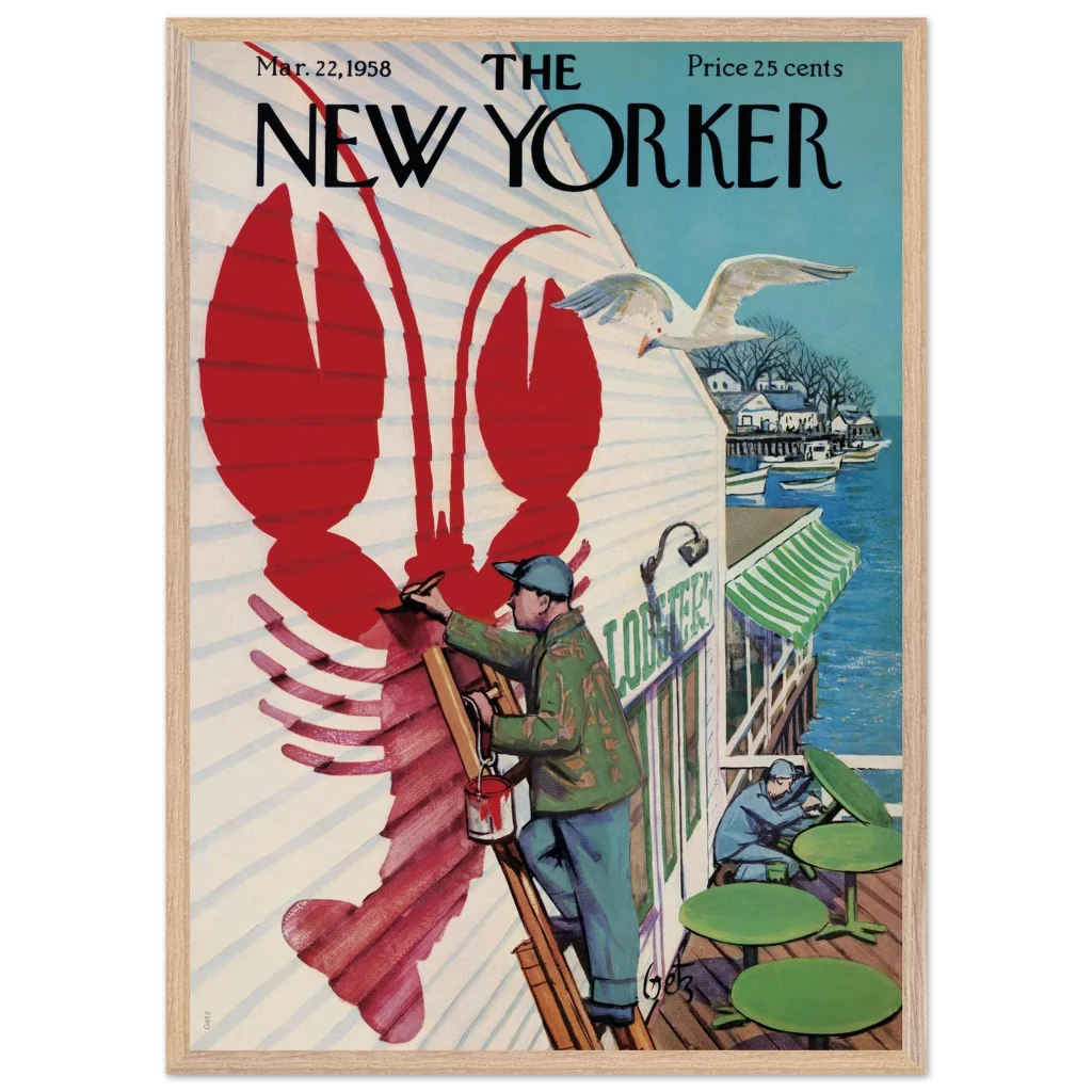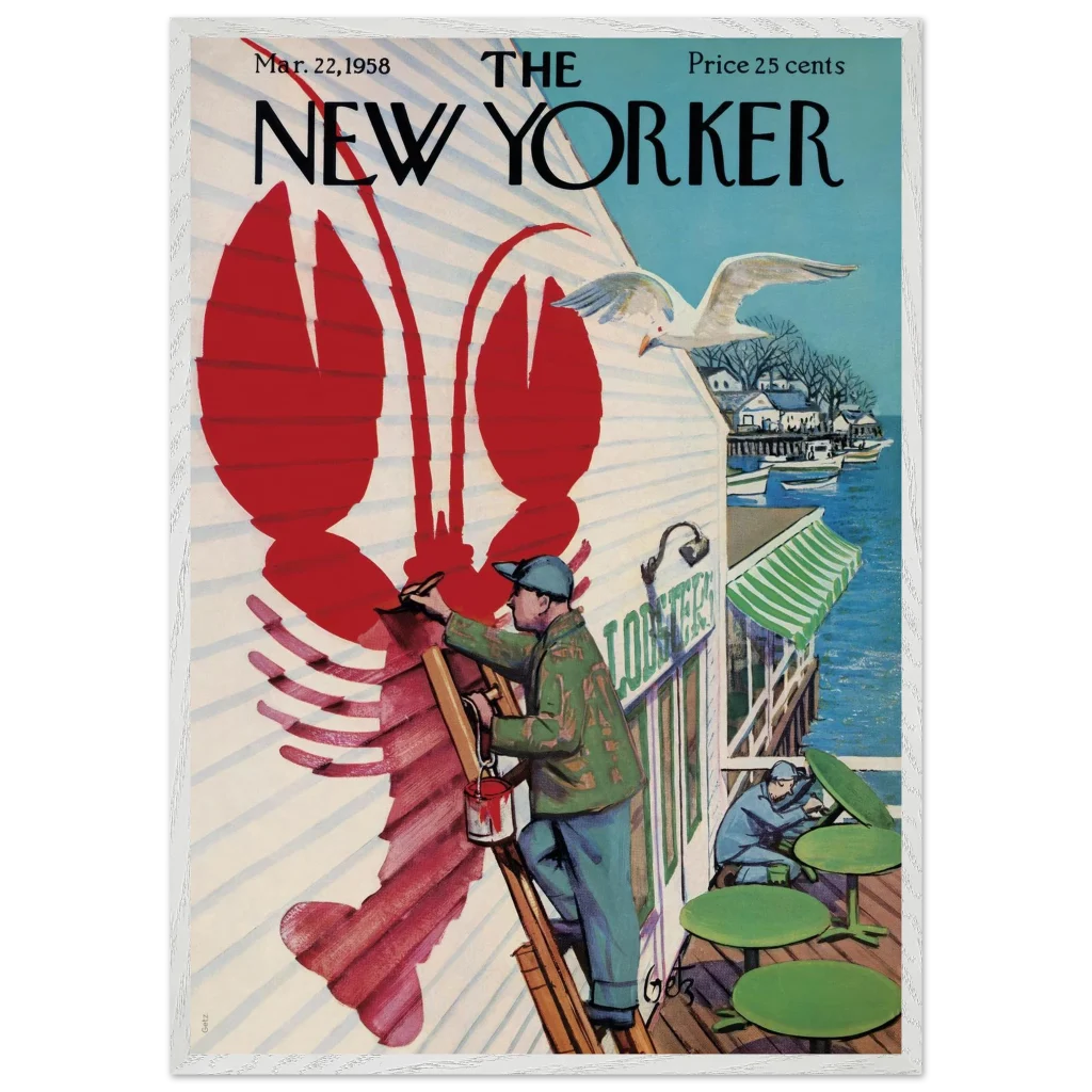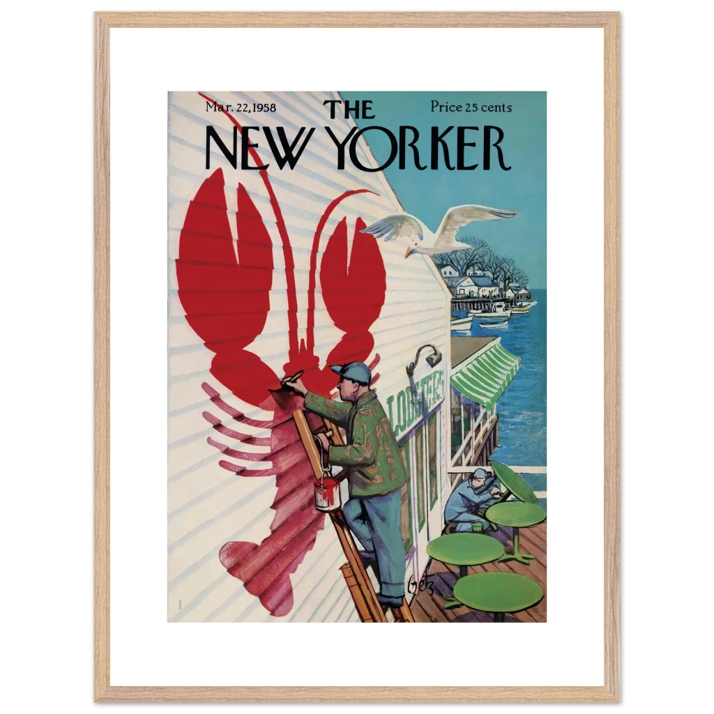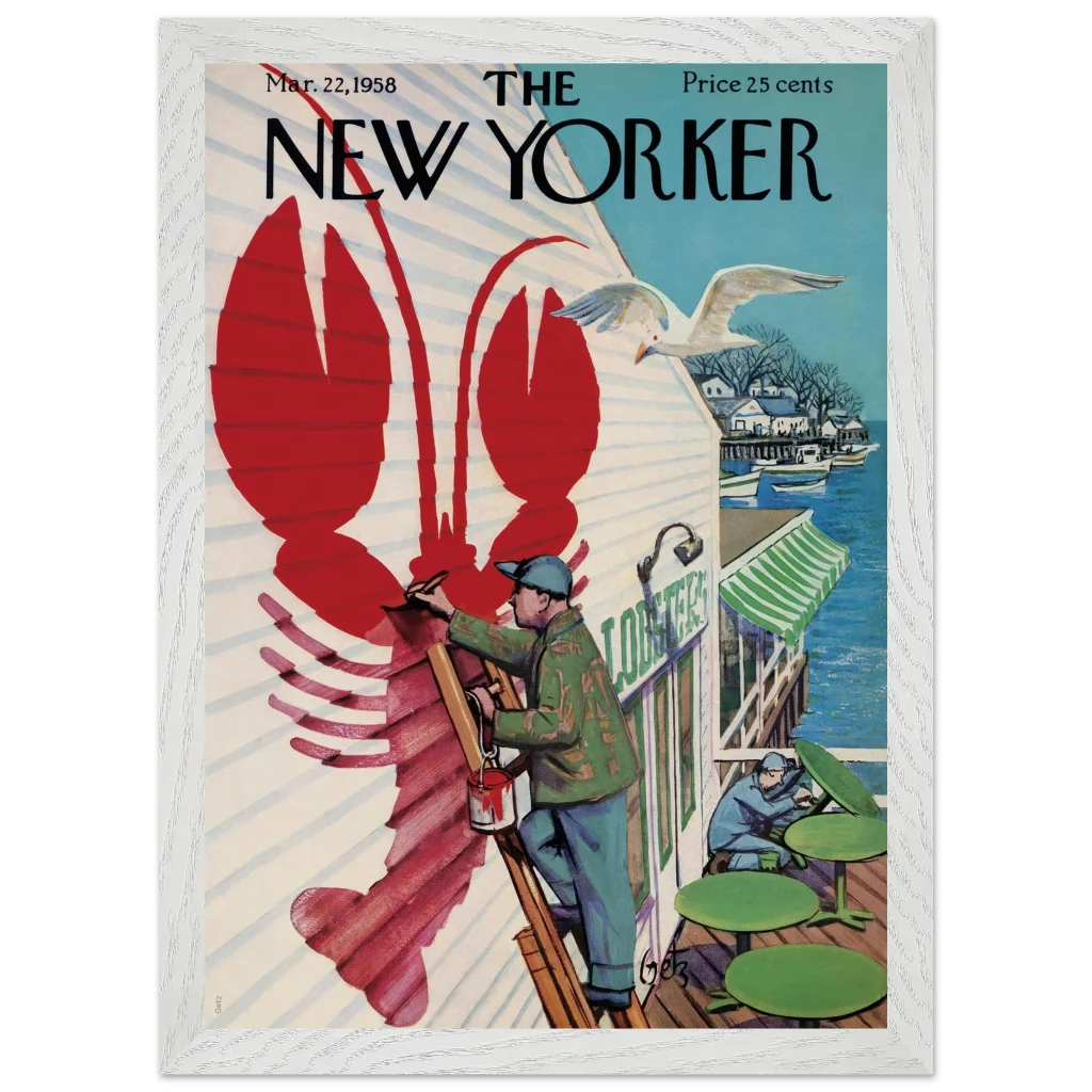 Bring the charm of coastal life and a touch of mid-century nostalgia into your home with this iconic New Yorker cover art. Featuring a whimsical scene of a fisherman painting a vibrant red lobster, this piece captures a playful yet serene seaside mood, perfect for adding character to any room. It’s a delightful nod to classic illustration and a celebration of timeless Americana.