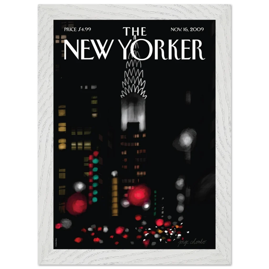 Capture the timeless allure of a New York City night with this stunning framed poster, featuring the iconic November 16, 2009, New Yorker cover. This artwork brings the dynamic energy and enchanting glow of the city to your space, with its impressionistic depiction of the Chrysler Building and vibrant streetlights. It’s an ideal piece for urban art enthusiasts and anyone looking to infuse their home with a touch of metropolitan sophistication.