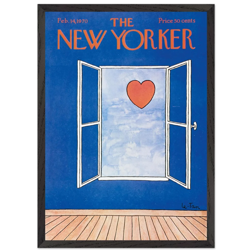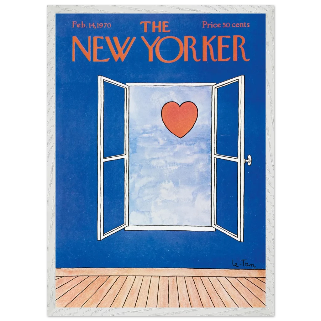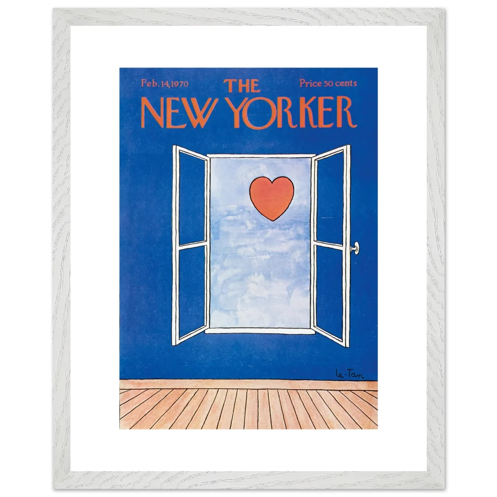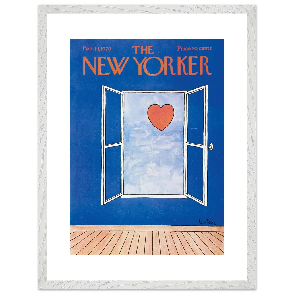 Capture a timeless moment of romance with this iconic New Yorker cover art, ‘Love Beyond the Window’ from February 14, 1970. This charming illustration, featuring a vibrant red heart set against a serene sky viewed through an open window, brings a touch of classic sophistication and heartfelt nostalgia to any space. It’s perfect for art lovers and those who appreciate iconic design and a subtle declaration of love.