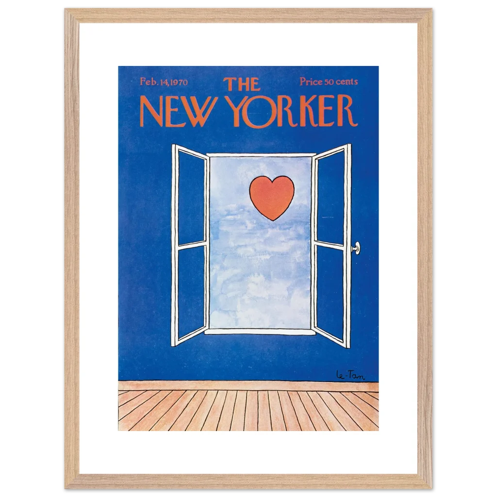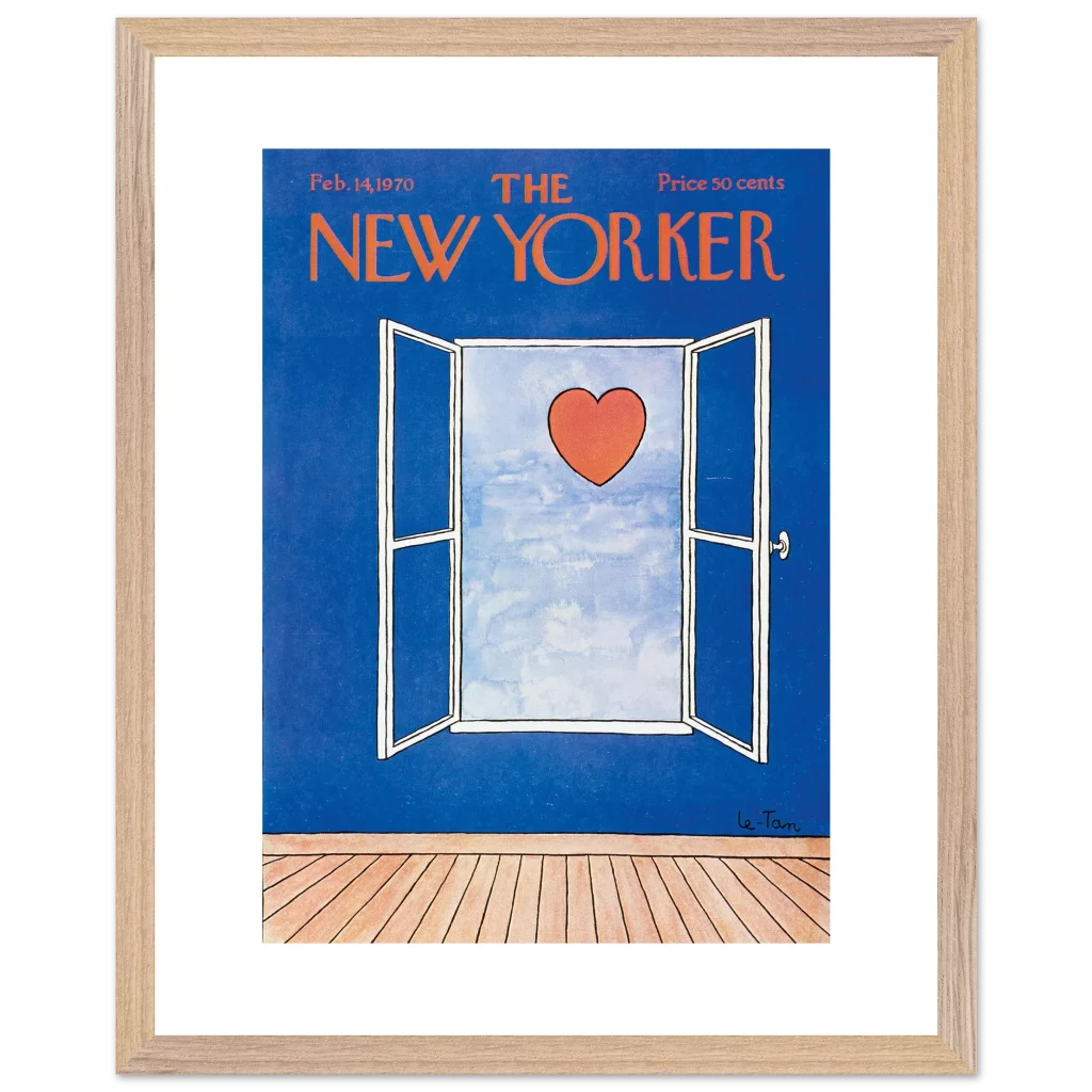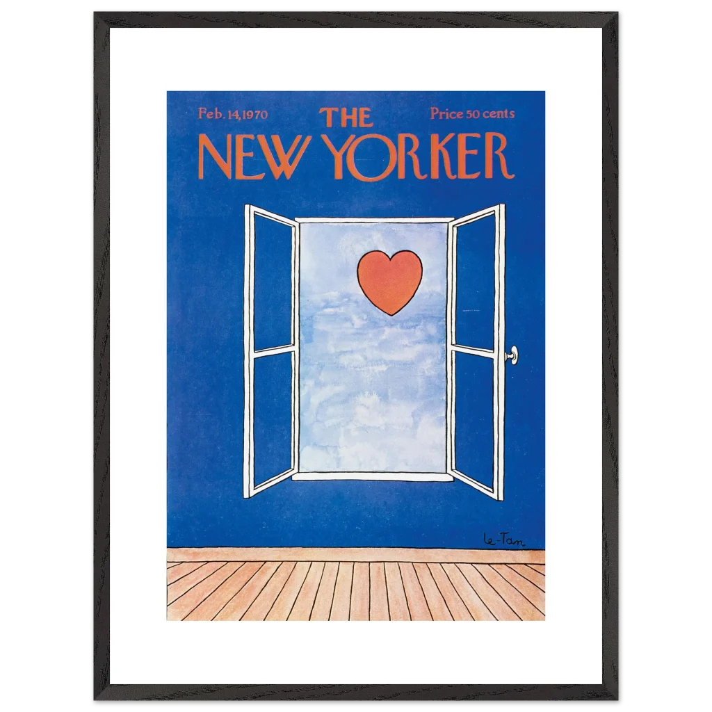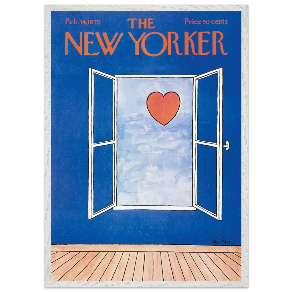 Capture a timeless moment of romance with this iconic New Yorker cover art, ‘Love Beyond the Window’ from February 14, 1970. This charming illustration, featuring a vibrant red heart set against a serene sky viewed through an open window, brings a touch of classic sophistication and heartfelt nostalgia to any space. It’s perfect for art lovers and those who appreciate iconic design and a subtle declaration of love.
