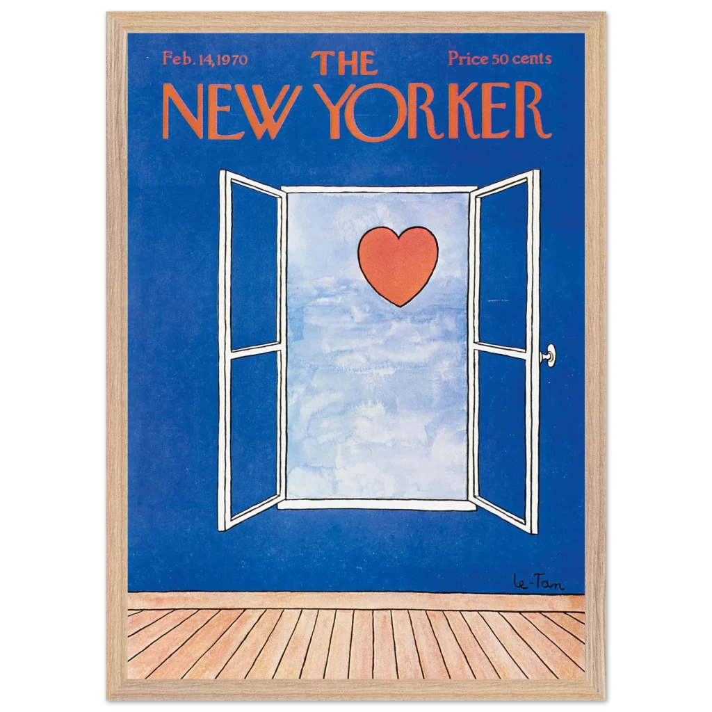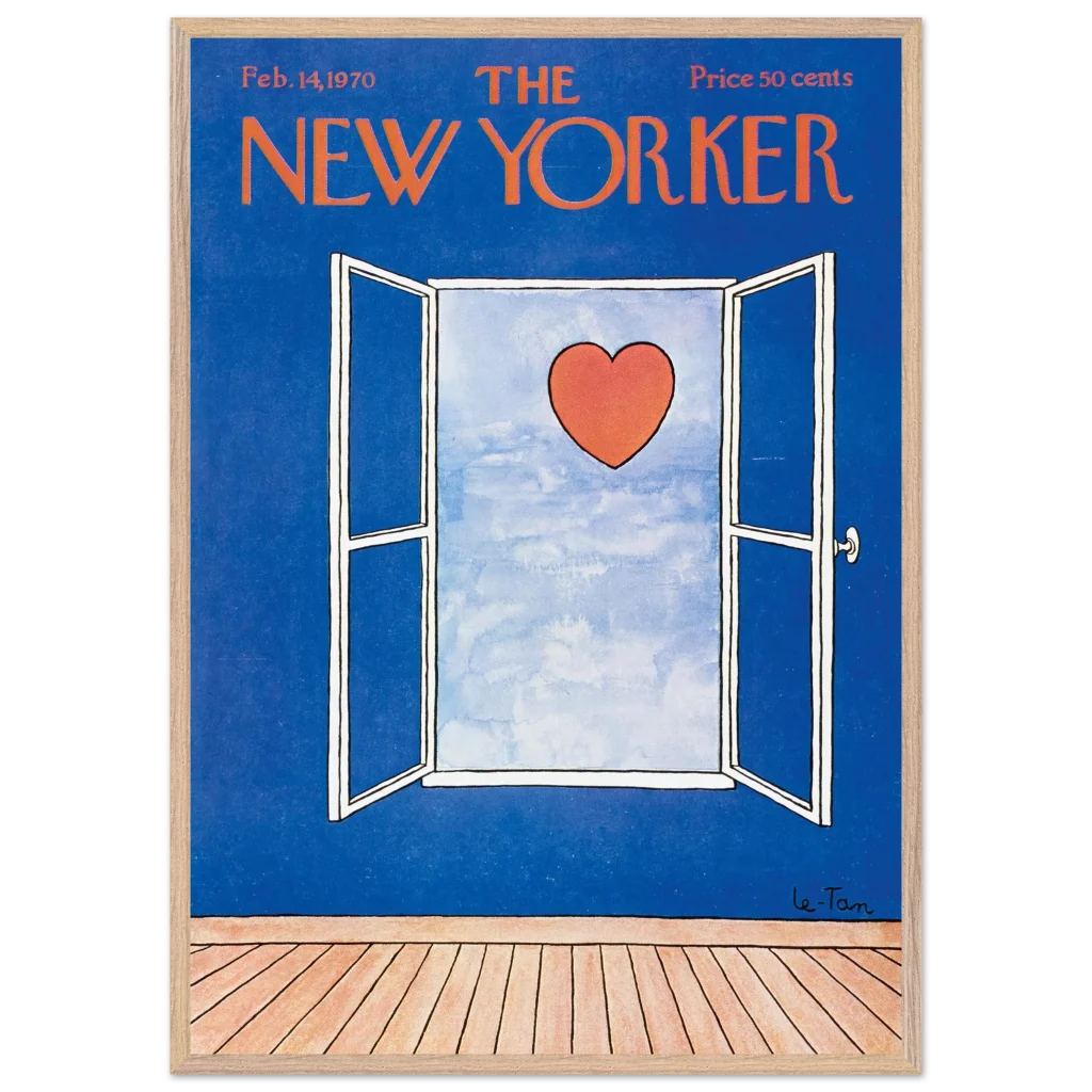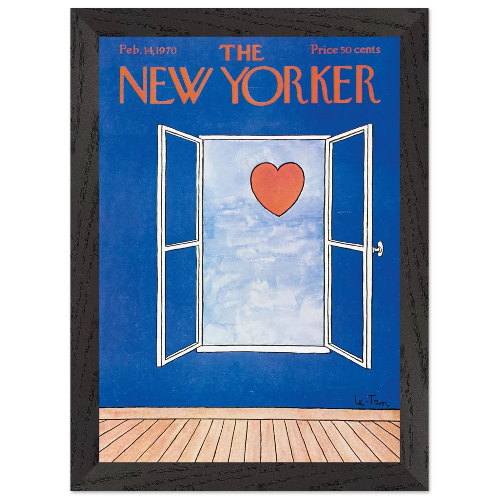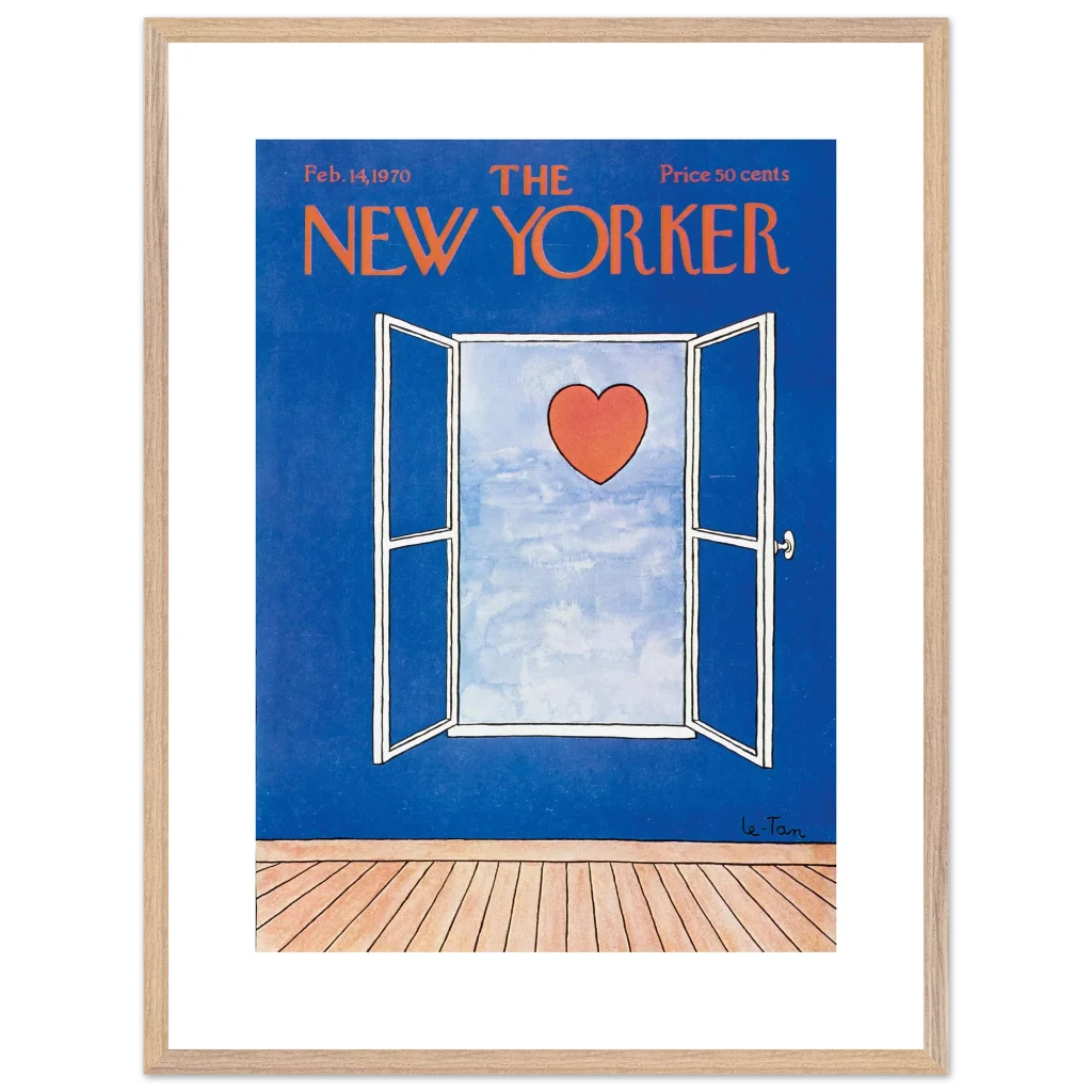 Capture a timeless moment of romance with this iconic New Yorker cover art, ‘Love Beyond the Window’ from February 14, 1970. This charming illustration, featuring a vibrant red heart set against a serene sky viewed through an open window, brings a touch of classic sophistication and heartfelt nostalgia to any space. It’s perfect for art lovers and those who appreciate iconic design and a subtle declaration of love.